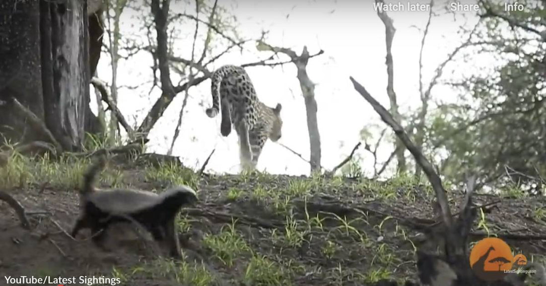 In a stunning video caught in the wilds of South Africa, a female leopard can be seen toying with a honey badger cub it had just pounced on before, out of seemingly nowhere, a heroic mama badger comes sailing across the screen from the left in what was a "launch" attack that sent the shocked leopard running for cover.