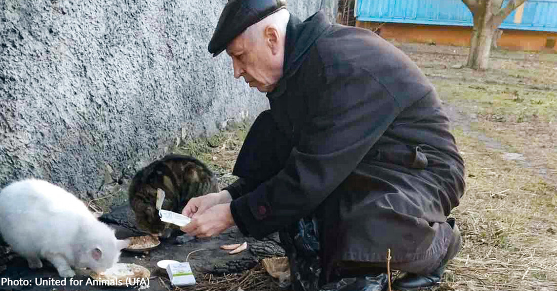 Every morning, an elderly man named Valeriy rises with the sun to feed the homeless pets of Ukraine. He is wandering the streets before most people are awake and is greeted by hungry dogs and cats.