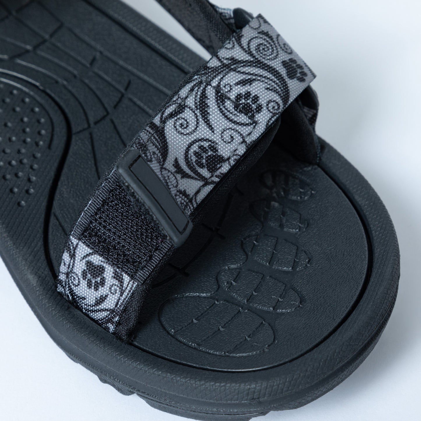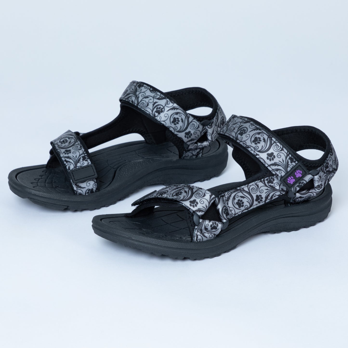 You already have paw prints on your heart, and now you proudly wear them down to your toes! Bright, woven straps keep your feet securely in place in this rugged pair. The straps are easily adjustable with a heel cushion for comfort and two purple paws on the end of the Velcro tab -- further displaying your animal affection!