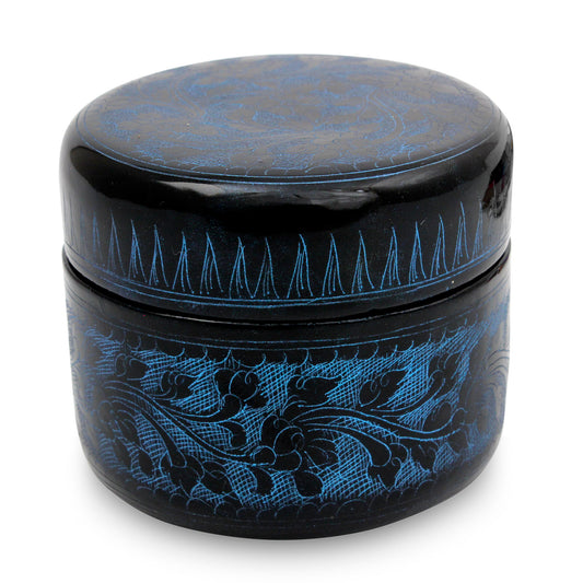 Exotic Blue Flora Round Decorative Box Handcrafted Lacquered Wood