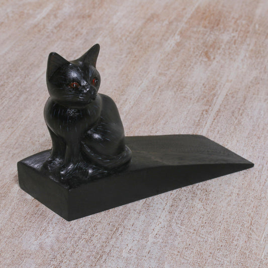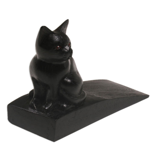 Black Catnap Balinese Signed Hand-Carved Sleeping Black Cat Sculpture