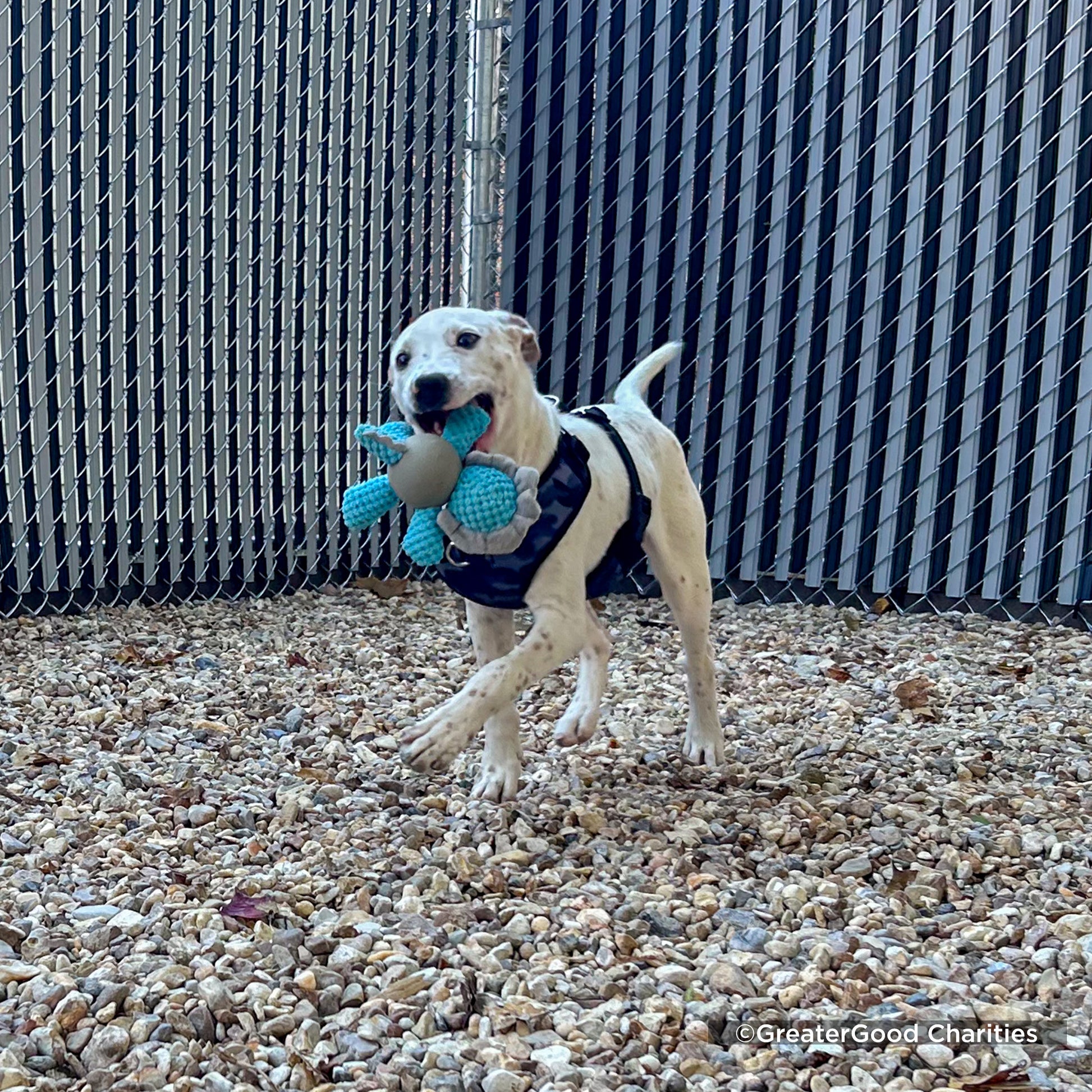Biggie went to Souixland Animal Rescue and became a polite, socialized dog. He loved playing with his toys in playgroups with other dogs and had lots of time with humans to help be a friendly boy. He is now adopted and his owners love him very much.