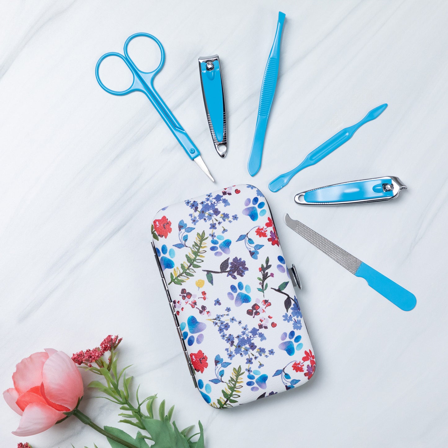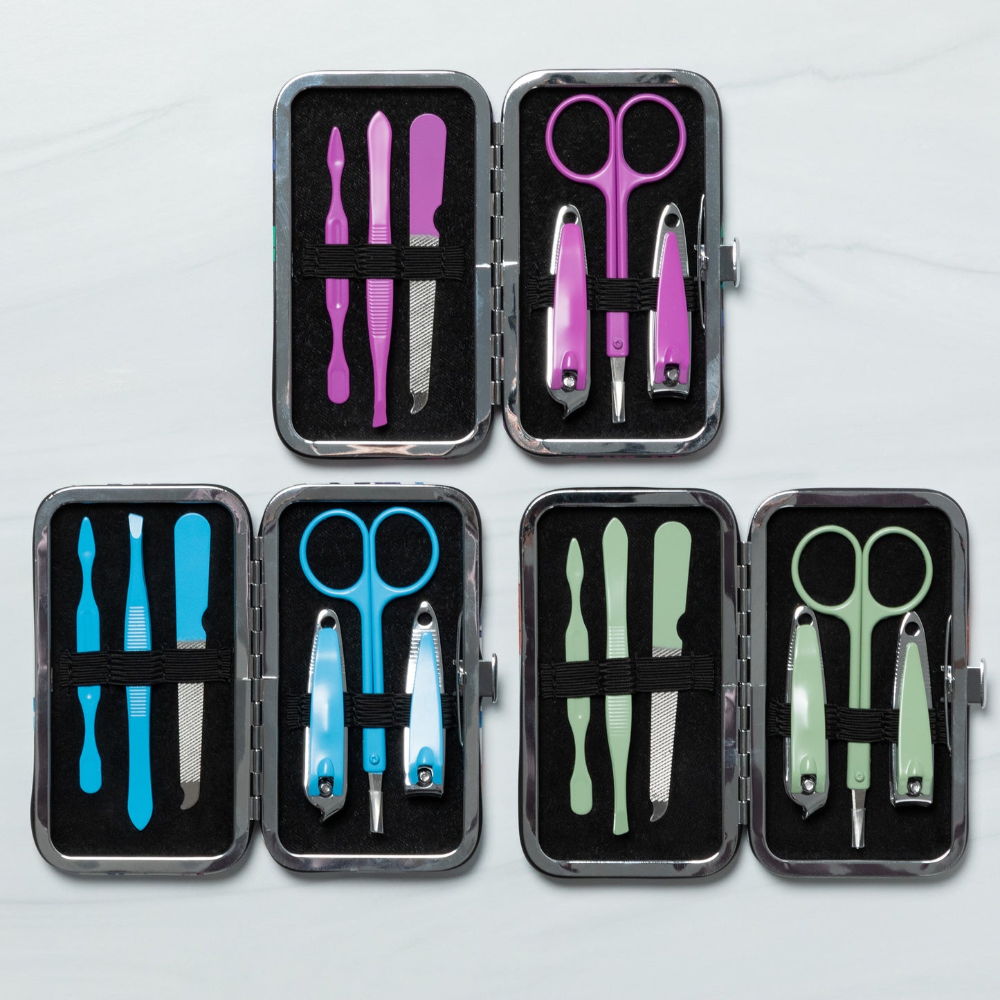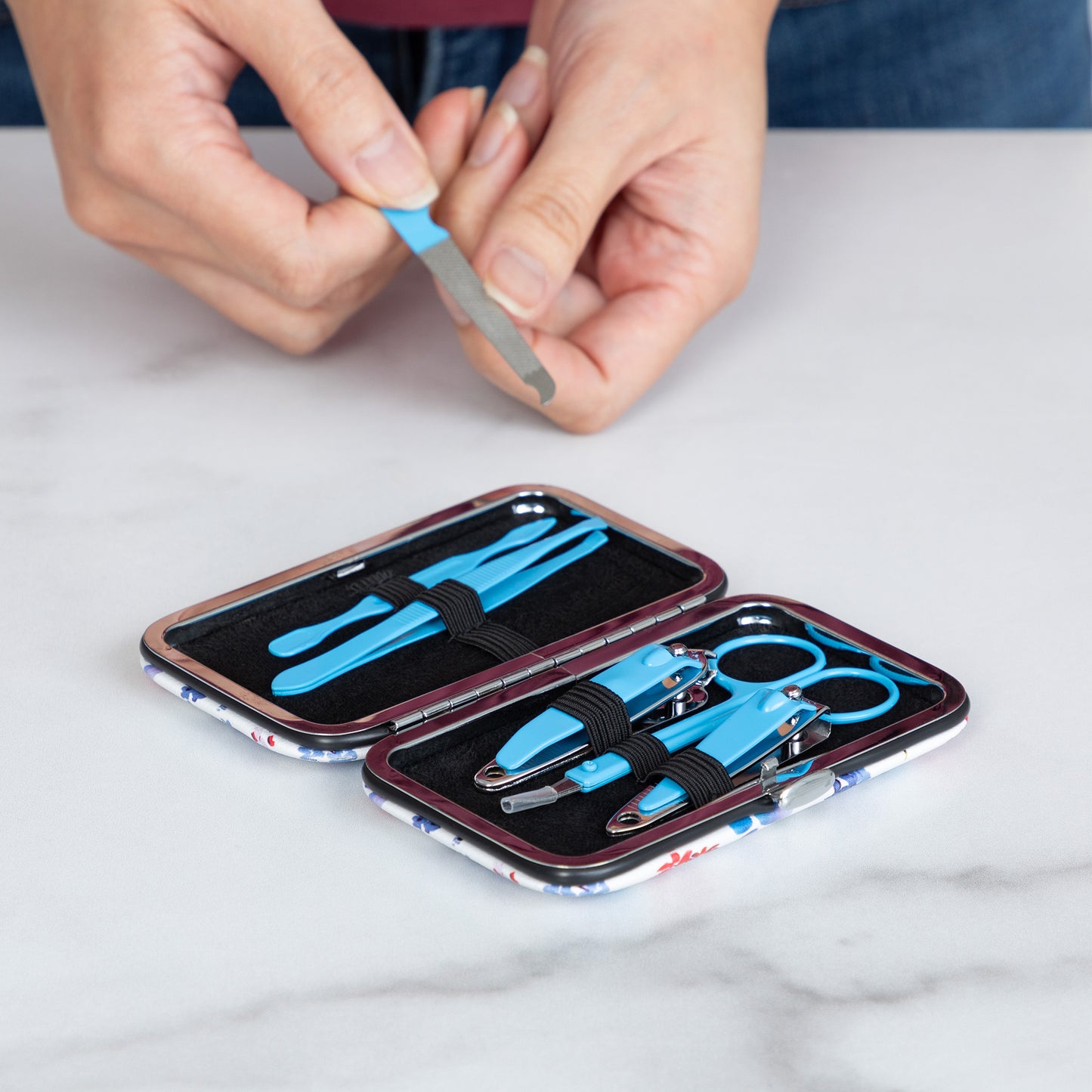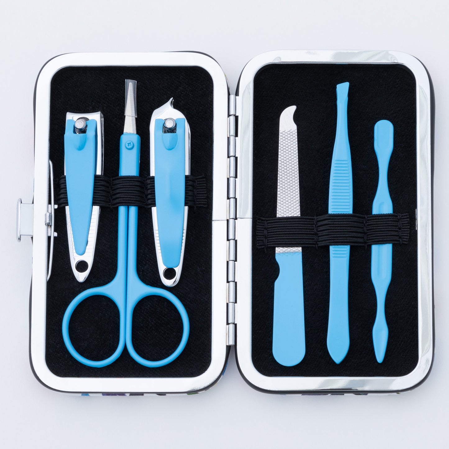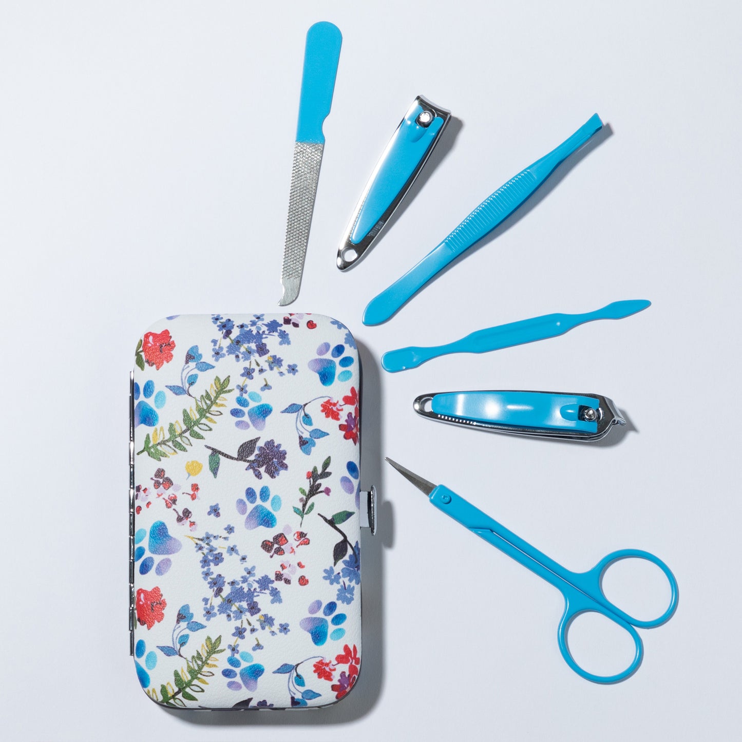 Tucked into your purse or weekend duffel bag, this travel manicure set features a colorful design on a faux leather case! Complete with an array of essential nail care tools, this manicure set includes nail clippers, nail scissors, tweezers, a file, and a cuticle pusher to handle anything that comes your way.
