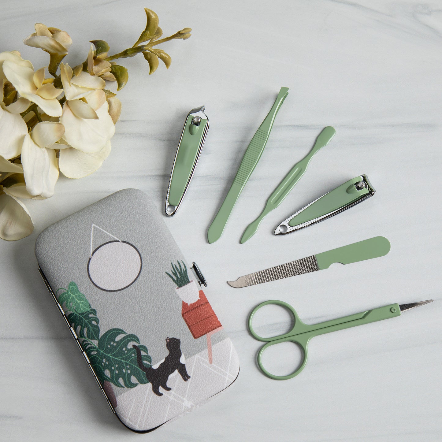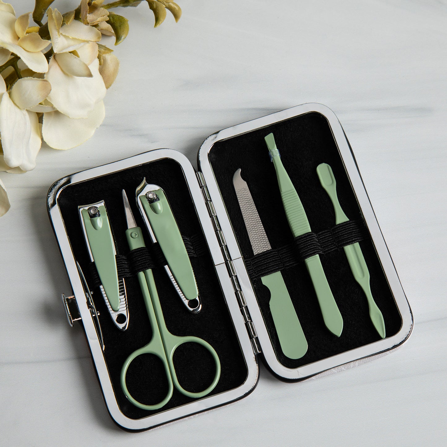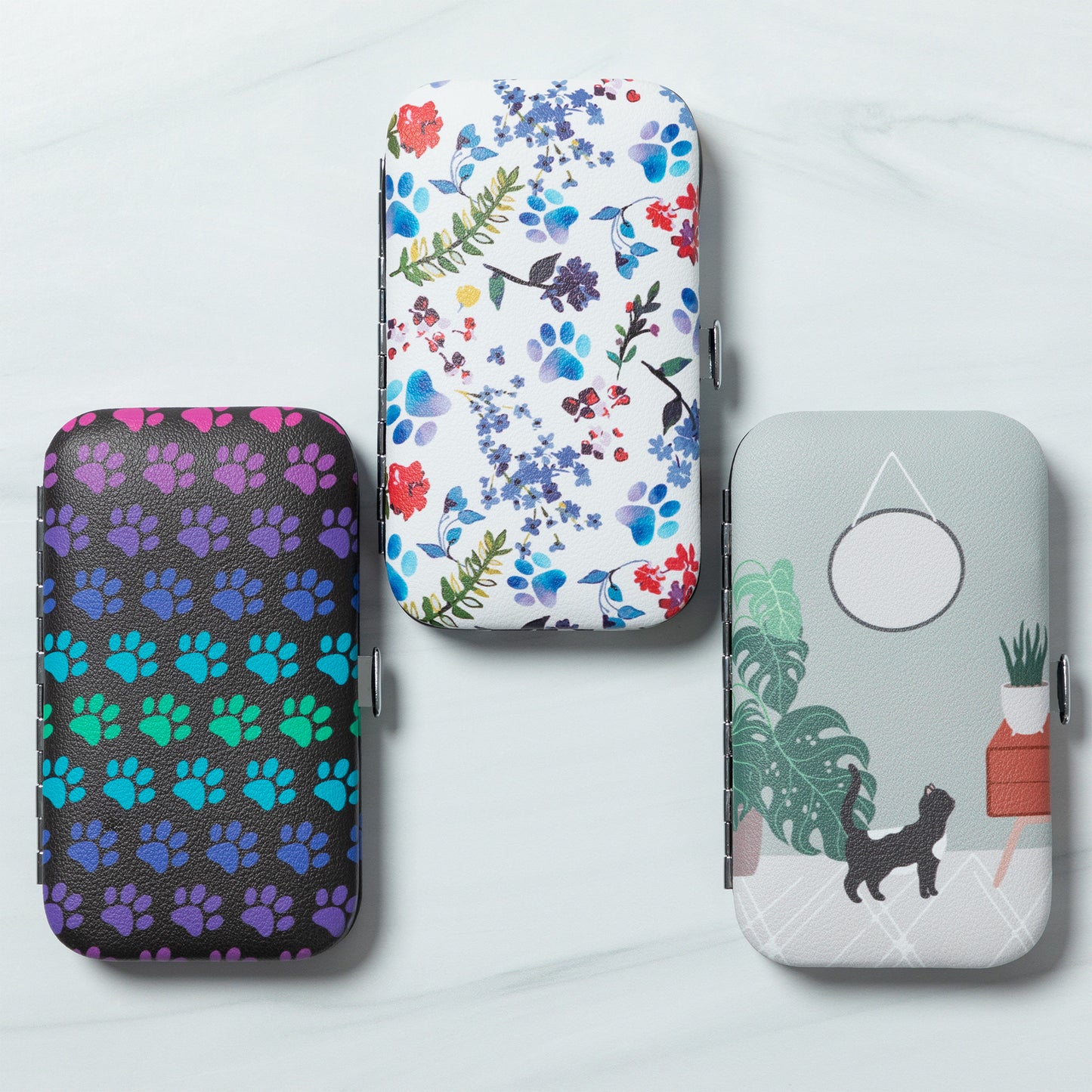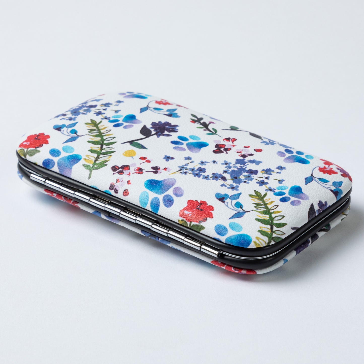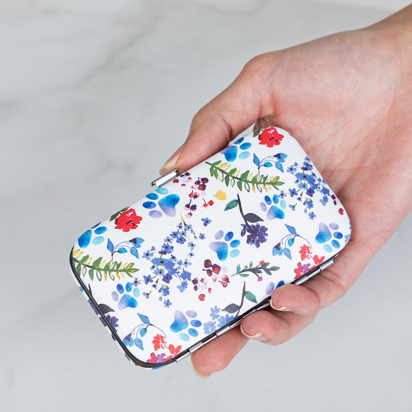 Tucked into your purse or weekend duffel bag, this travel manicure set features a colorful design on a faux leather case! Complete with an array of essential nail care tools, this manicure set includes nail clippers, nail scissors, tweezers, a file, and a cuticle pusher to handle anything that comes your way.