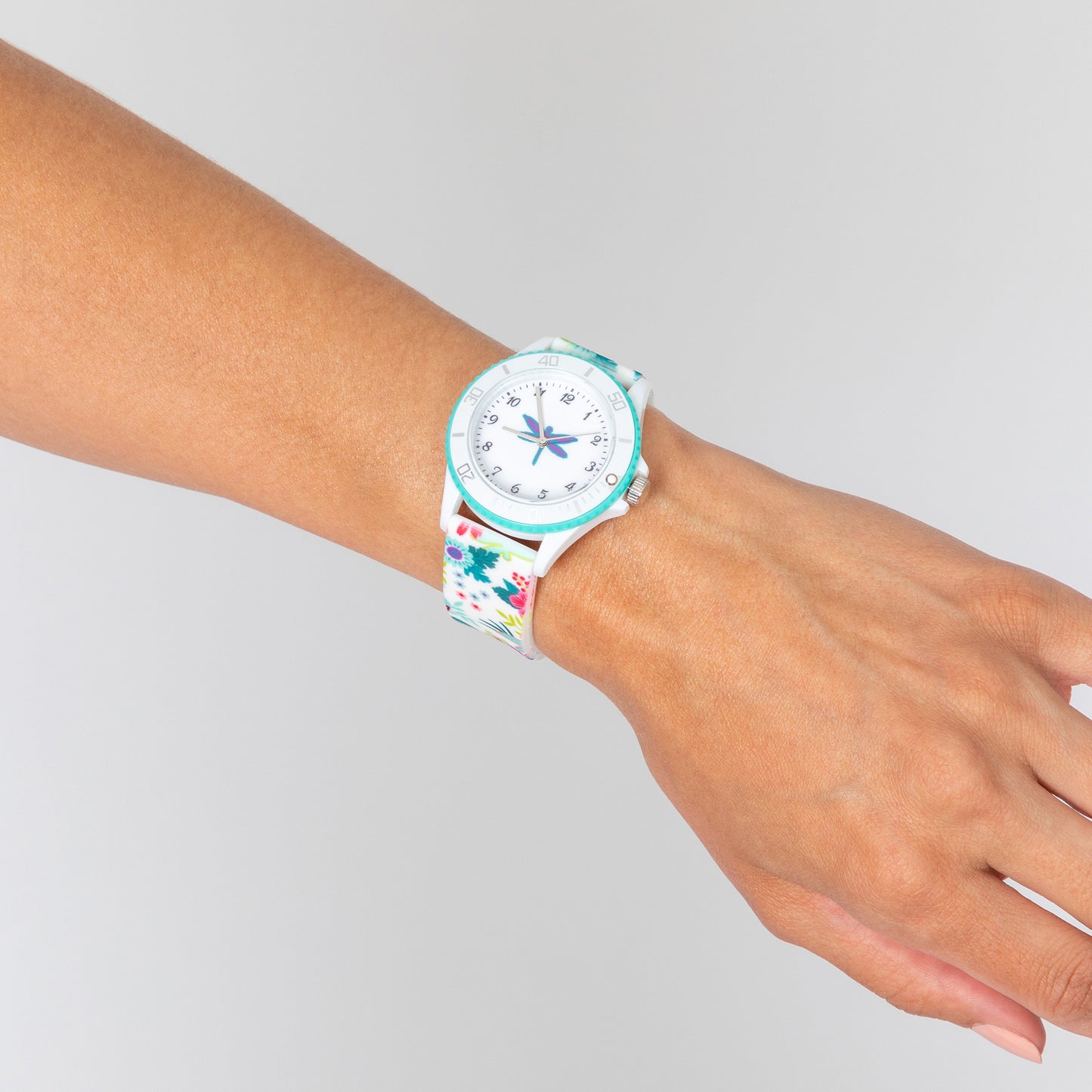Every glance at your watch brings colorful, tropical images to mind with this rainbow colored timepiece! Patterned in a dragonfly and floral design on the soft white silicone wristband, this watch features a dragonfly at the center of its face, adding beauty and serenity to your scheduled day.