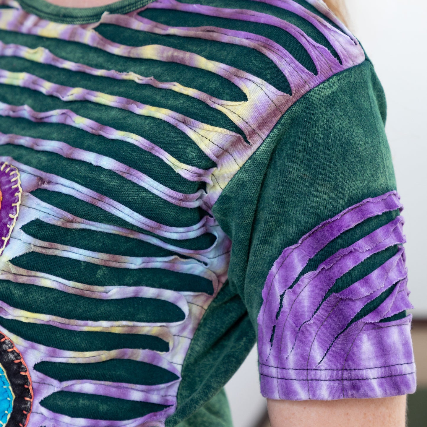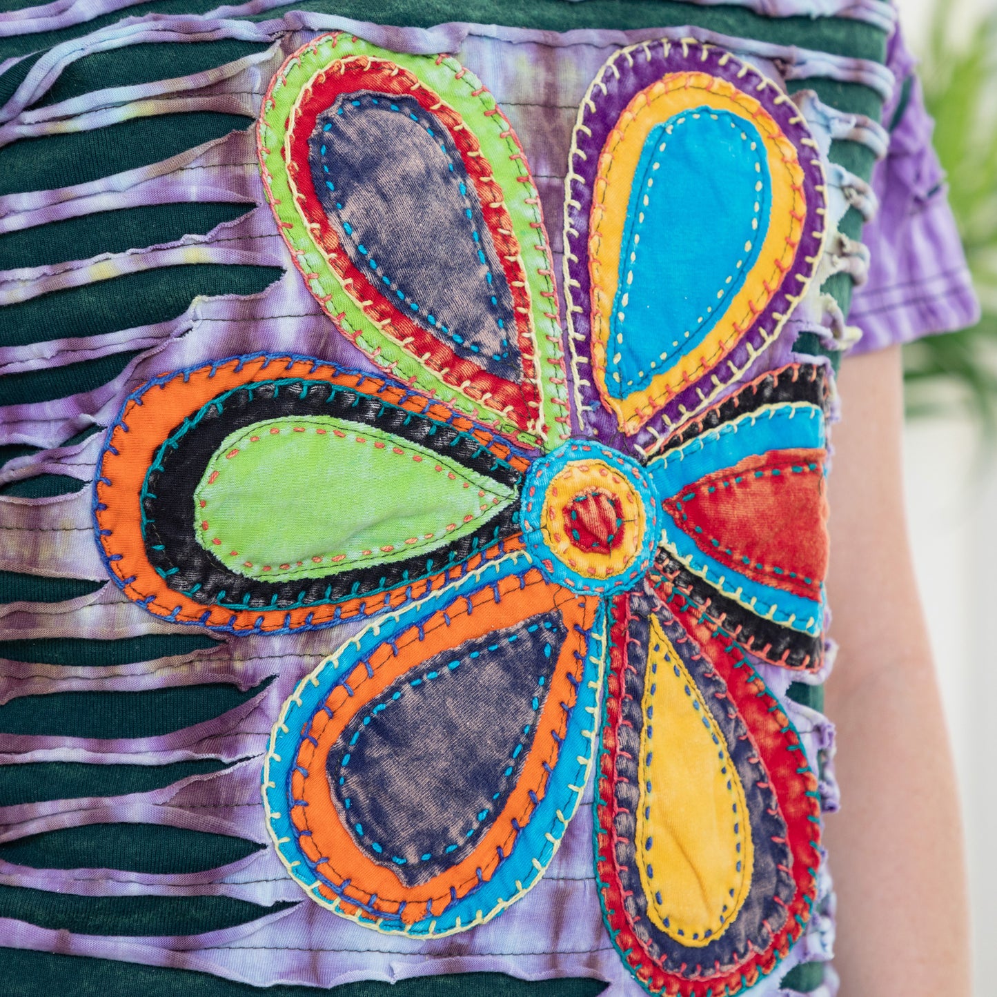 Elevate your wardrobe with our stunning short sleeve shirt, meticulously crafted in Nepal with care and expertise. Adorned with a vibrant embroidered flower and intricate razor cut fabric throughout the front, this shirt is a masterpiece of artisanal fashion. Experience the allure of handcrafted luxury and make a statement wherever you go.