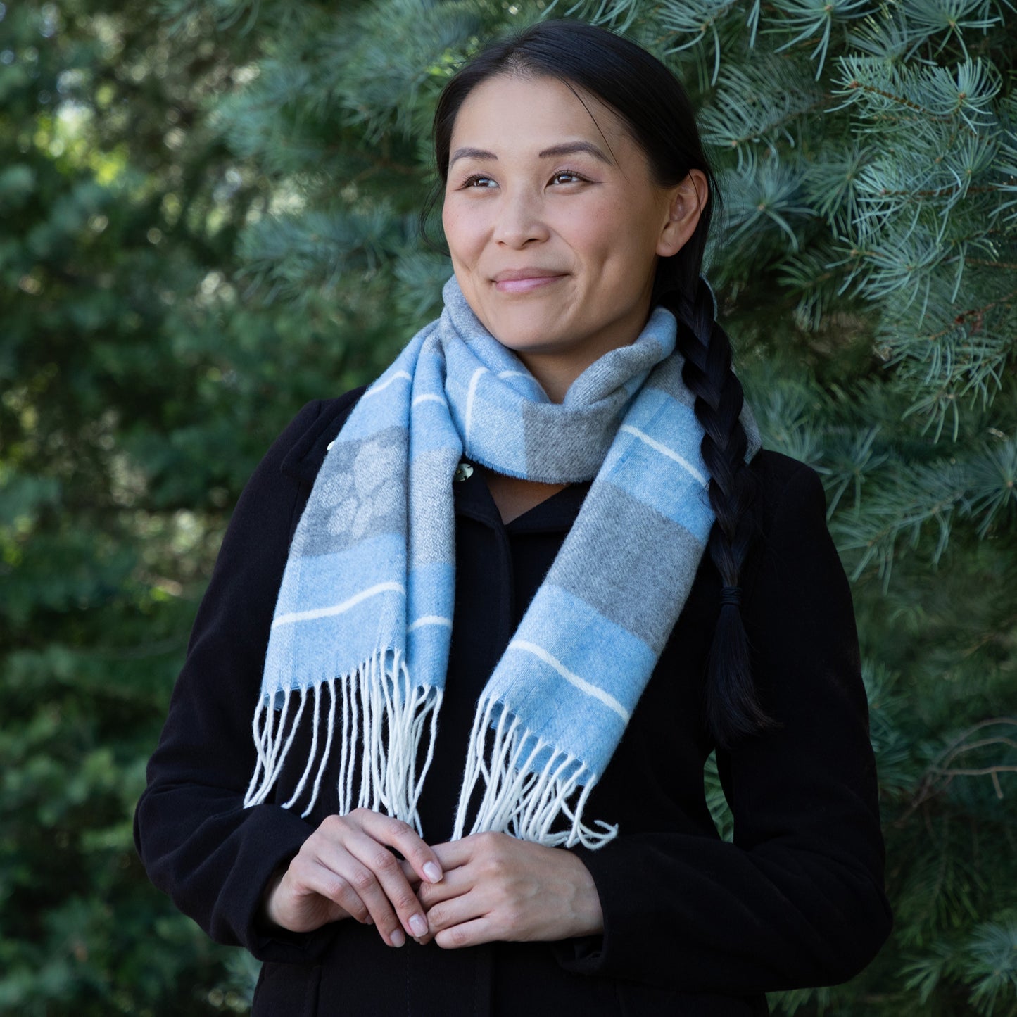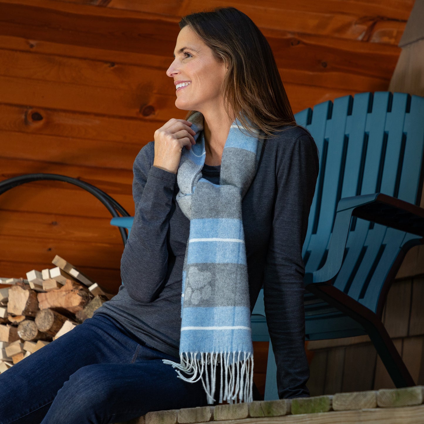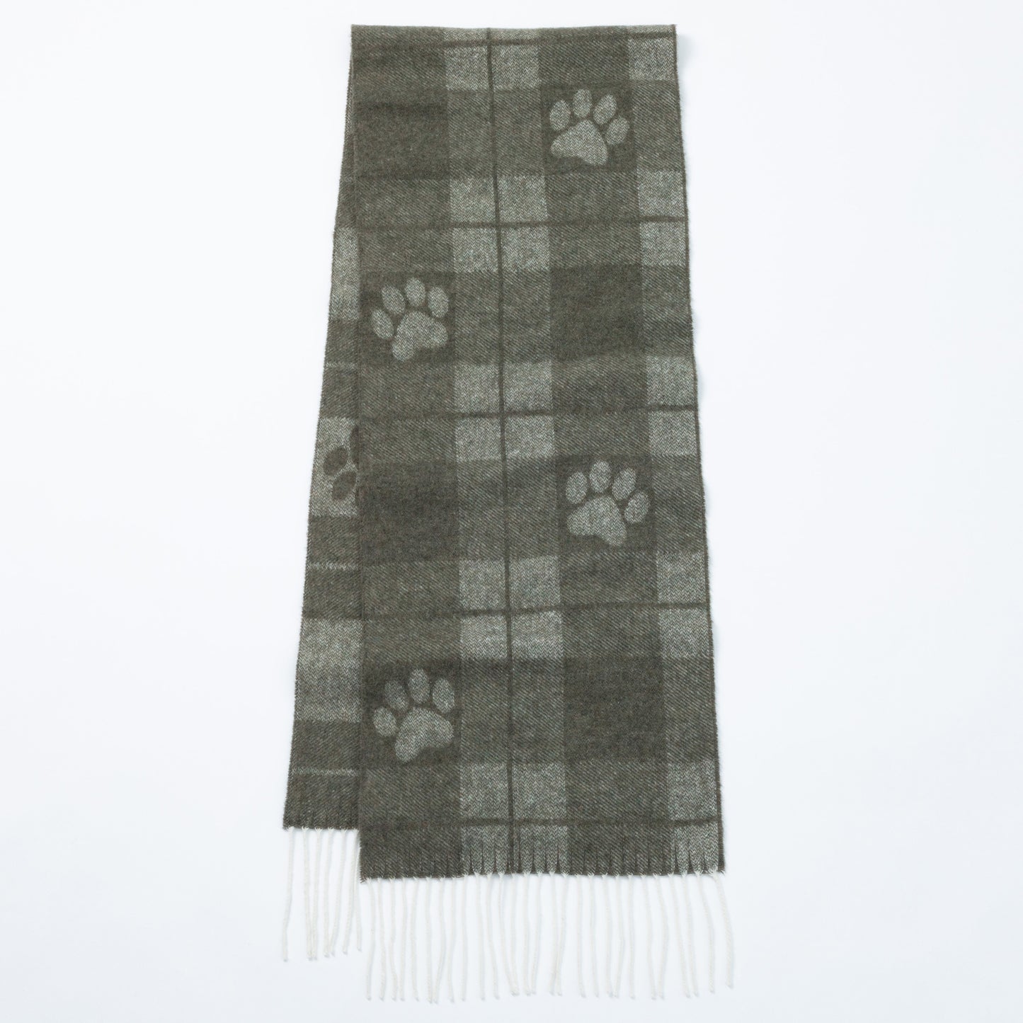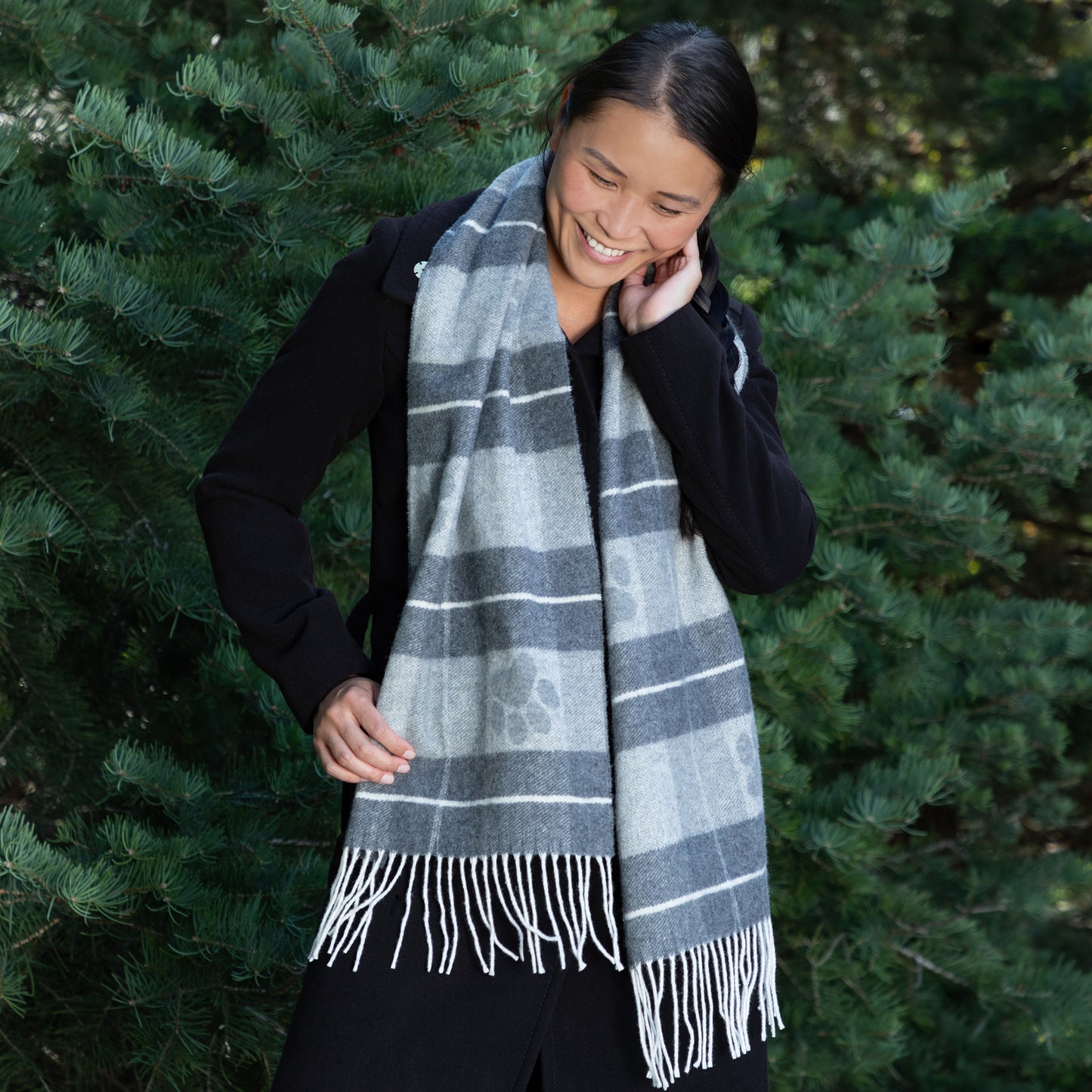 A brilliantly soft merino wool and cashmere blend that provides comfort and warmth for everyday use, this blanket scarf is a cozy, cold weather essential. Woven with an array of versatile colors in a classic plaid design with paw prints and soft fringed edges, this shawl provides a look that will never go out of style.