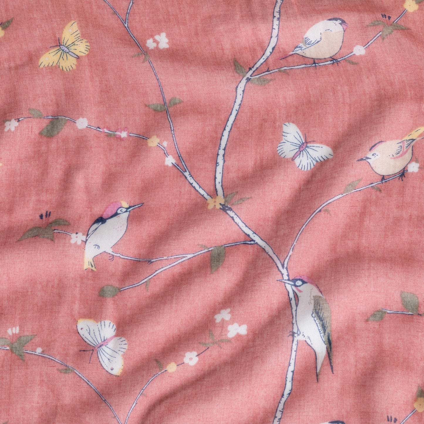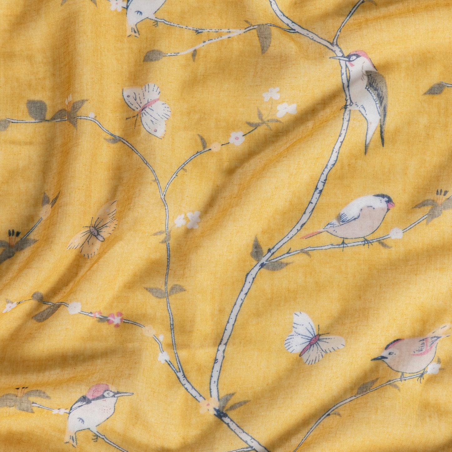 This lightweight scarf is adorned with the beauty of nature. Delicate birds perched on branches and graceful butterflies dance across the fabric in a lovely display of intricate detail. This scarf is a charming accessory that brings a touch of elegance to any outfit, evoking the serenity of a springtime garden.