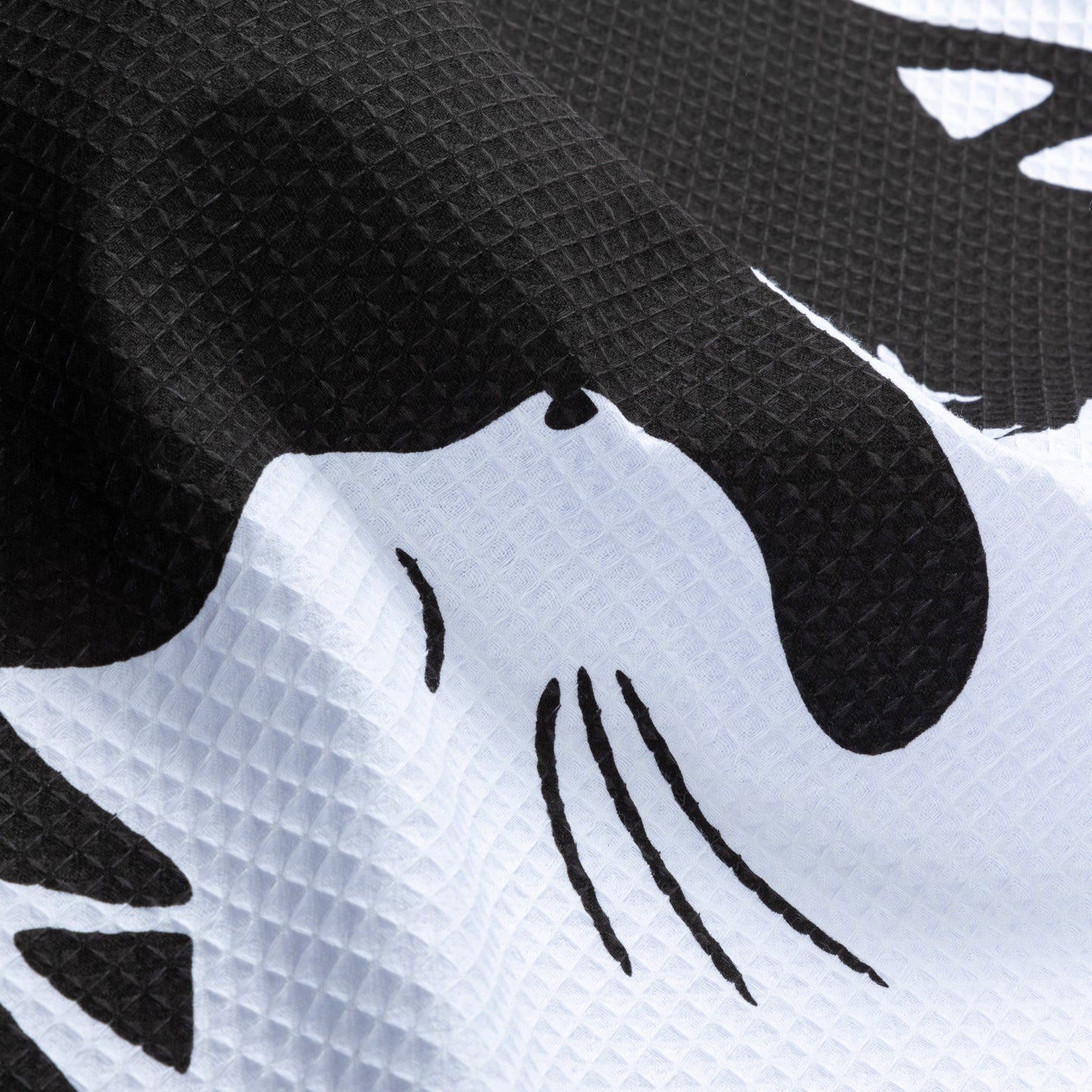I have the mug and the bowl cozies in this pattern and love them. Disappointed in the towels though. The colors ran the very first time I washed them. And yes, it was in cold water (which is a little weird for kitchen towels in the first place.) Not only did the color run onto the white, but the dye lifted from the black side. It was almost like the dye was painted on. Very sad about the whole thing. won't be buying any more dish towels from this site.