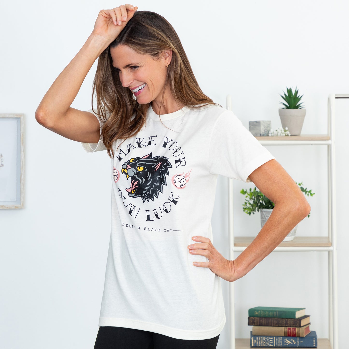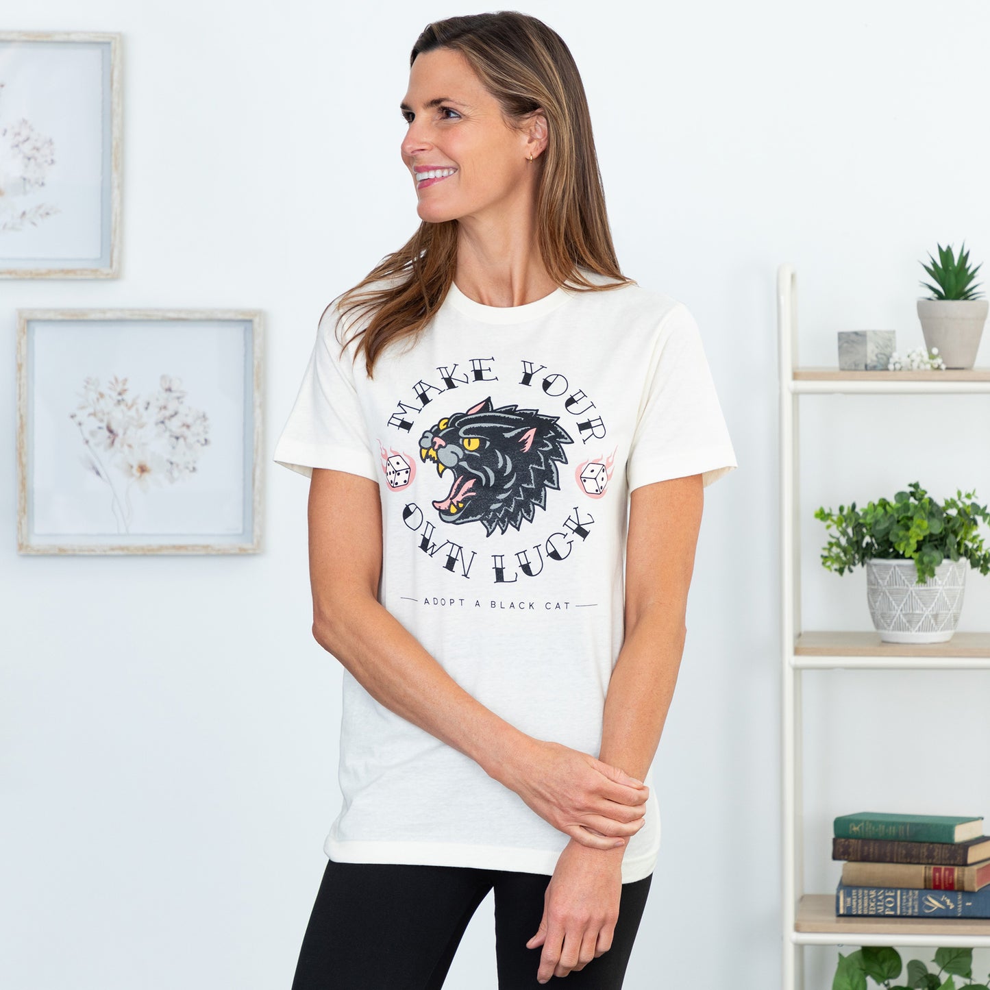 A fun and quirky shirt, promoting both the power of creating your own destiny and black cat adoption. Perfect for animal lovers, adoption advocates, and anyone who loves a stylish tee with a meaningful cause. Wear it casually with jeans or dress it up under a blazer, this shirt not only makes a fashion statement but also sparks conversations about the joys and good fortune that comes with having a black cat!