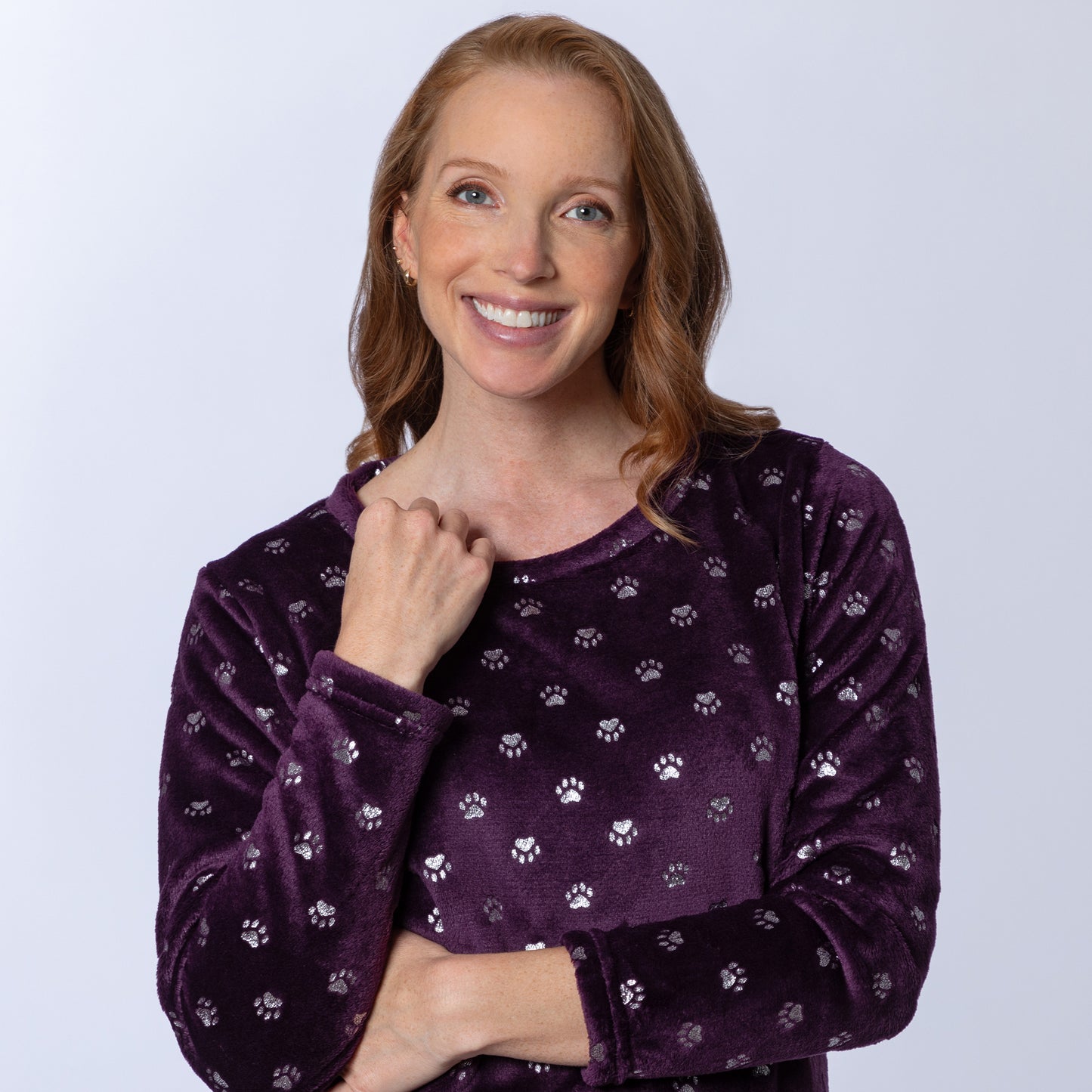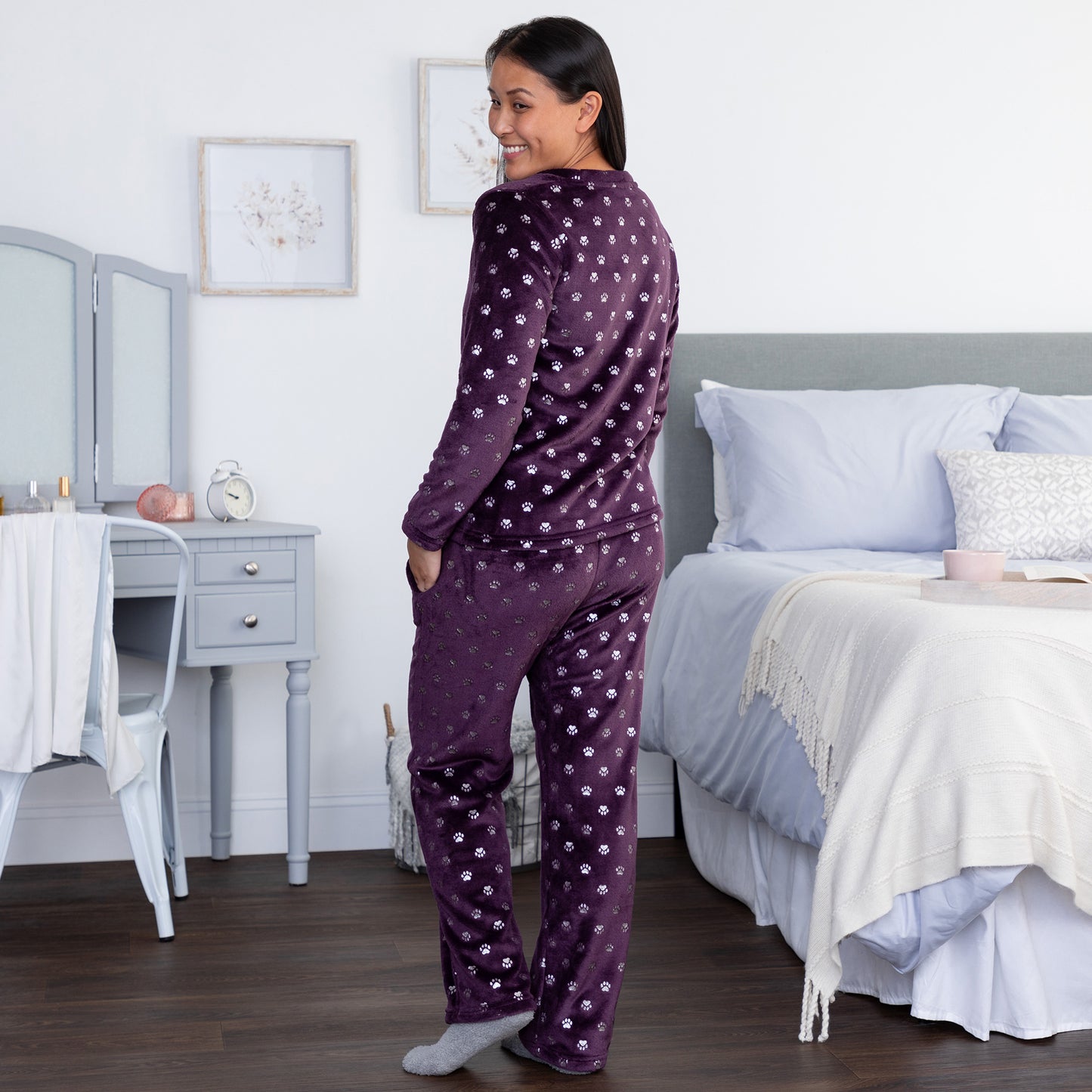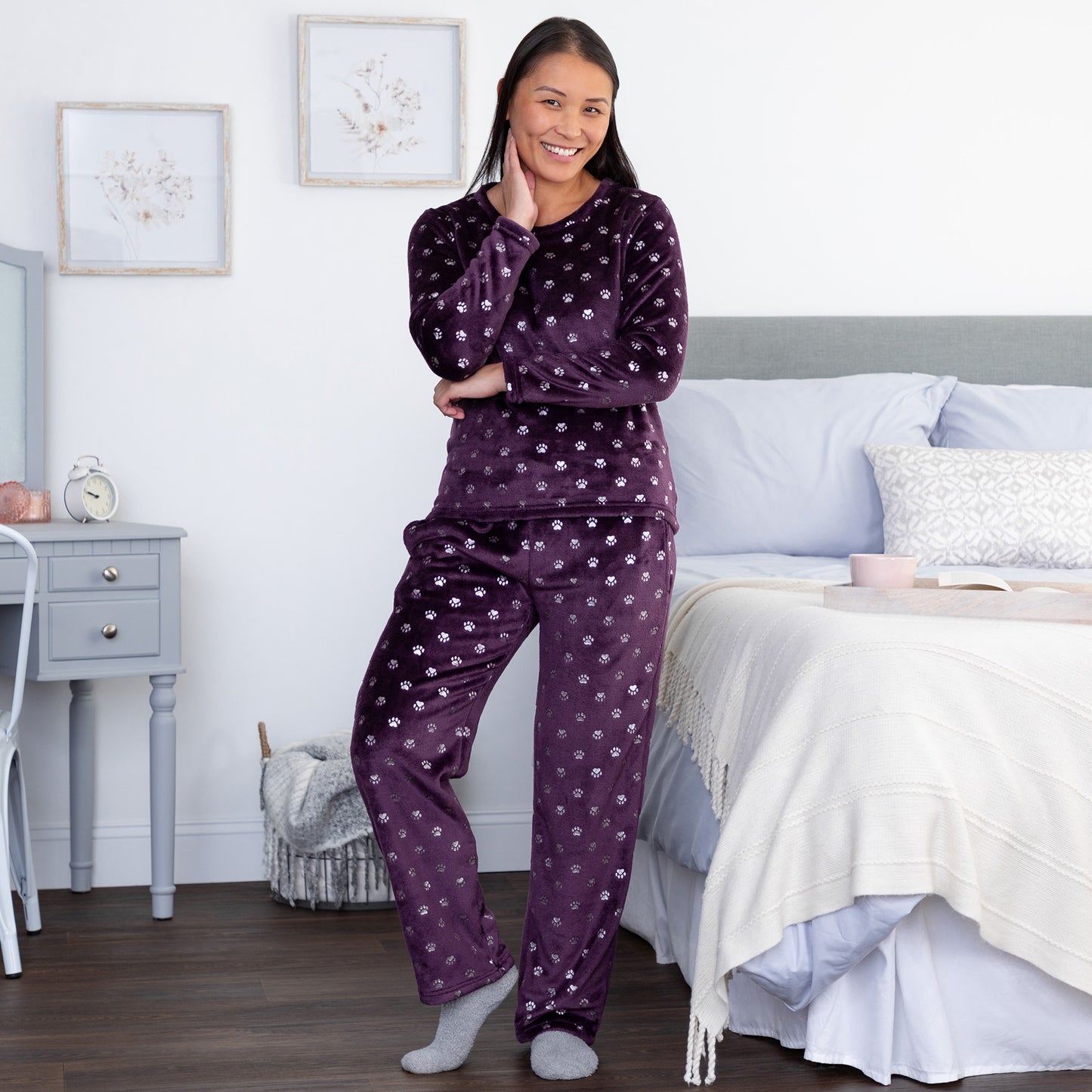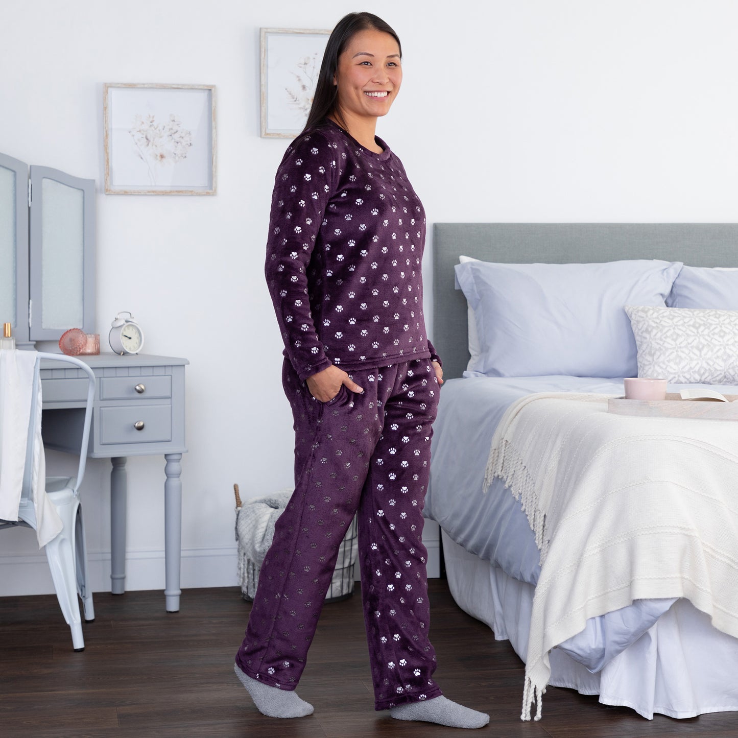 Wrap yourself in luxurious comfort with this ultra-soft pajama set, made from plush fleece for a cozy feel. The rich fleece fabric is beautifully adorned with shimmering silver or gold paw prints, adding a touch of elegance to your loungewear. Featuring a drawstring waist and convenient pockets, these pajamas offer both style and functionality, perfect for relaxing at home in warmth and comfort.