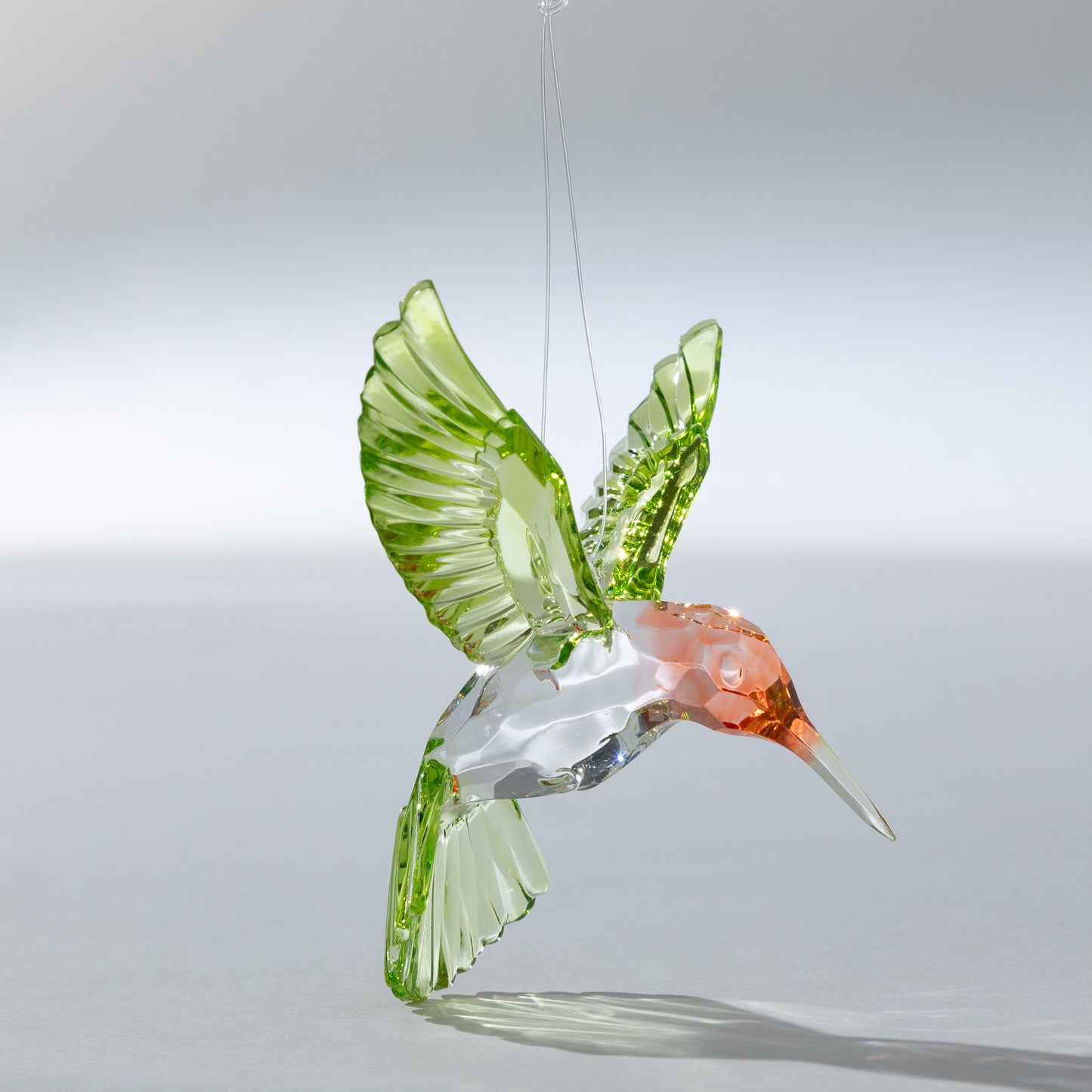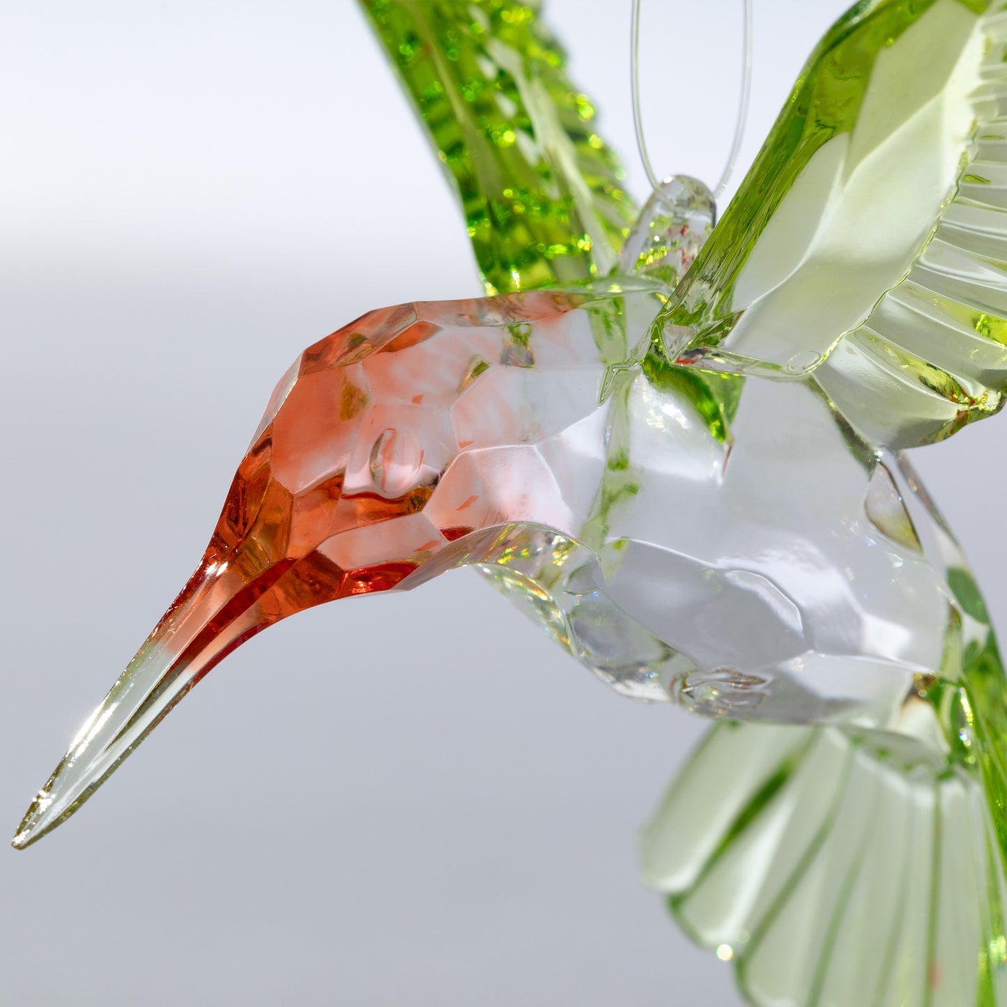 Delight in the delicate beauty of this Hummingbird Ornament, masterfully crafted from durable acrylic with the appearance of clear glass. Featuring vibrant green wings and tail paired with a striking red head, this ornament captures the shimmering elegance of a glass sculpture without the fragility.