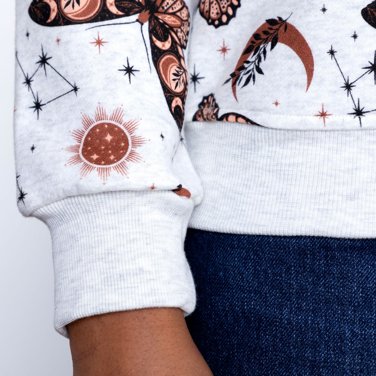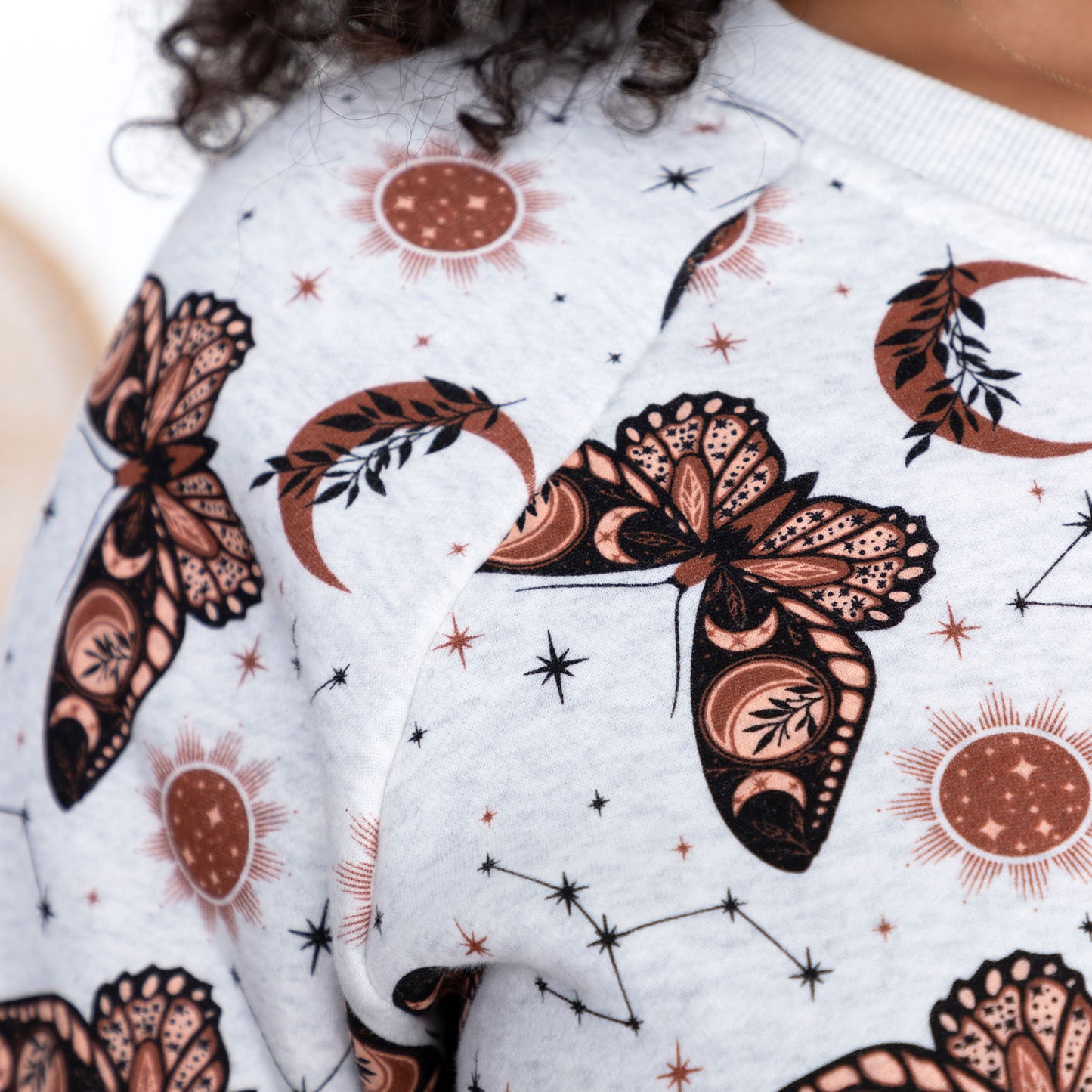 Indulge in both comfort and style with this sweatshirt. Made from plush material it's perfect for lounging or layering. Its print showcases butterflies, moons, suns, and constellations, giving it a celestial touch with a playful twist. The relaxed crewneck offers versatility for any occasion, whether it be outings or cozy nights in. Overall, it’s the ultimate pick for those who love to add some quirk and fun to their wardrobe.