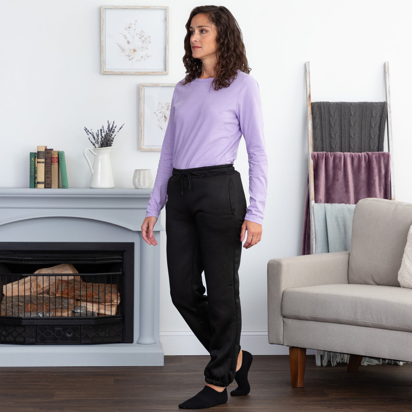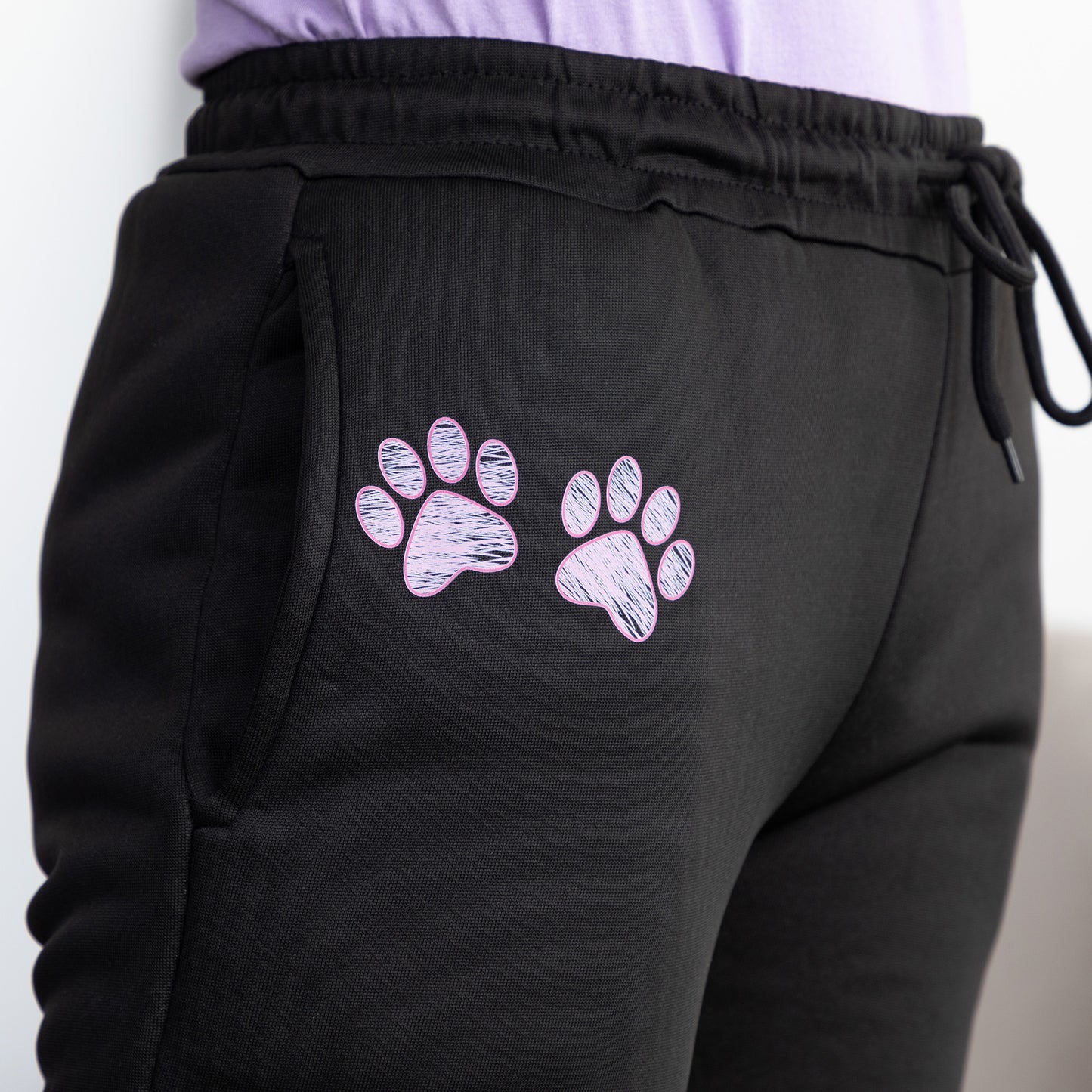 Get ready to lounge in ultimate comfort with the ultra soft, plush fleece-lined sweatpants! These sleek black pants feature an ultra-soft plush cream-colored fleece lining to keep you cozy, while the elastic drawstring waist and cuffed hem provide a snug, secure fit. With convenient side pockets and playful paw prints on the leg, these sweatpants combine warmth, style, and a touch of pet-loving charm for your go-to lounging essential.