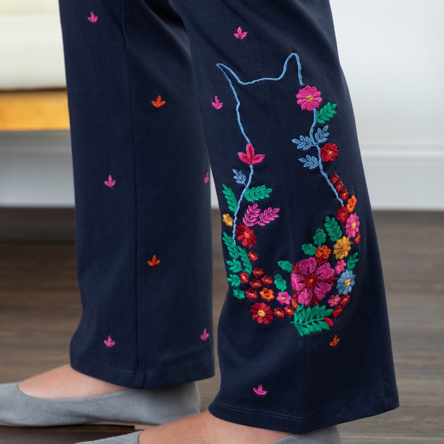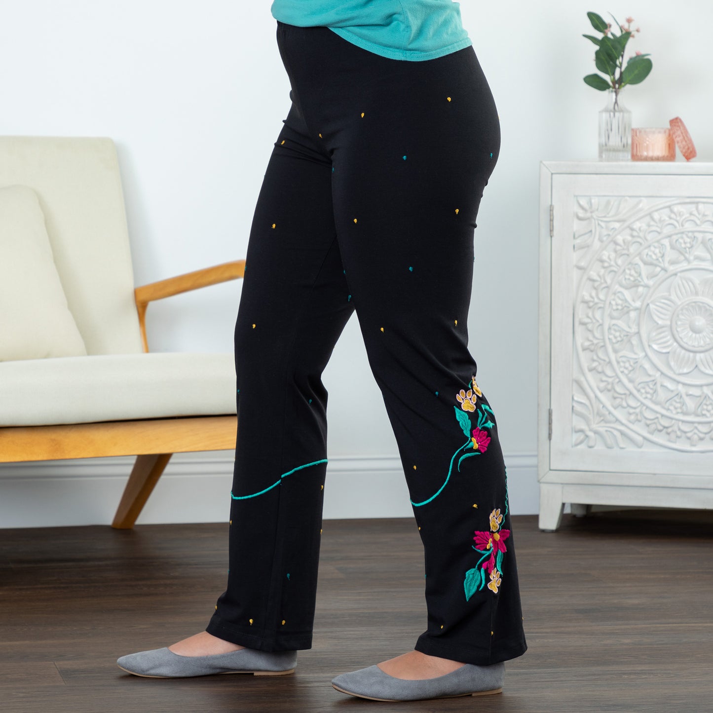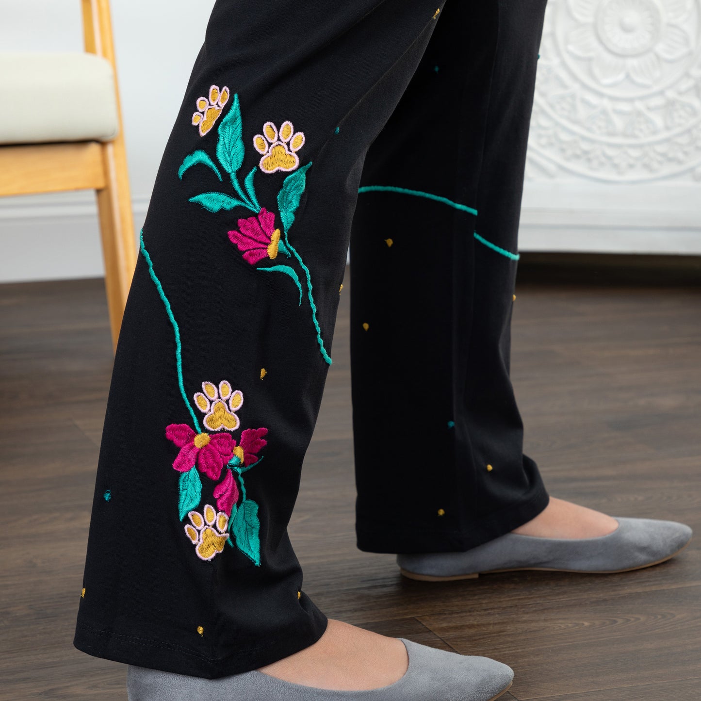 Comfortable and cute pants featuring a playful design and a flexible, flattering fit. Made with stretchy fabric for all-day comfort and perfect movement. Featuring intricate embroidery throughout and a larger design running down to the bottom of the leg, these pants exude a one-of-a-kind charm. The elastic waistband ensures a snug fit and the soft fabric is gentle on the skin. Whether you're lounging or running errands, these pants will make you look adorable and feel at ease.