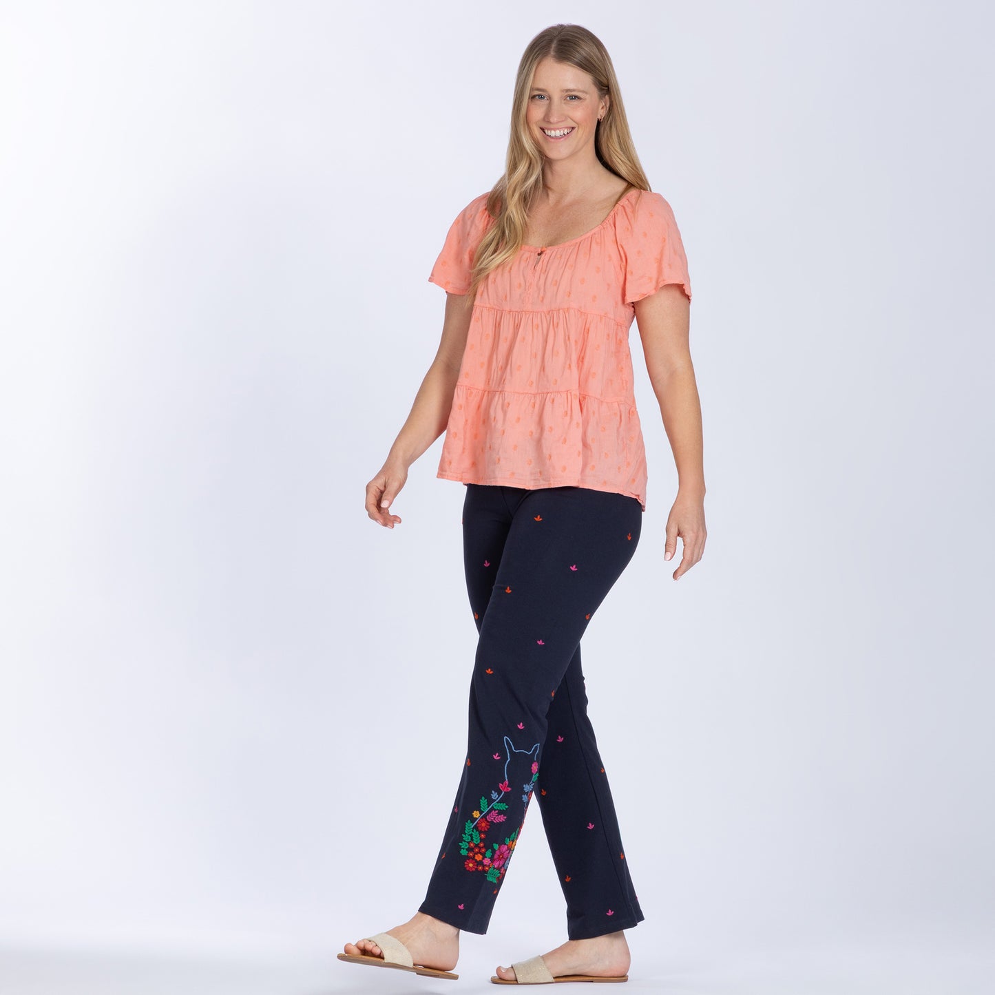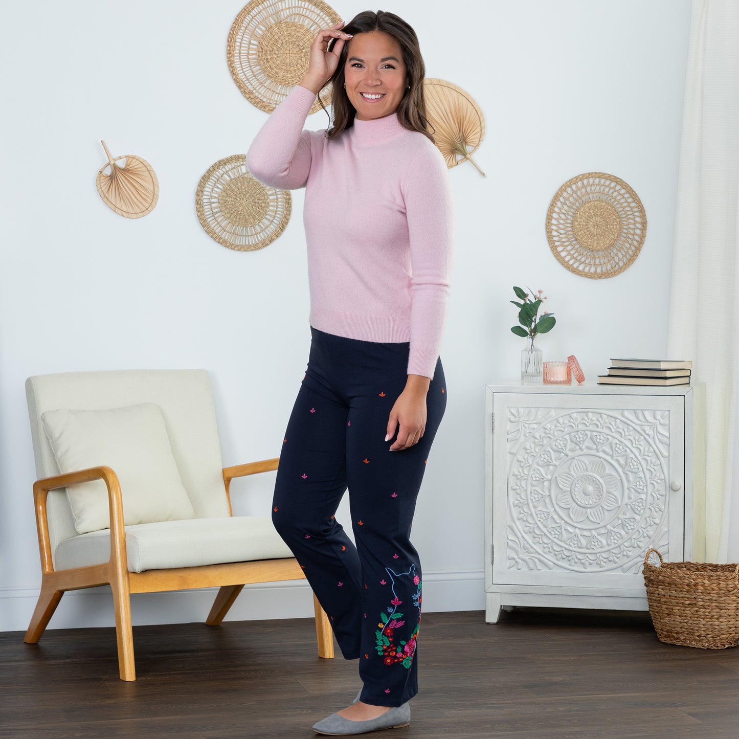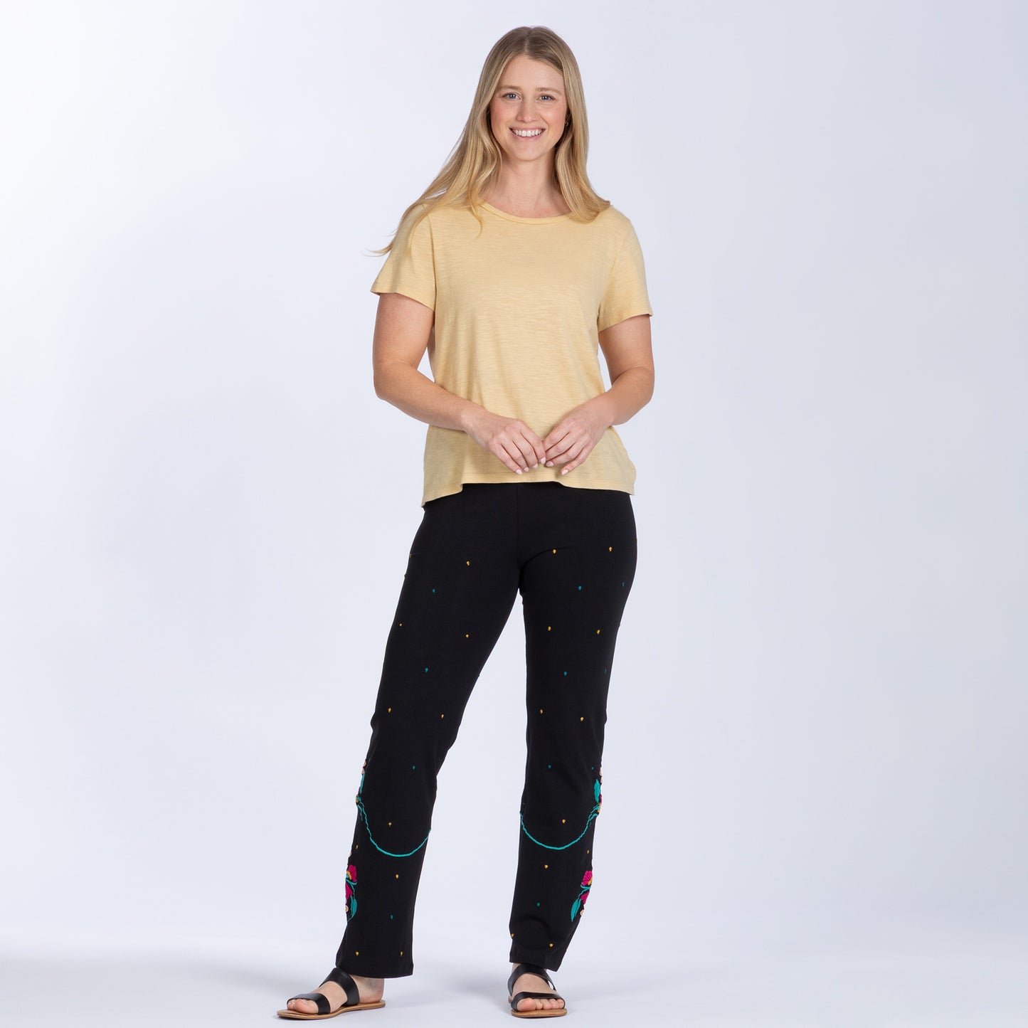 Comfortable and cute pants featuring a playful design and a flexible, flattering fit. Made with stretchy fabric for all-day comfort and perfect movement. Featuring intricate embroidery throughout and a larger design running down to the bottom of the leg, these pants exude a one-of-a-kind charm. The elastic waistband ensures a snug fit and the soft fabric is gentle on the skin. Whether you're lounging or running errands, these pants will make you look adorable and feel at ease.