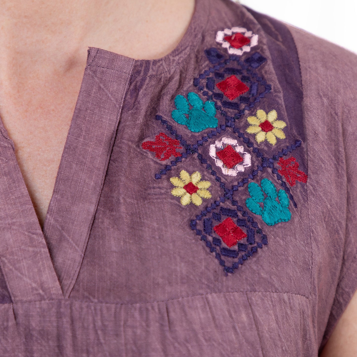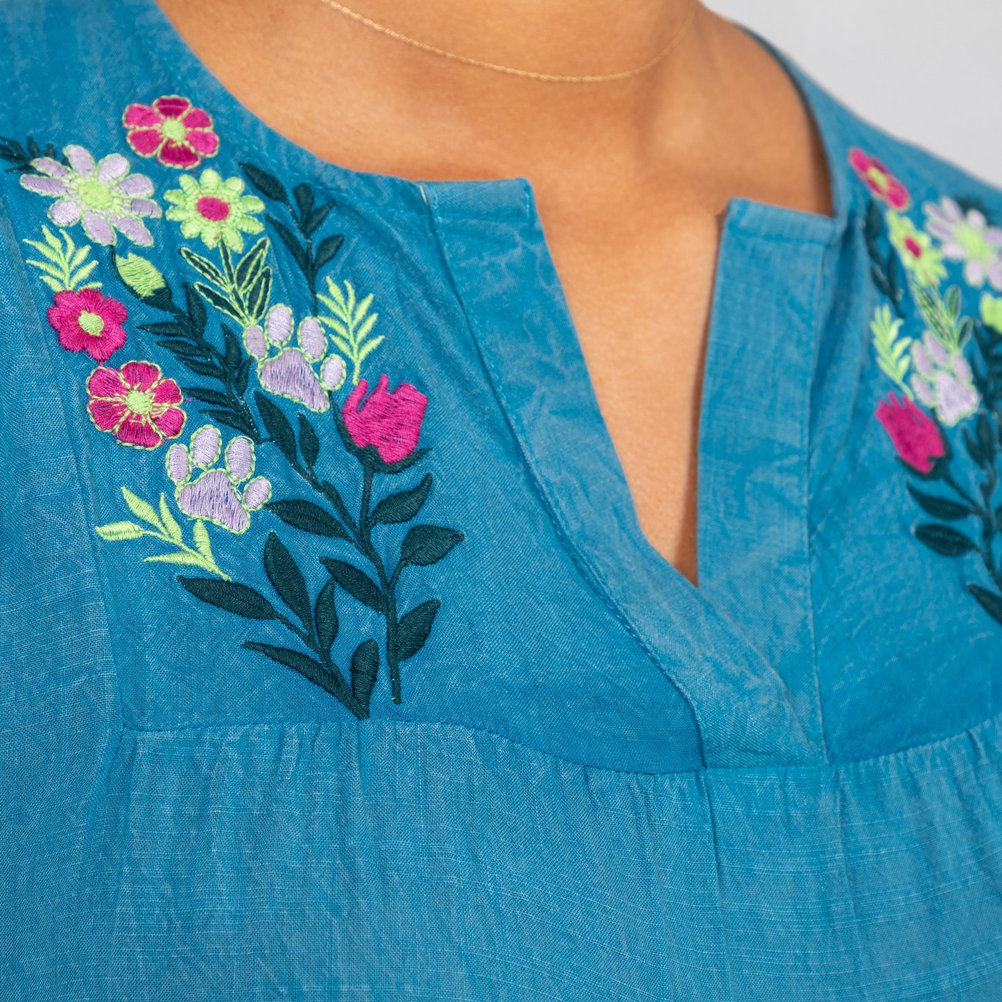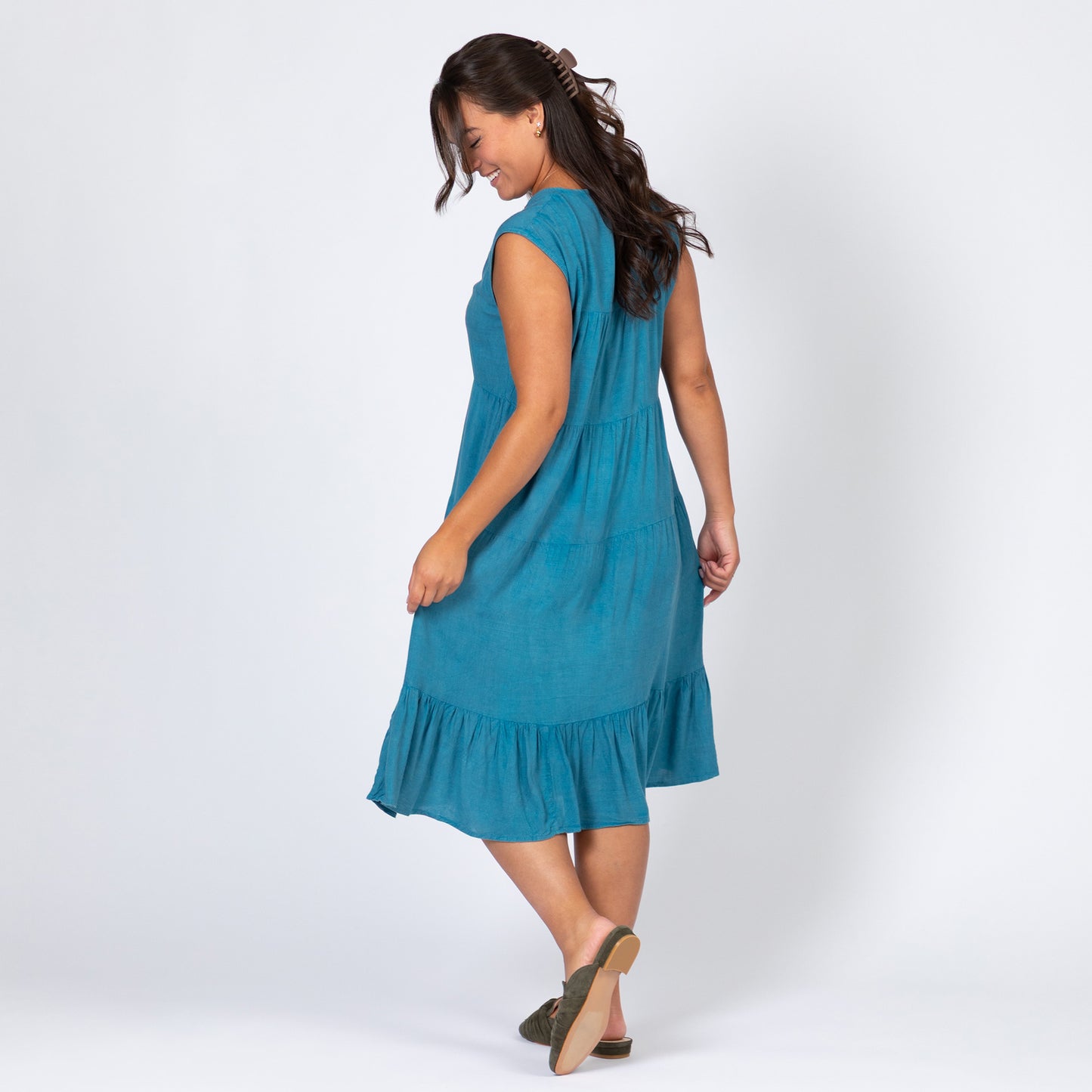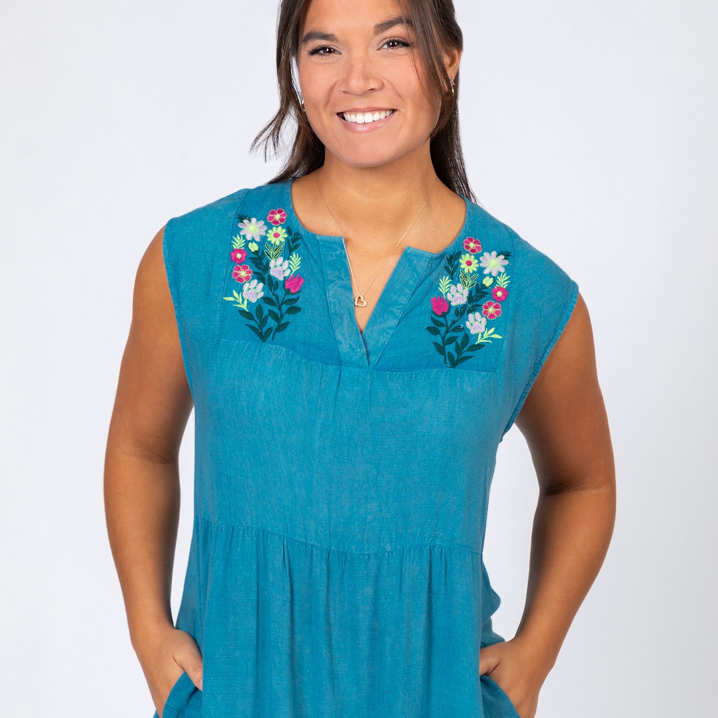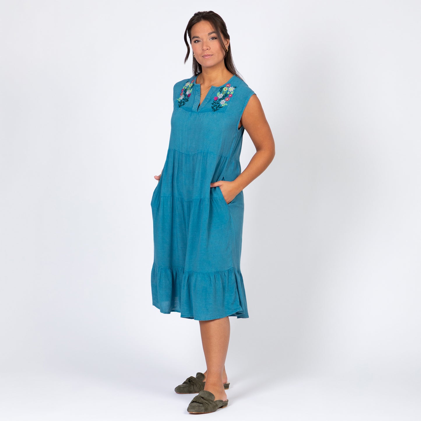 Effortlessly stylish and endlessly comfortable, this stonewashed tiered sleeveless dress is your go-to for casual days with a touch of charm. Detailed embroidery featuring flowers and paw prints adorns the front yoke, adding a unique and heartfelt detail. With a flowy midi-length silhouette, two handy side pockets, and breathable fabric made in India, this dress is perfect for warm days and relaxed elegance.