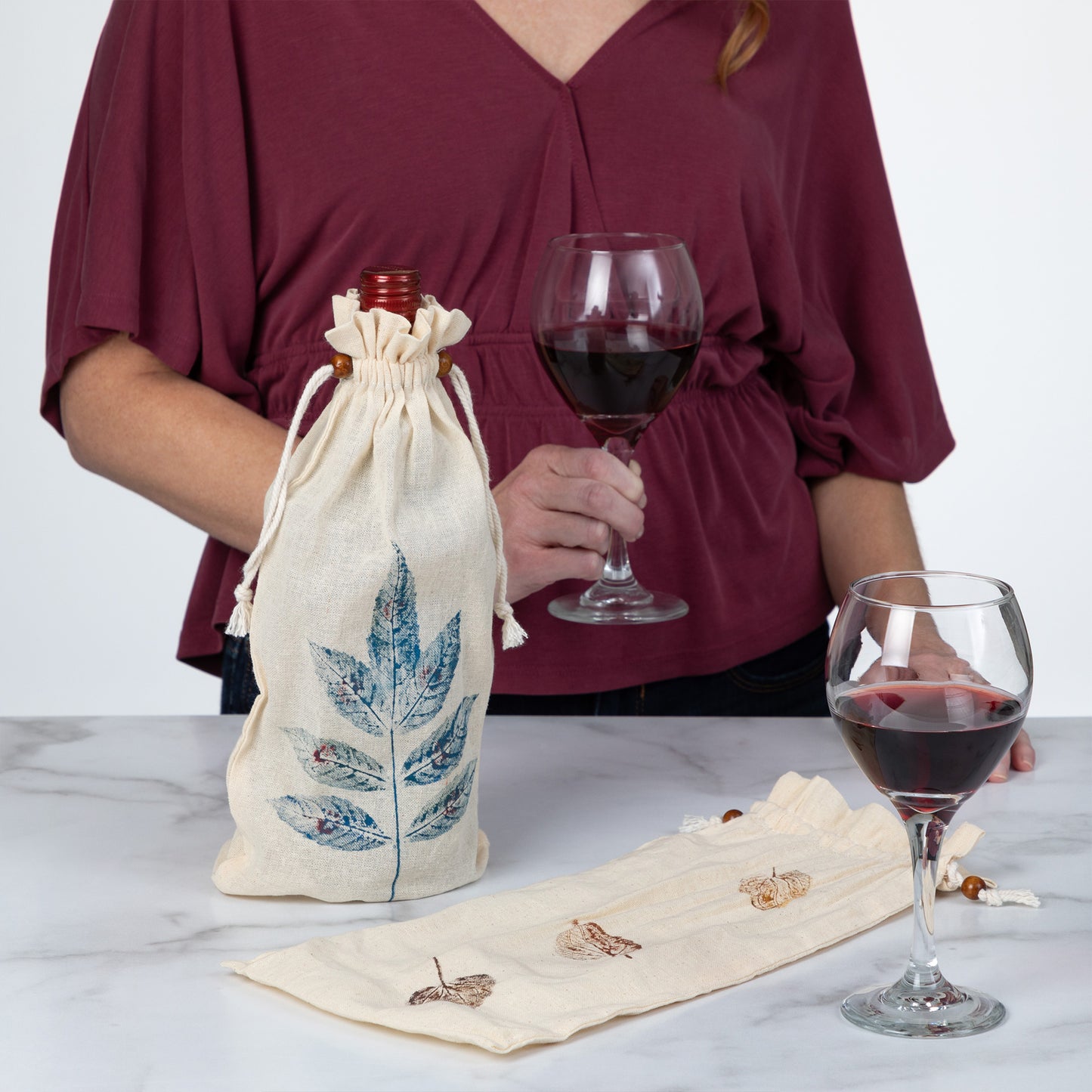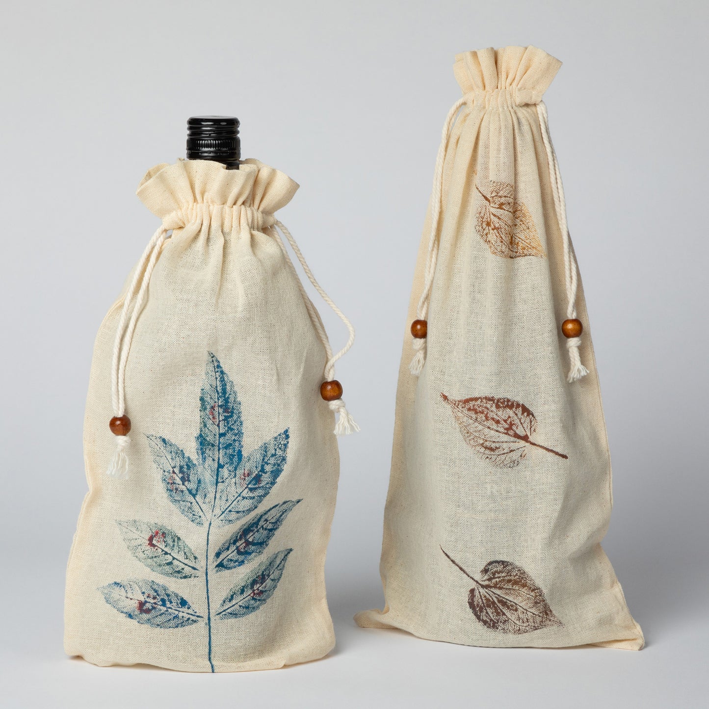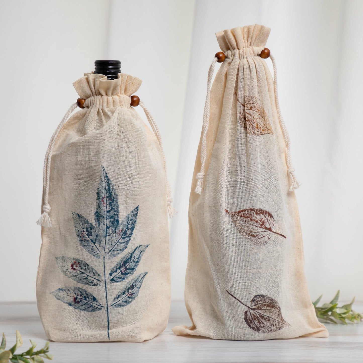 Add an eco-friendly, artisan-crafted touch to your gifting with a beautiful cotton wine bag duo. Each bag is handmade by skilled artisans in Thailand using 100% natural cotton, showcasing unique hand-printed leaf designs. Perfect for wine bottles or specialty gifts, these reusable bags are a sustainable and elegant way to celebrate while supporting fair trade practices.