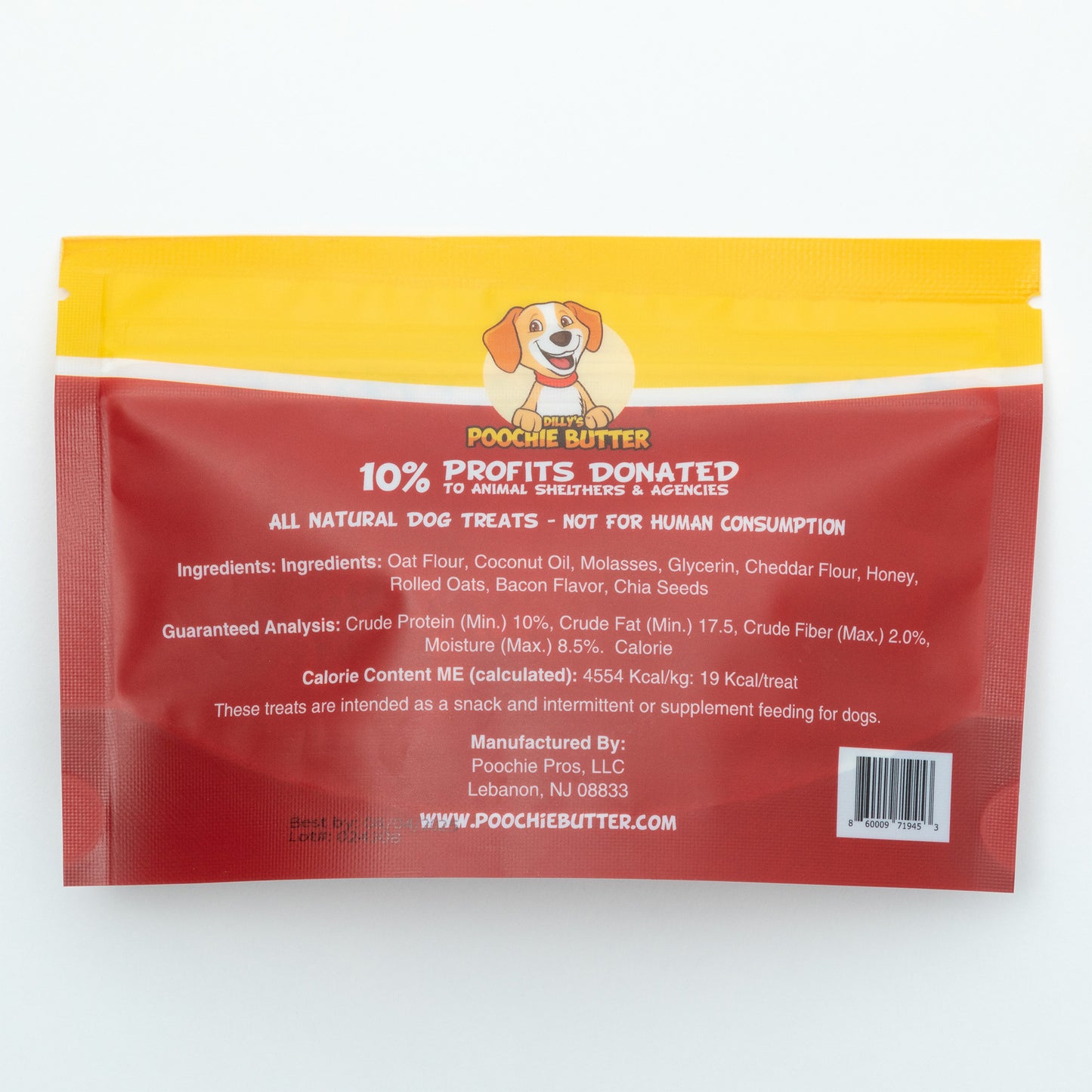Ingredients: Oat flour, coconut oil, molasses, glycerin, cheddar flour, honey, rolled oats, bacon flavor, chia seeds