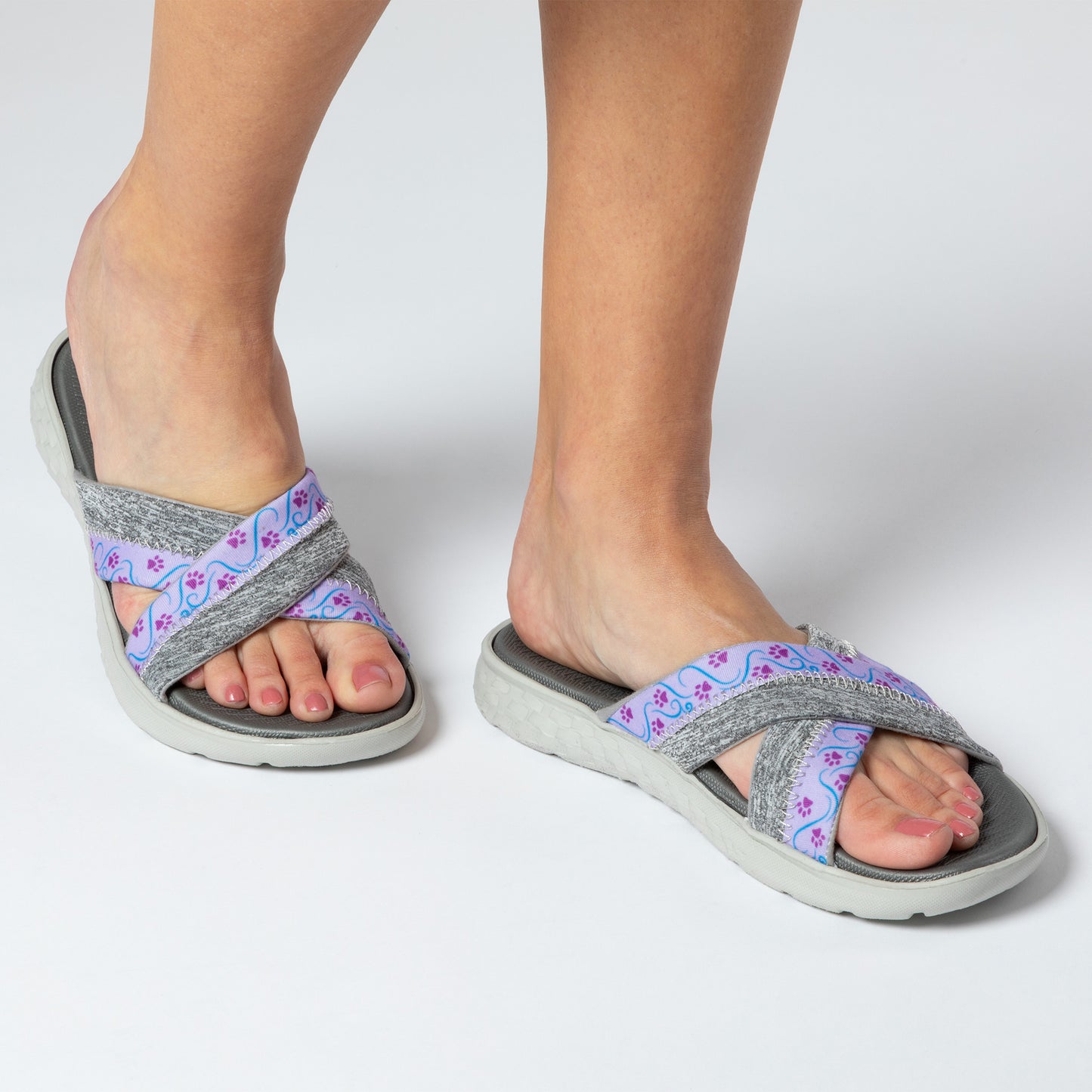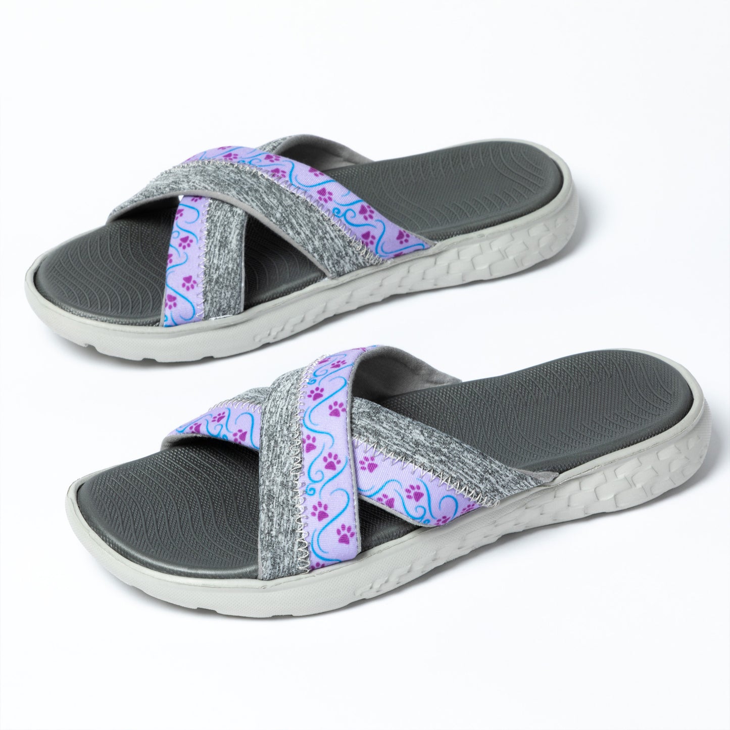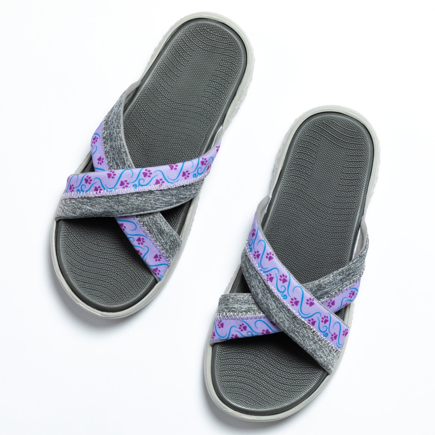 Step into comfort and style with these easy slide sandals! Designed with a soft polyester fabric upper in a charming paw print and swirl pattern, these sandals are perfect for laid-back days.