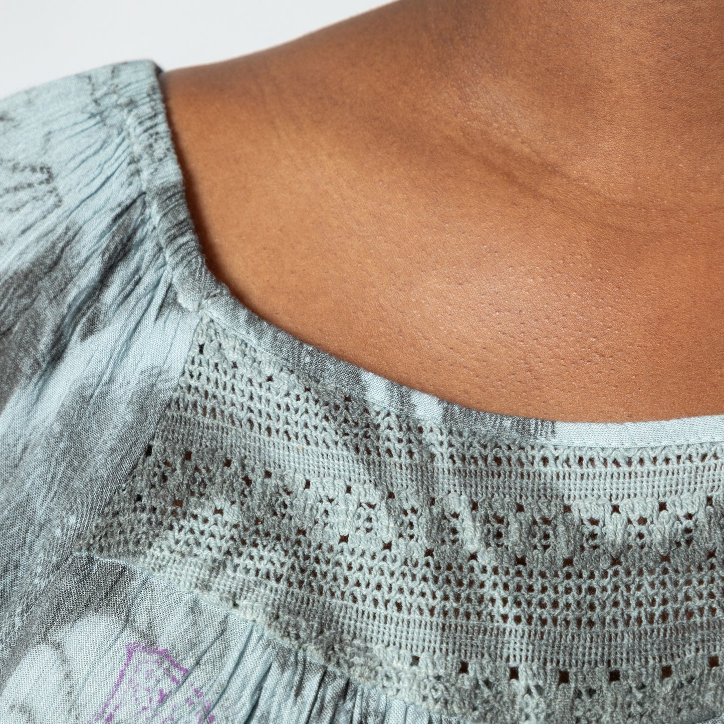 This easygoing top is full of charm, crafted from lightweight rayon with a soft, watercolor-inspired floral print that flows effortlessly. The scoop neckline features stretchy elastic and delicate crochet trim, adding comfort and texture in all the right places. Intricate embroidery and delicate beading along the hem add a touch of shimmer and artisanal charm. With its relaxed fit and airy long sleeves, it’s the perfect piece to brighten your everyday look or bring an artsy flair to weekend wear.
