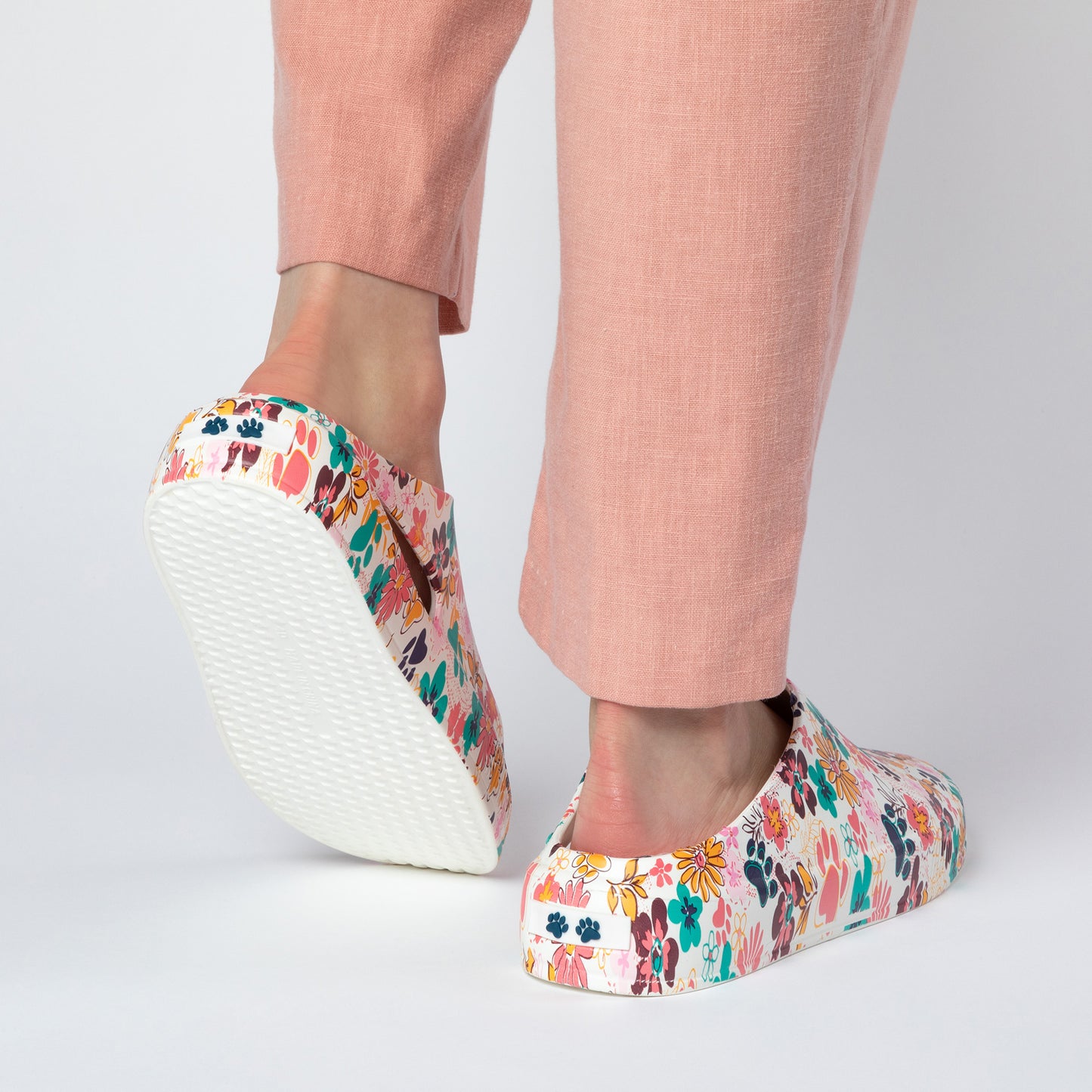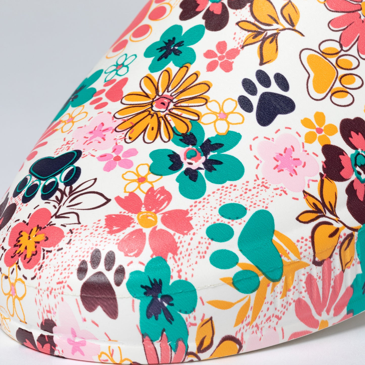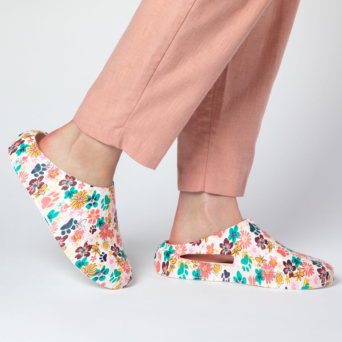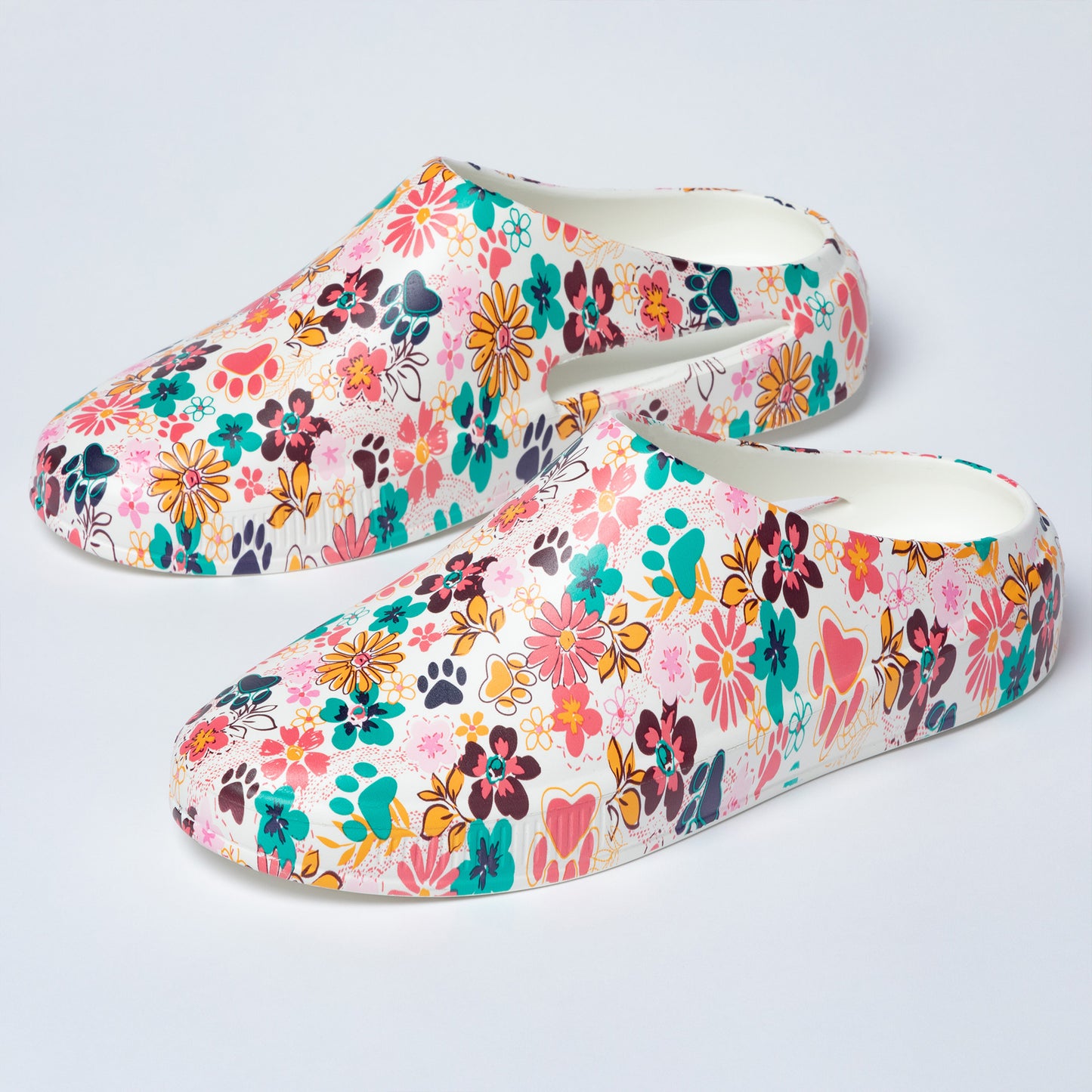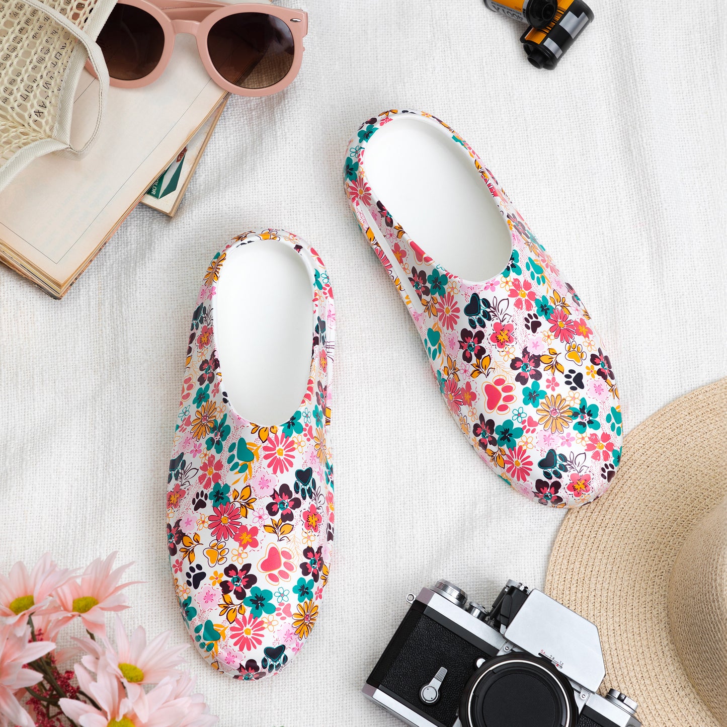 Brighten every step with these colorful slip-on clogs! Featuring a charming paw print and floral design, these ultra-light EVA clogs are perfect for effortless everyday wear. The slip-on style ensures convenience, while side ventilation holes keep your feet cool and comfortable. Whether you're strolling through the garden, running errands, or relaxing at home, these fun and functional clogs add a pop of personality to every stride!