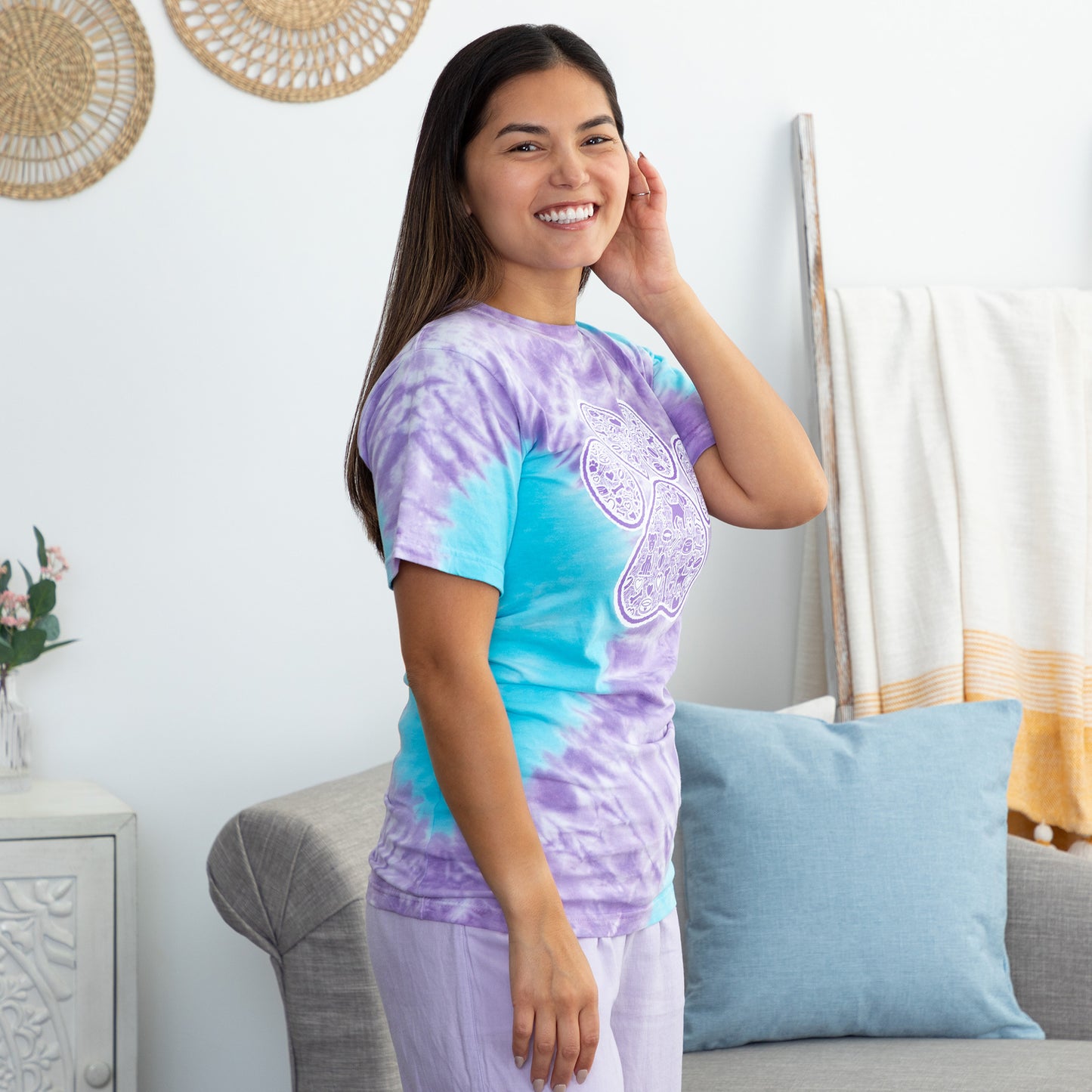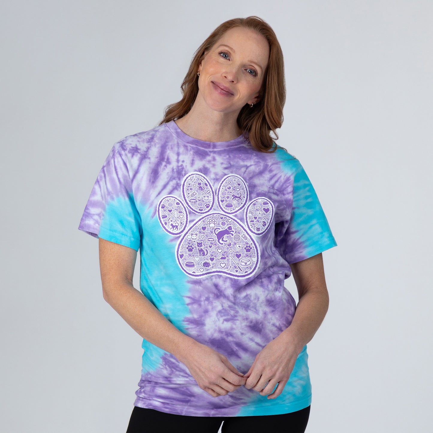 Unleash your love for your pet with a vibrant, tie-dye short sleeve tee! Featuring a playful paw print at the center, this unique design is filled with adorable cat and dog illustrations that will make your heart melt. Made with 100% soft, breathable cotton, this shirt offers all-day comfort while bringing a pop of color to your outfit.