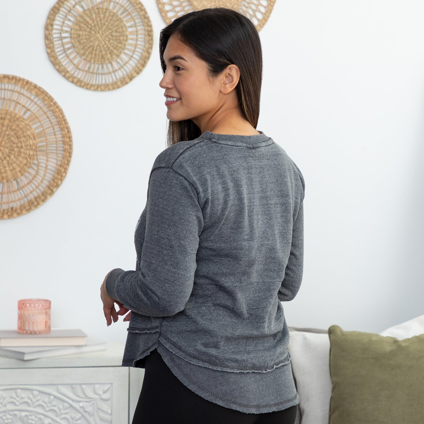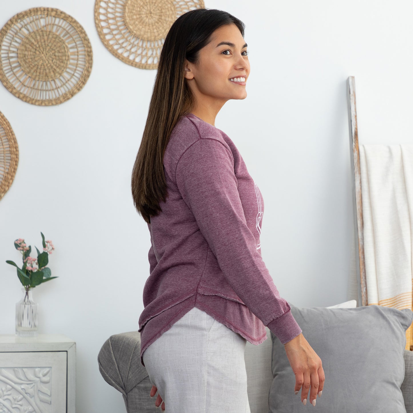 Featuring a paw print design on the front, this cotton-poly blend pullover sweatshirt is both soft and durable. The trendy hi-low hem and relaxed crew neck give it a flattering, laid-back vibe, perfect for a casual day out or a cozy night in. Available in versatile charcoal gray and rich maroon, this long-sleeve sweatshirt pairs effortlessly with jeans, leggings, or your favorite lounge pants.