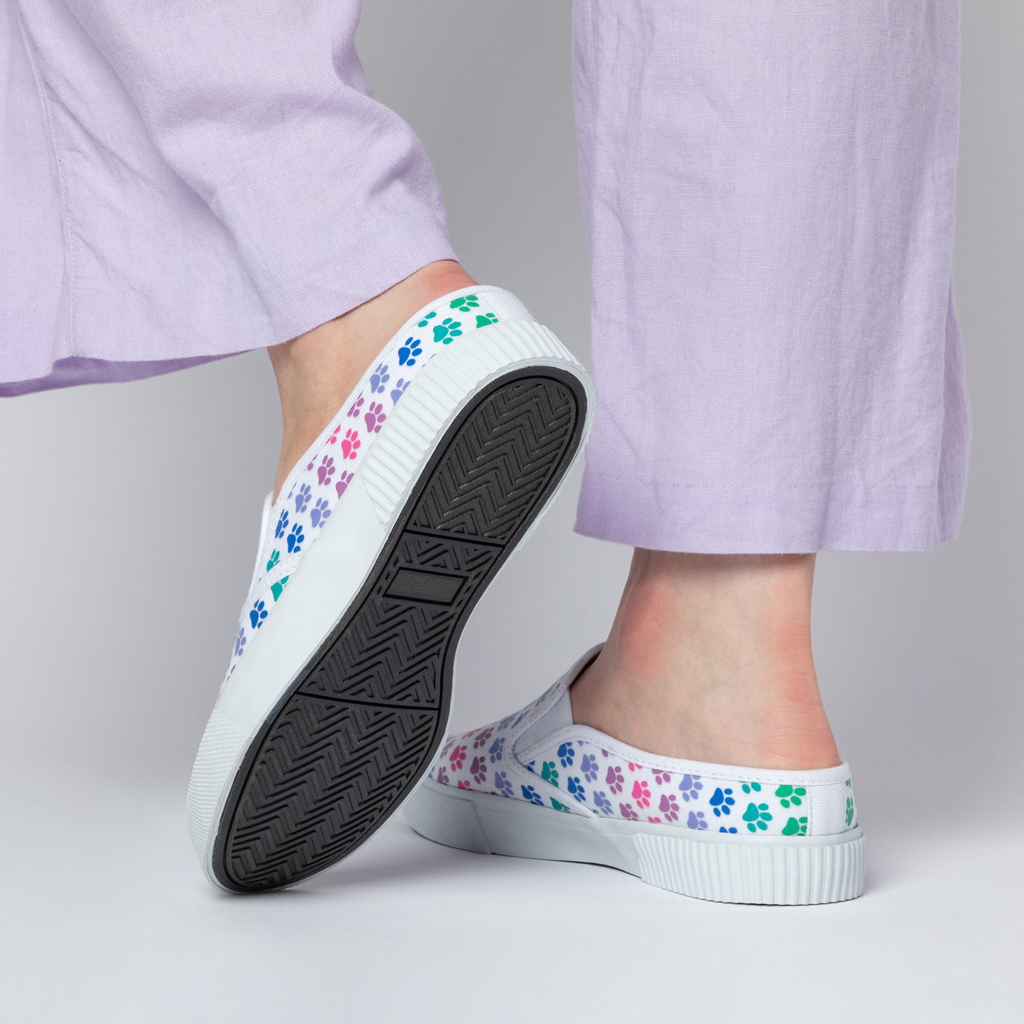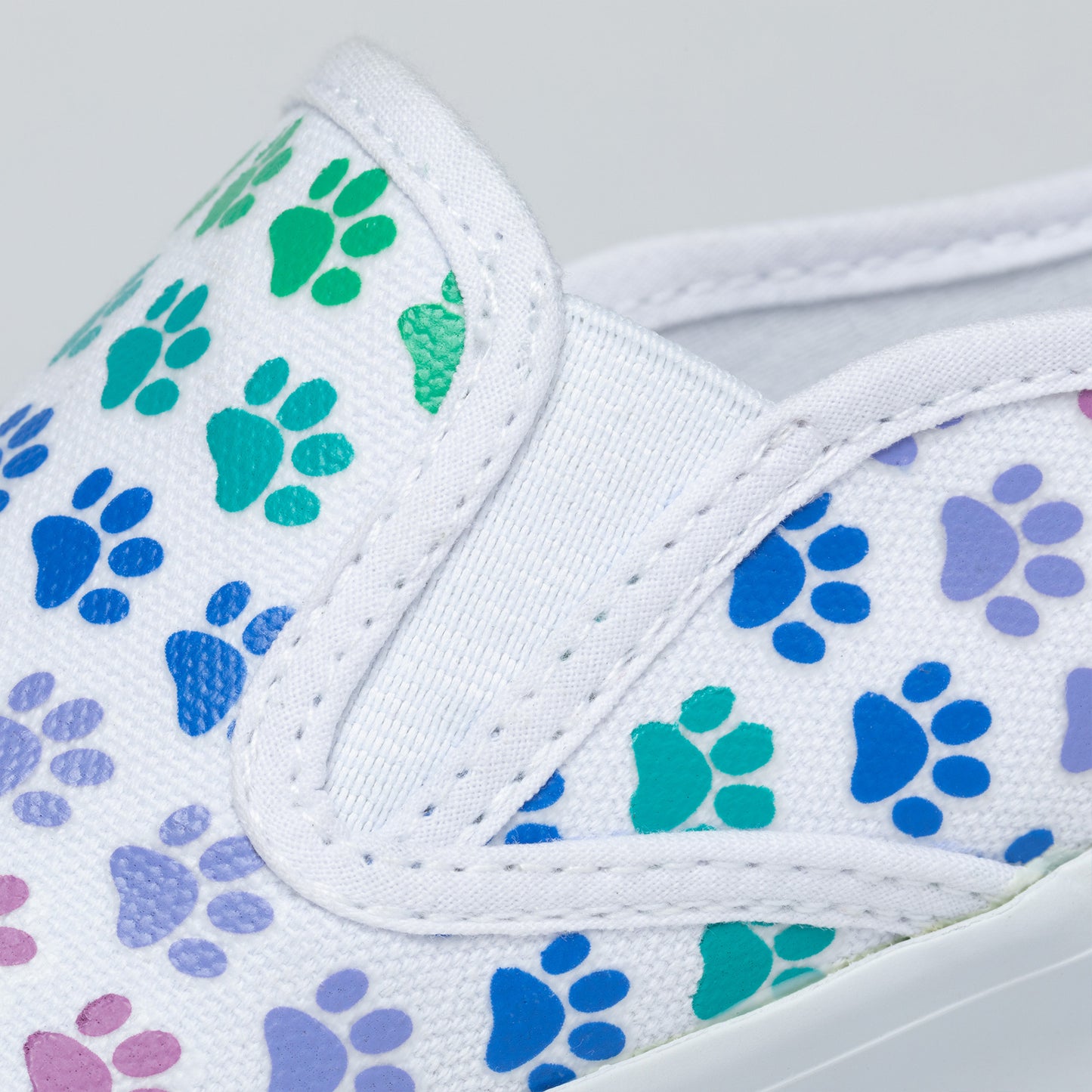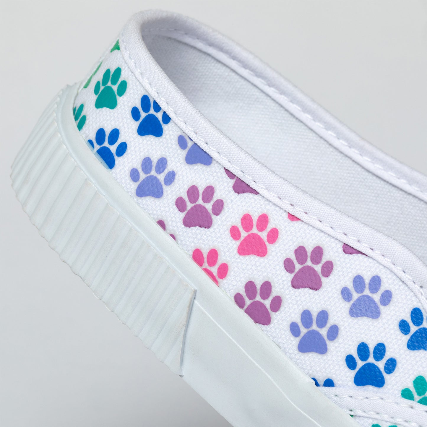 These shoes effortlessly blend comfort, style, and a fun, playful touch. The vibrant, eye-catching unique paw print design adds a lively and casual flair to any outfit. Crafted from durable cotton canvas, their slip-on style makes them easy to wear, while the sole ensures a comfortable, cushioned fit. Whether you're out running errands or relaxing with friends, these shoes strike the perfect balance between practicality and personality.