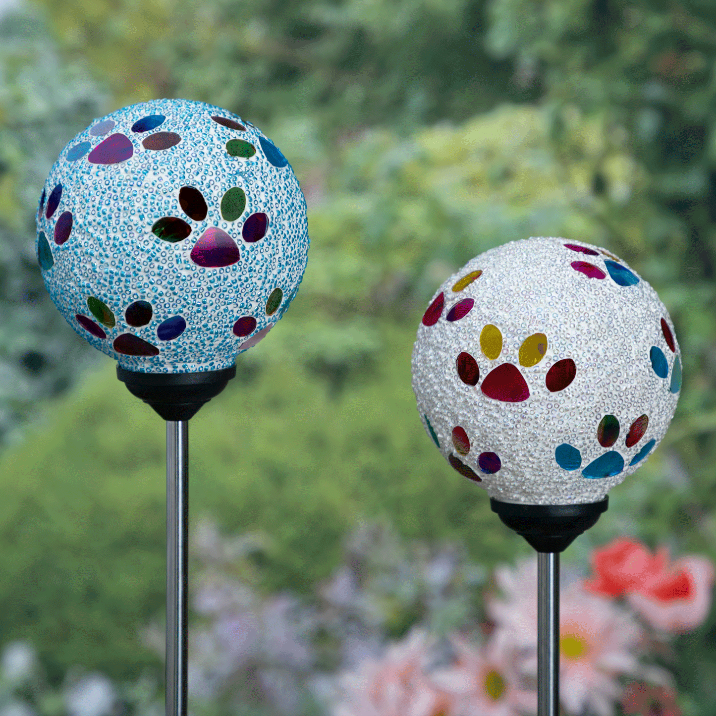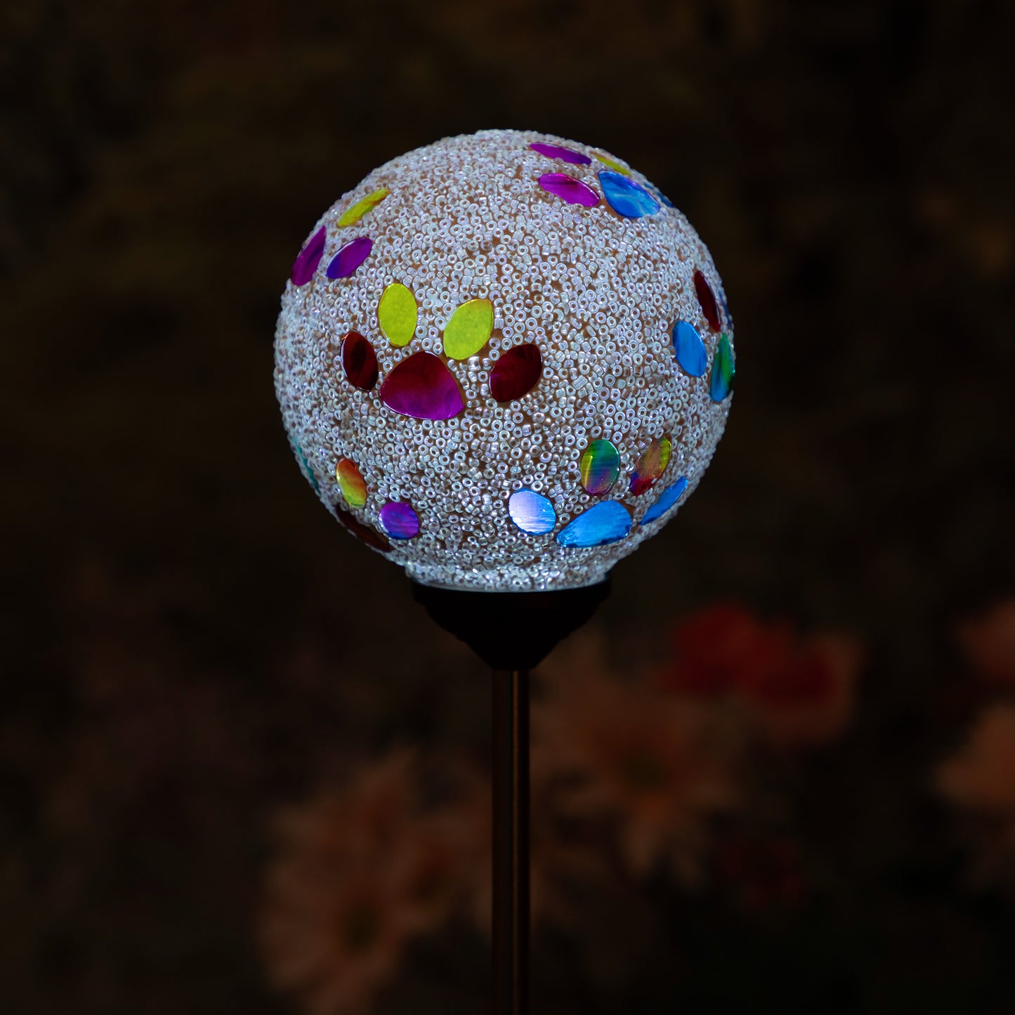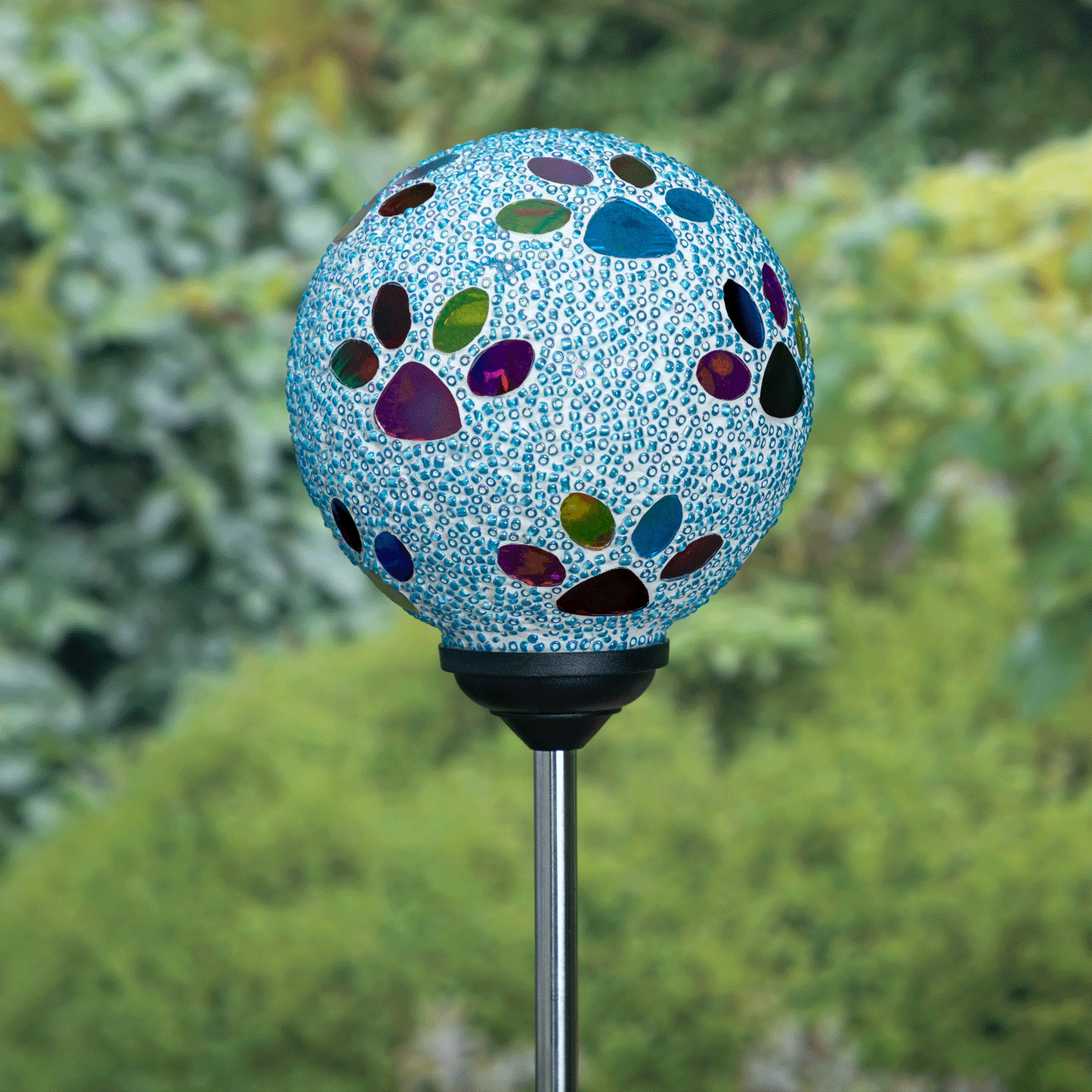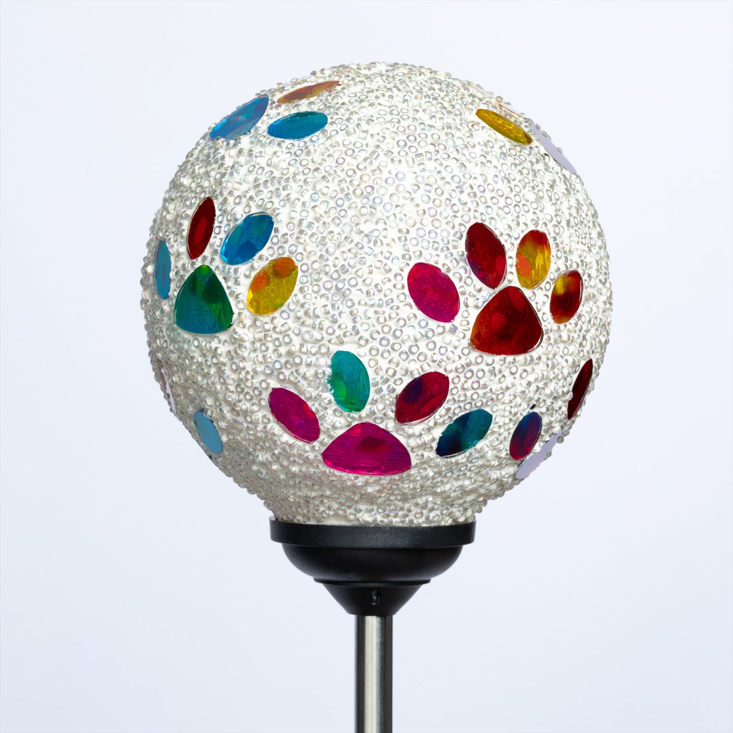Bring a colorful glow to your garden with a solar-powered mosaic paw print garden stake! The beaded glass ball on top sparkles with multicolored paw prints, creating a playful and colorful display day or night. Powered by the sun, they add a charming, pet-loving touch to any outdoor space—no wiring needed!