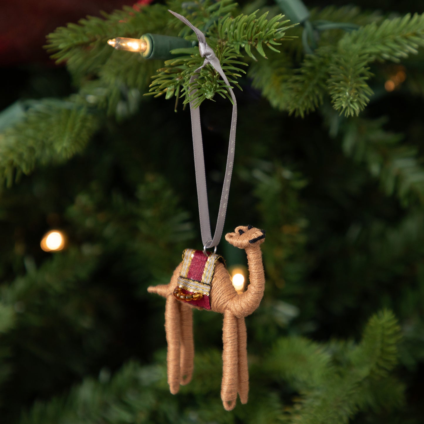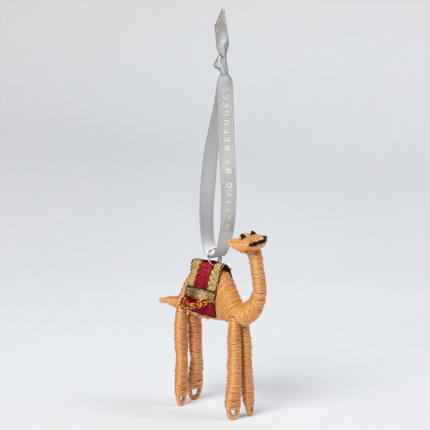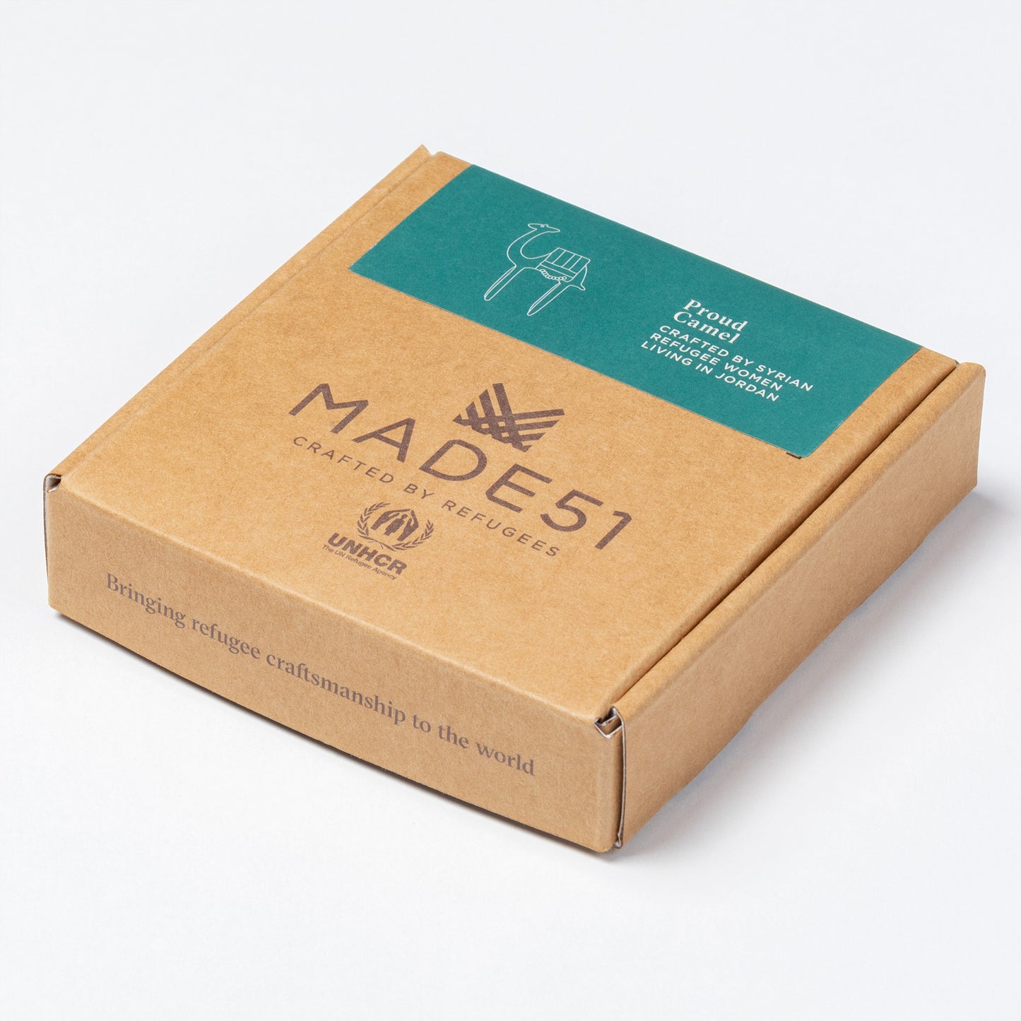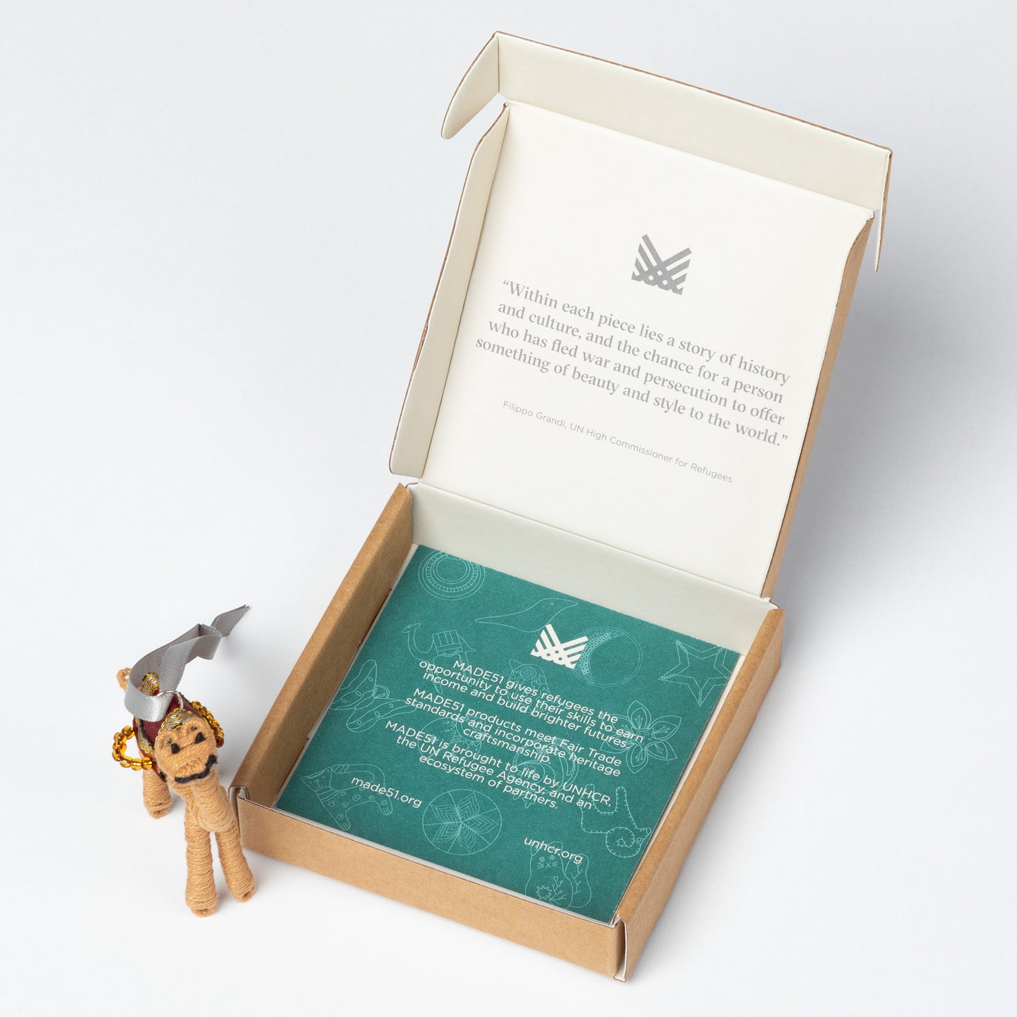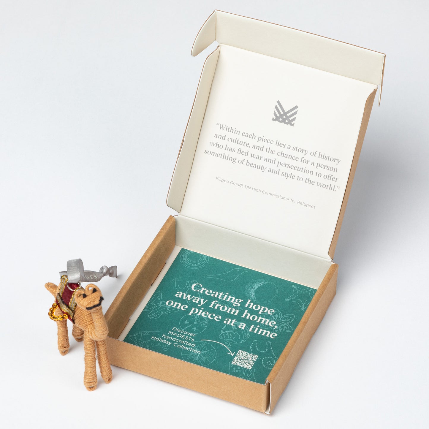 Packaging reads: "Crafted by Syrian refugee women living in Jordan. The camel is known for its incredible endurance and strength, essential characteristics for surviving the hardship of desert life. For centuries, the camel served as a valuable mode of travel."