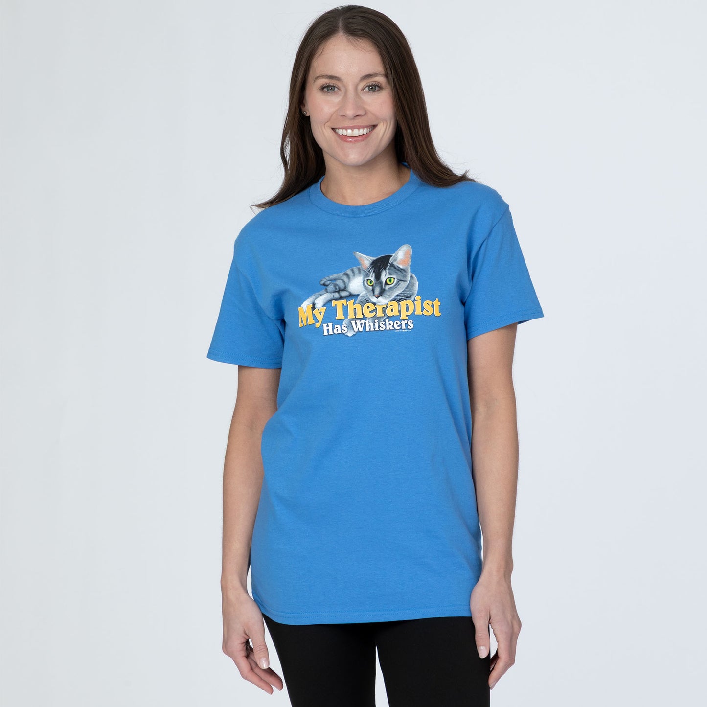 Let the world know who really gives the best therapy—your furry friend! This sky blue tee is perfect for the cat lover who understands the healing power of a purring companion. Made from 100% cotton for all-day comfort, this fun and lighthearted tee features a charming cat graphic and bold lettering that says it all. Whether you're lounging at home with your feline friend or out and about, this shirt is the perfect way to show off your love for your four-legged therapist!