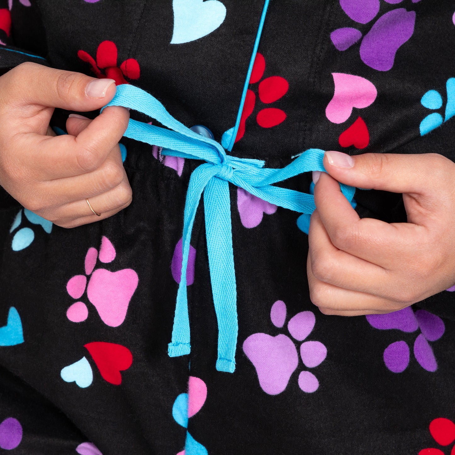 A classic pajama silhouette with furry friend flair! Featuring a button up design with a structured collar, and a comfortable drawstring waist that provides the ideal fit. This flannel pajama set is covered collar to cuff in an adorable paw print and heart design to carry you off to dreamland.