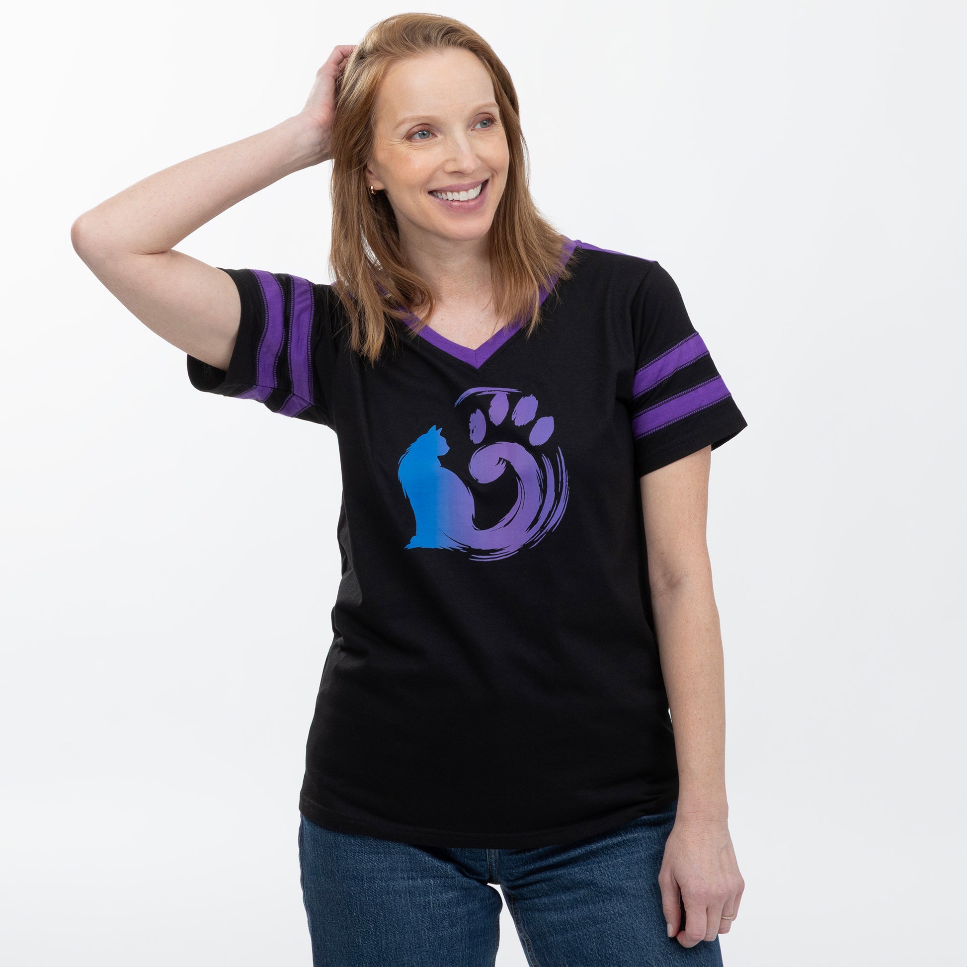This soft V-neck cat graphic tee is made from a breathable cotton-poly blend that feels lightweight, smooth, and comfortable for all-day wear. The flattering neckline and relaxed fit are elevated by a striking cat silhouette fused with a paw print - a stylish, artful design made for true cat lovers. Easy to dress up or down, this everyday cat lover T-shirt delivers effortless style, durability, and feel-good softness in one standout top.