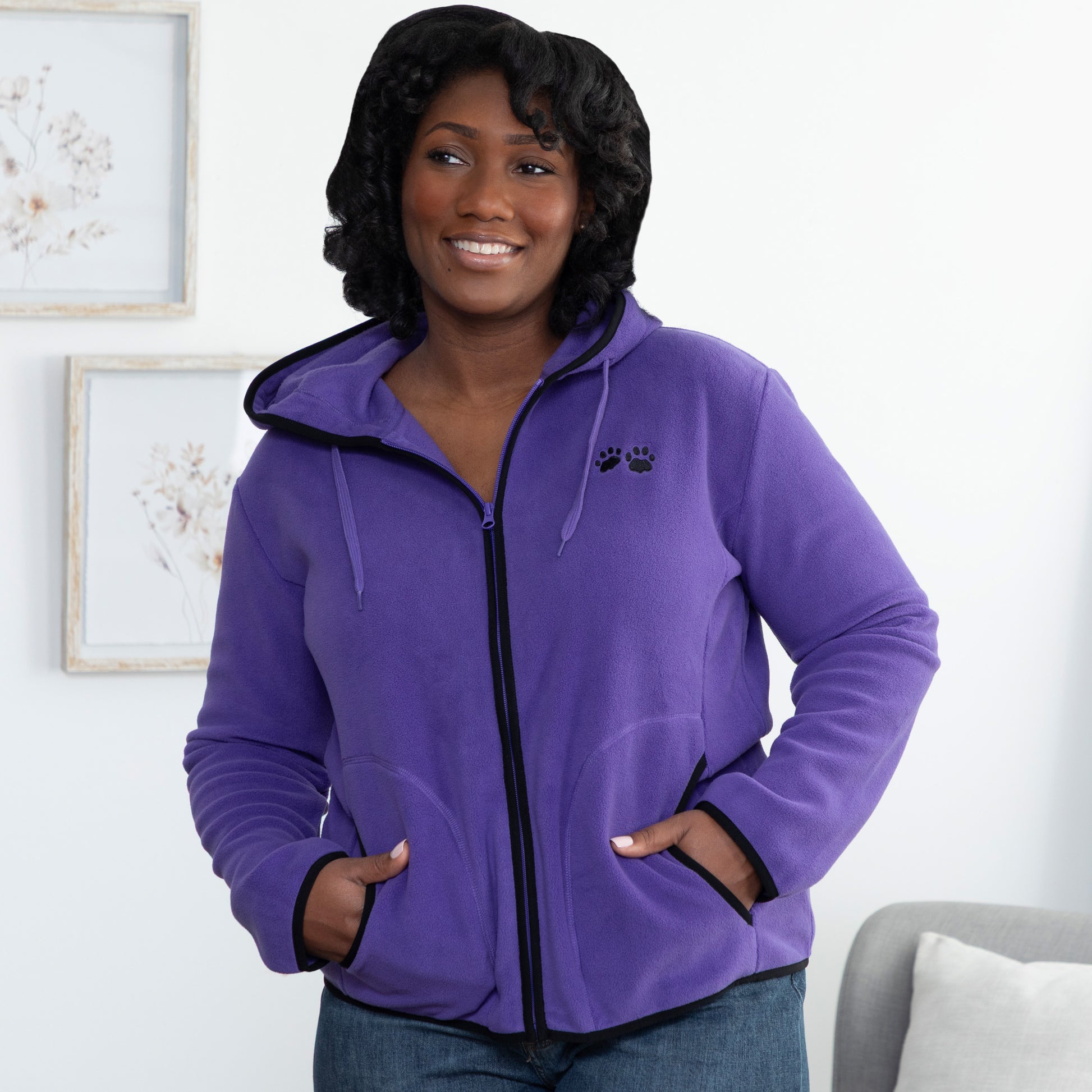 Hard to say what's more comforting: toasty polar fleece on a brisk day, or the love represented by the purple paw. Our custom-designed, hooded jacket is comfort times two, warming the body and the heart with its snug fit and double paw print. Contrasting trim and a drawstring hood lend a sporty touch.