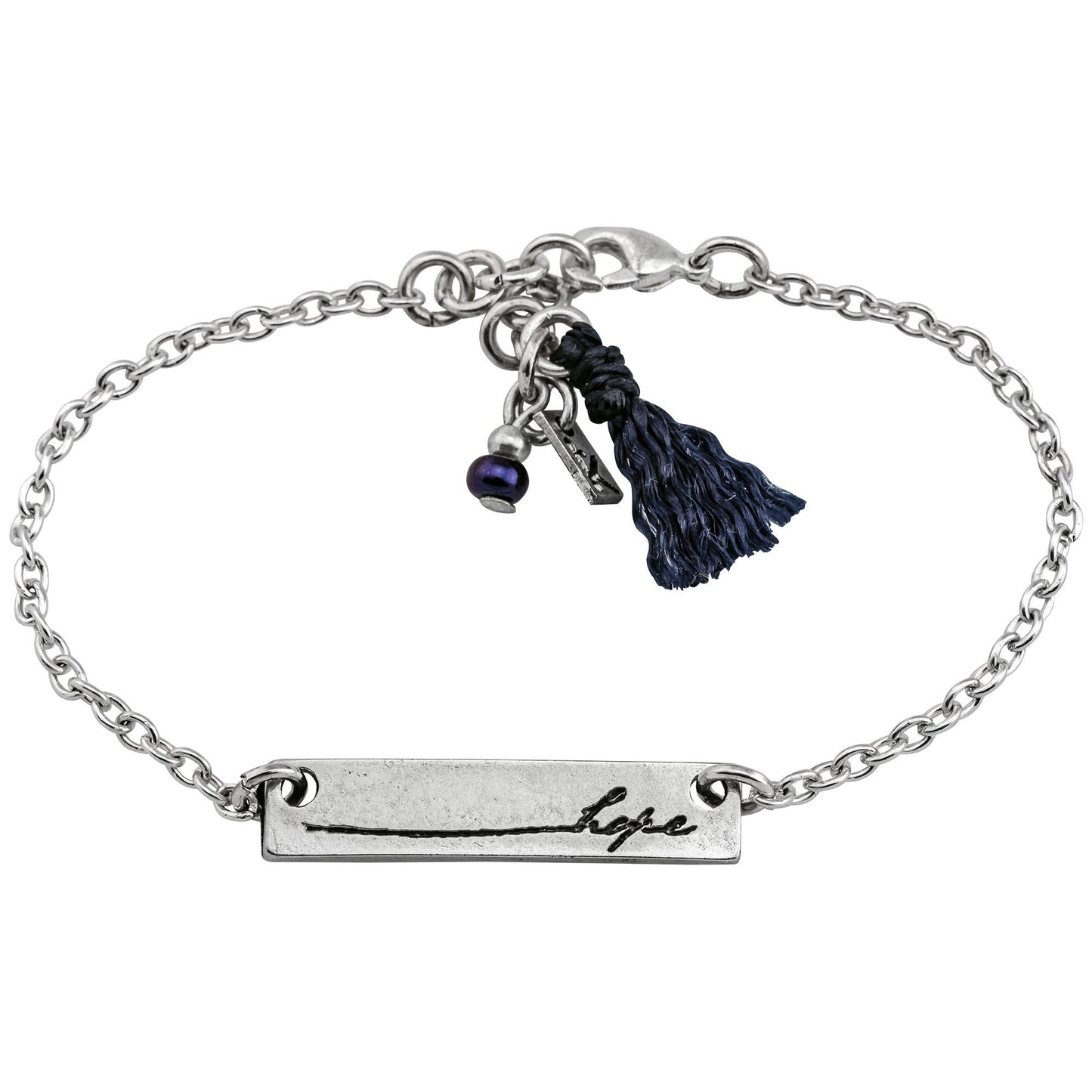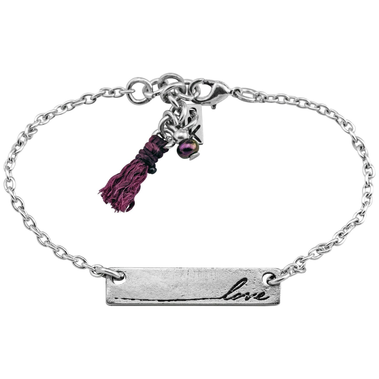 Life's gifts are many, but none more meaningful than the gift of helping others. Each pewter rectangular pendant is hung on a silver plated chain and finished with a tiny colored tassel. This bracelet is great alone or layered and is handmade and fairly traded from a women's craft organization in Guatemala. This special collection of inspirational charm jewelry brings opportunities to women artisans of Kiej de los Bosques in Guatemala, women like Alejandra.