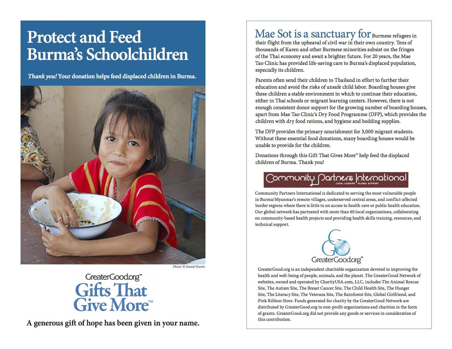 GreaterGood has partnered with the Mae Tao Clinic, located near the Myanmar border with Thailand, to provide education and food to Burmese children living in boarding houses. MTC's Dry Food Program enables children with poor education opportunities to access education along the Thai-Myanmar border and inside Myanmar's Karen state. Support in the form of monthly dry food rations is given to students living in boarding houses. These boarding schools ensure they complete their education, stay healthy, and are protected from the risk of child labor or exploitation.