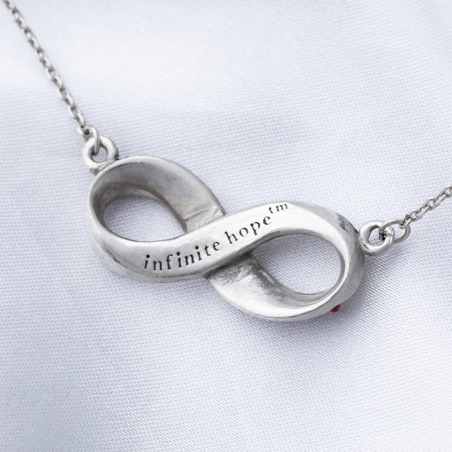 Share "Infinite Hope" with those living with diabetes. The front of our infinity pendant features a parade of ribbons with red crystal accents, while the back bears a message of inspiration for the cause.