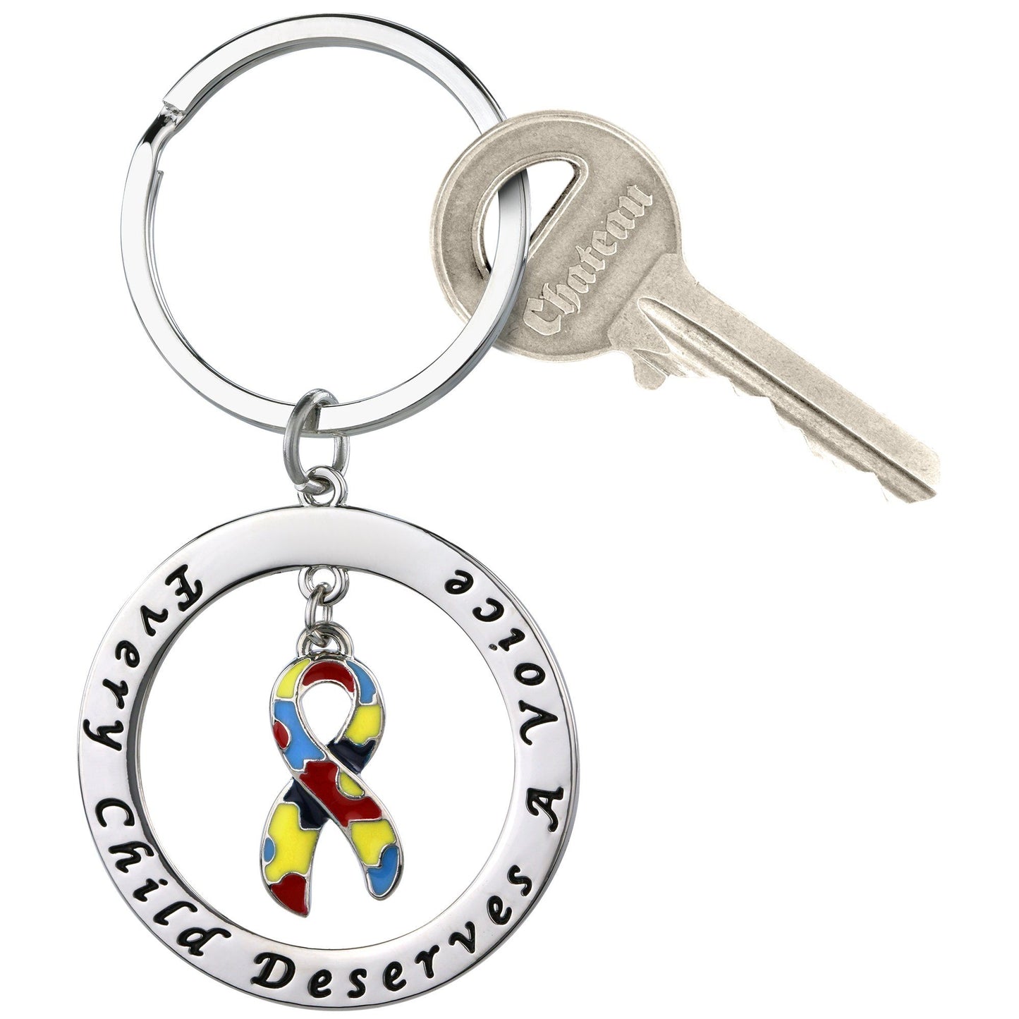 Be a voice for a child on the autism spectrum in your life, every where you go. A puzzle piece-filled ribbon hangs within the message that "Every Child Deserves A Voice."