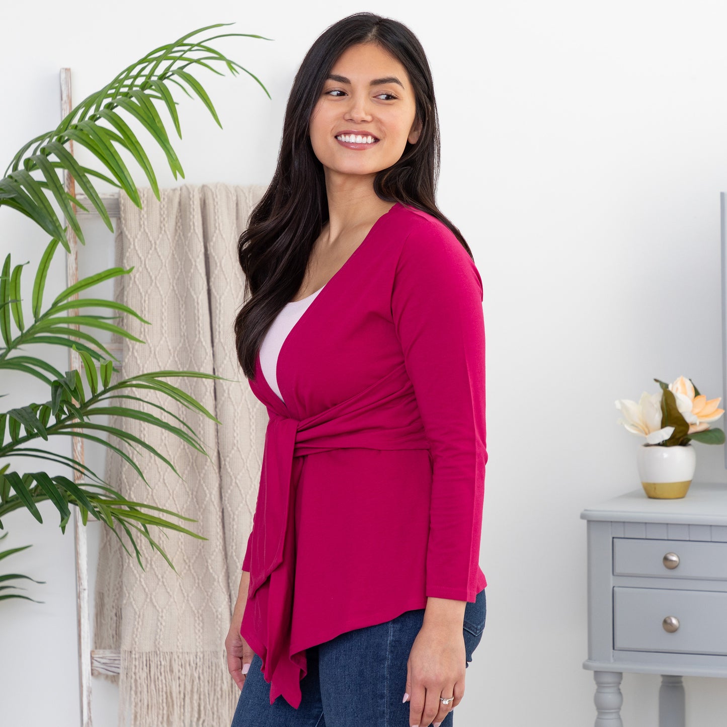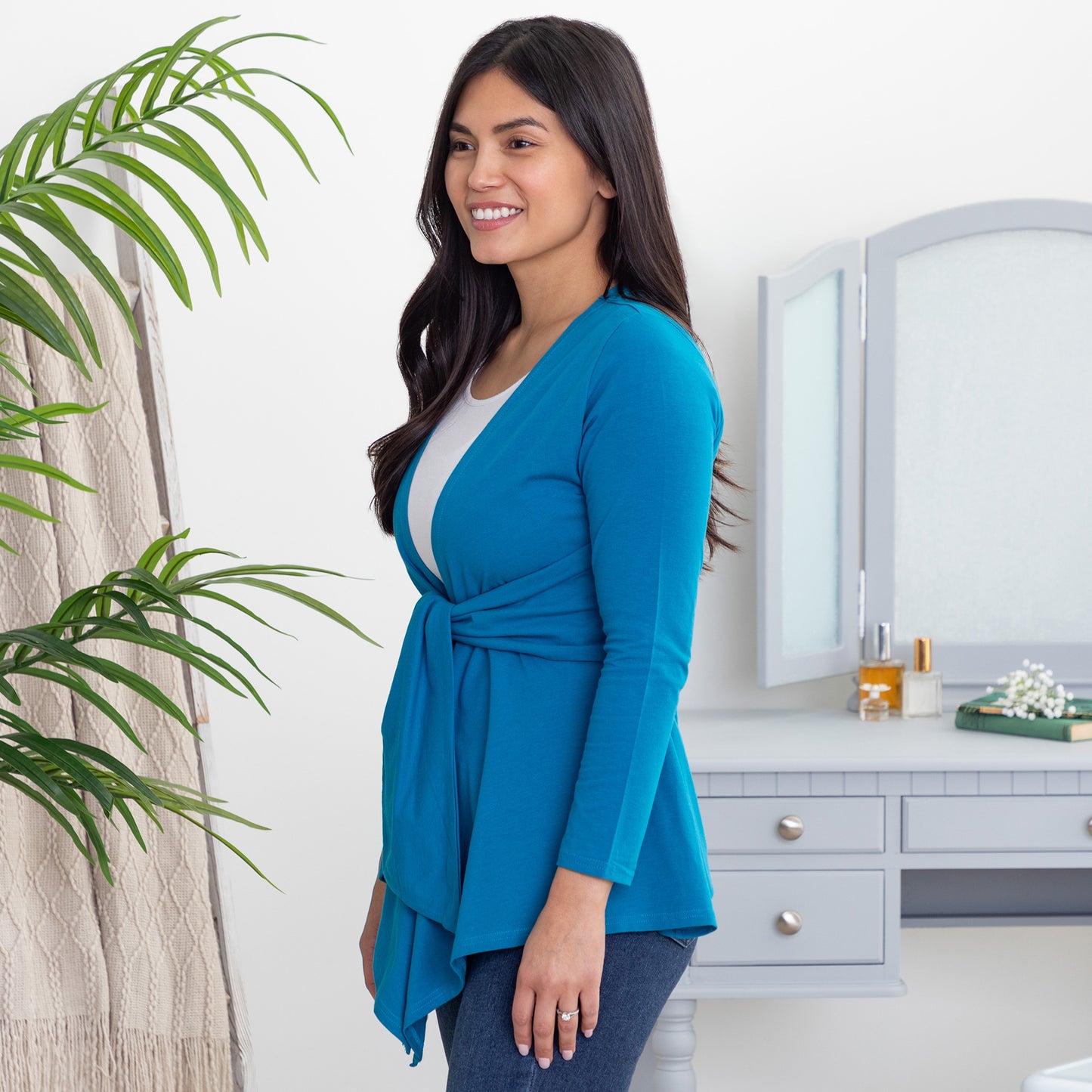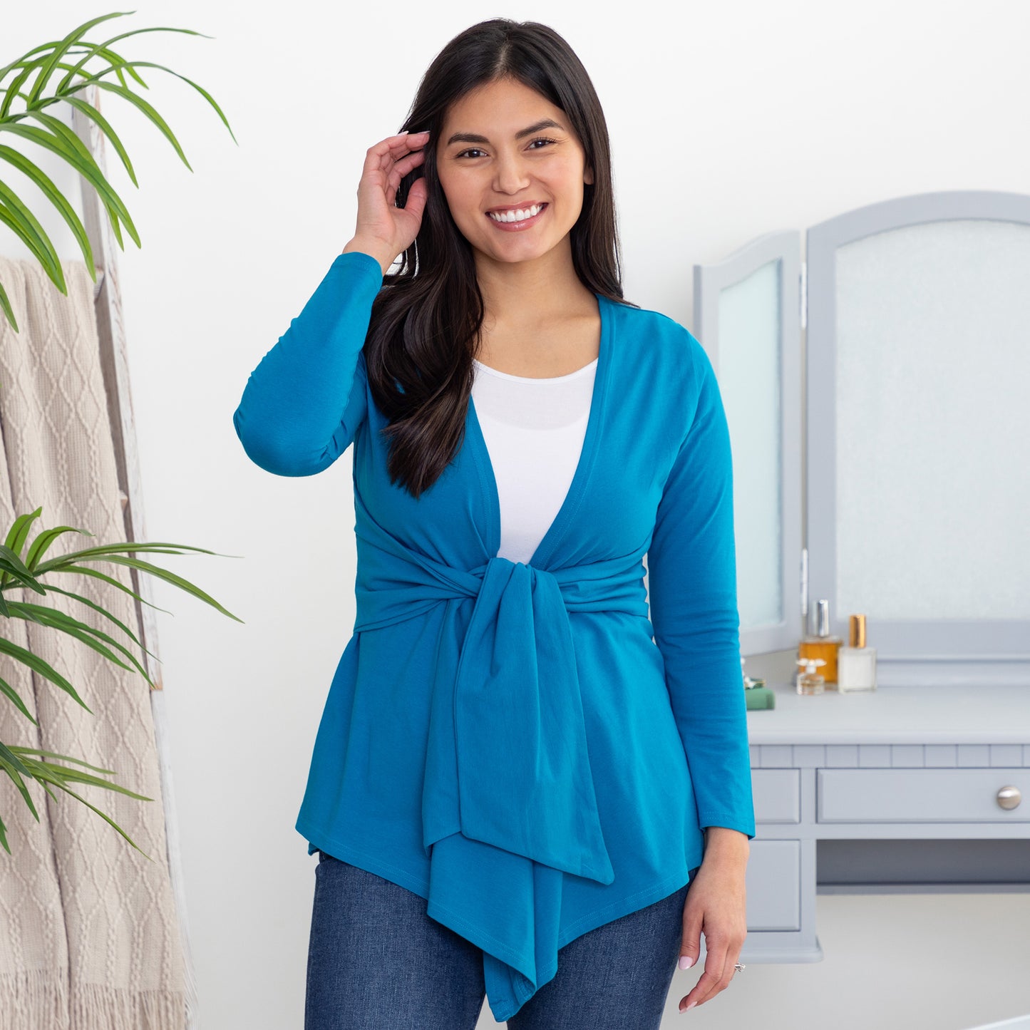 Want a style that flatters the waistline? This is it! Soft and comfy, our organic cotton cardigan can be layered over a tee or cami and features wide ties in the front for a super flattering fit. A blend of Lycra with organic cotton give this cardigan just the right amount of stretch and movement.