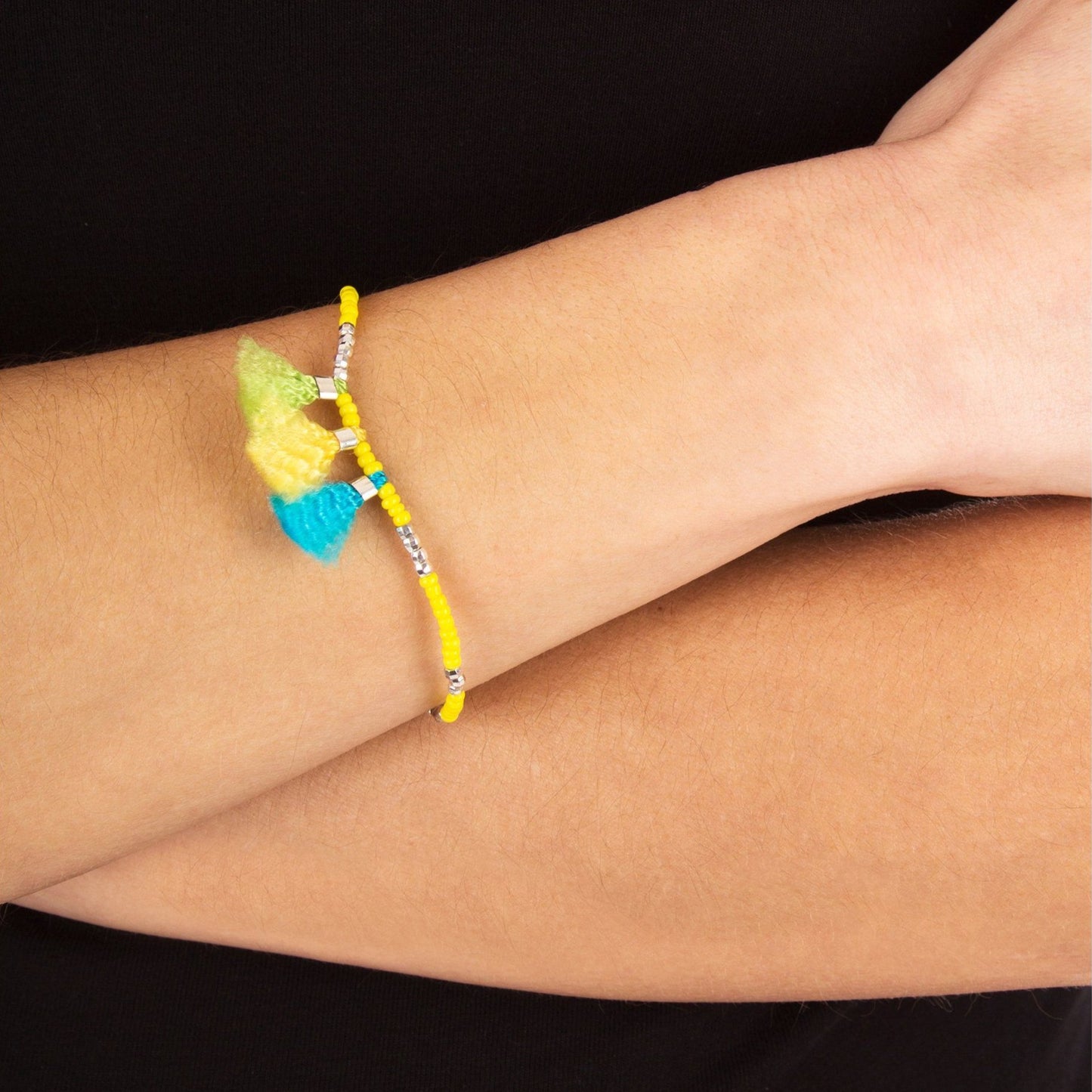 The charming possibilities are infinite with our bracelet filled with meaning and made for stacking. The bracelet is hand woven and beaded by women artisans in Guatemala. The women gather as a cooperative in homes to work on jewelry. The bracelet starts as cotton threads tied to a nail in a wall, skillfully braided with beads and charms into our truly inspiring bracelet.