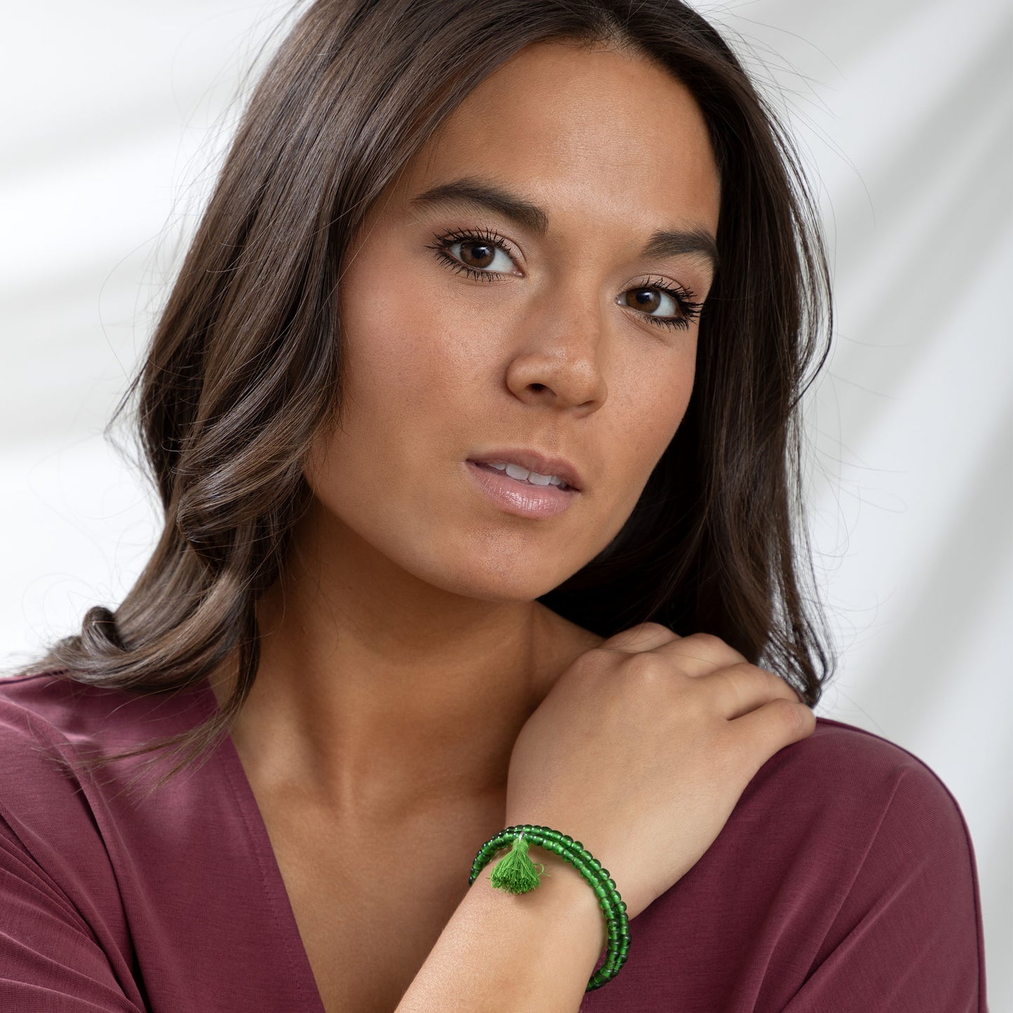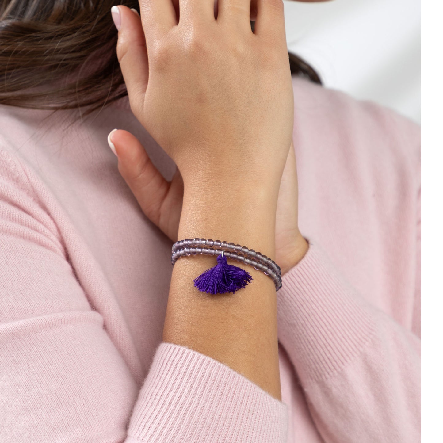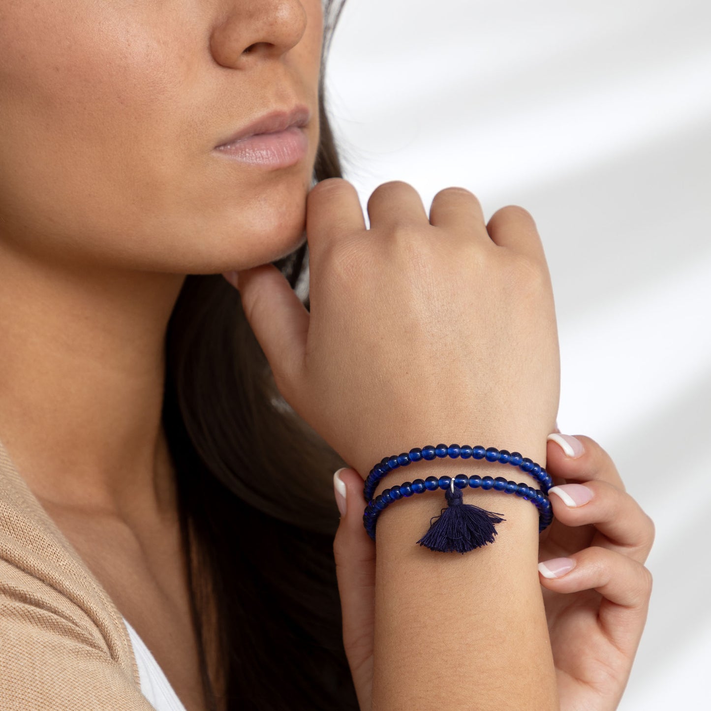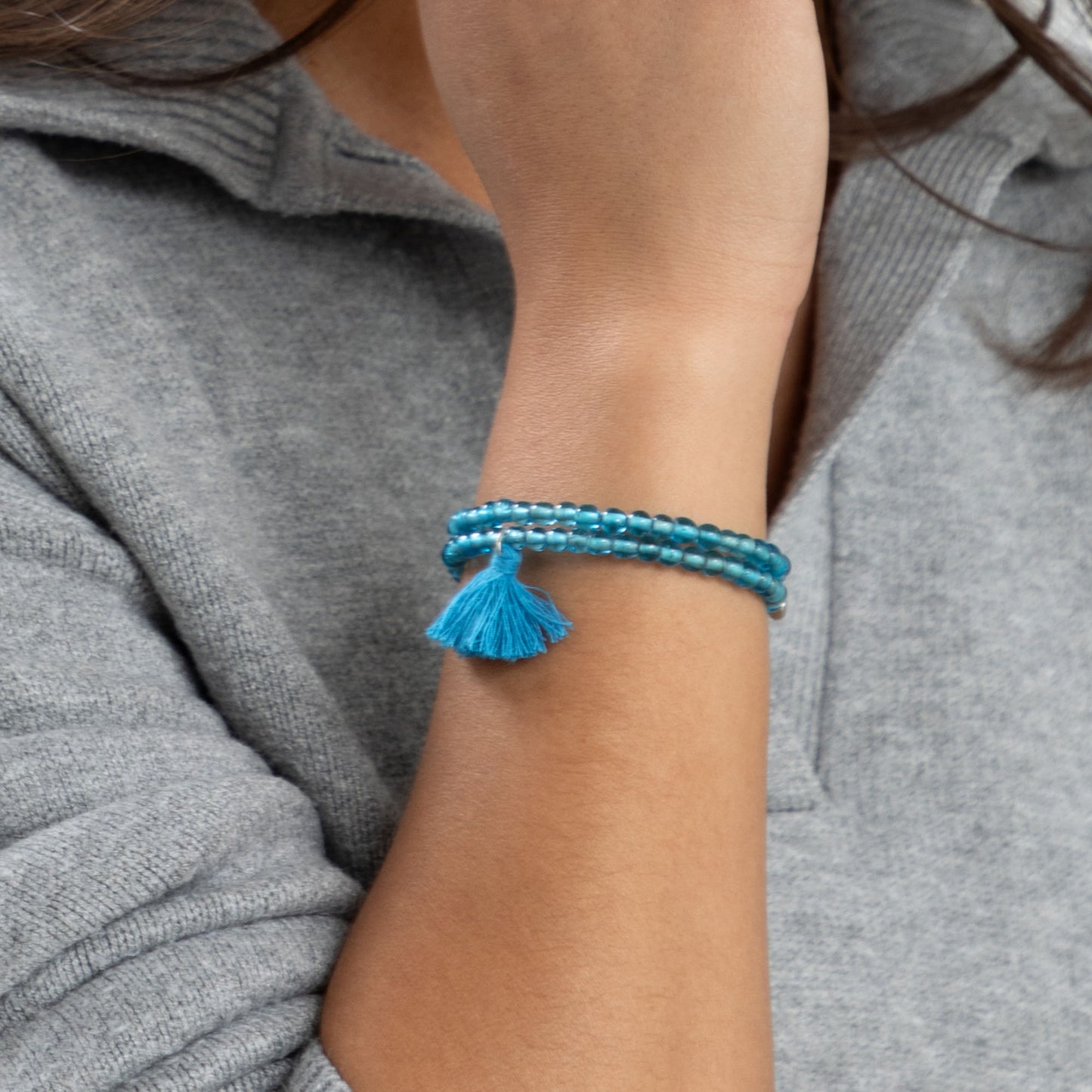 A fun bohemian style with stunning glass beads and brightly colored tassel accent, these once-around wrap bracelets are perfect for stacking. Each bracelet is handcrafted by skilled women jewelry artisans at Community Friendly Movement in a village just outside of Delhi, India.