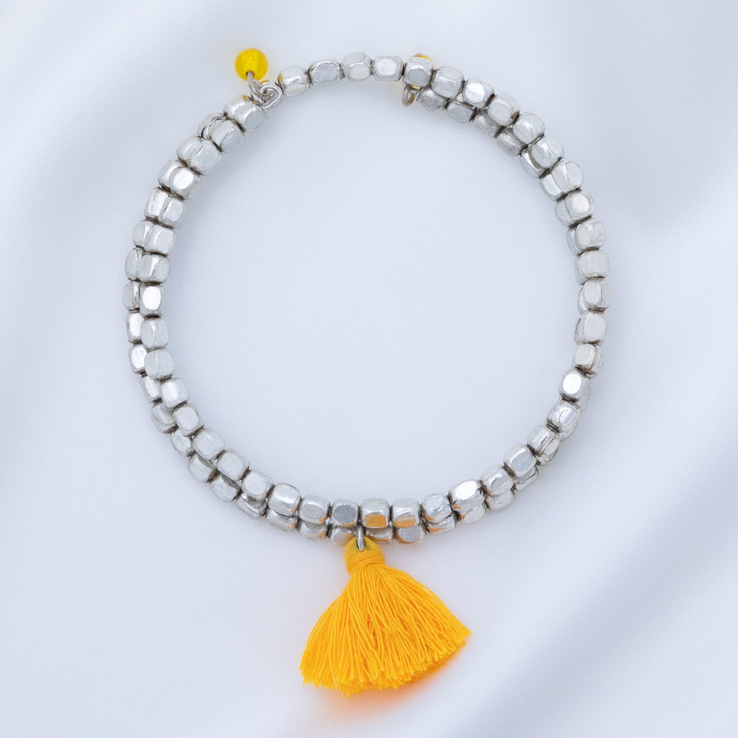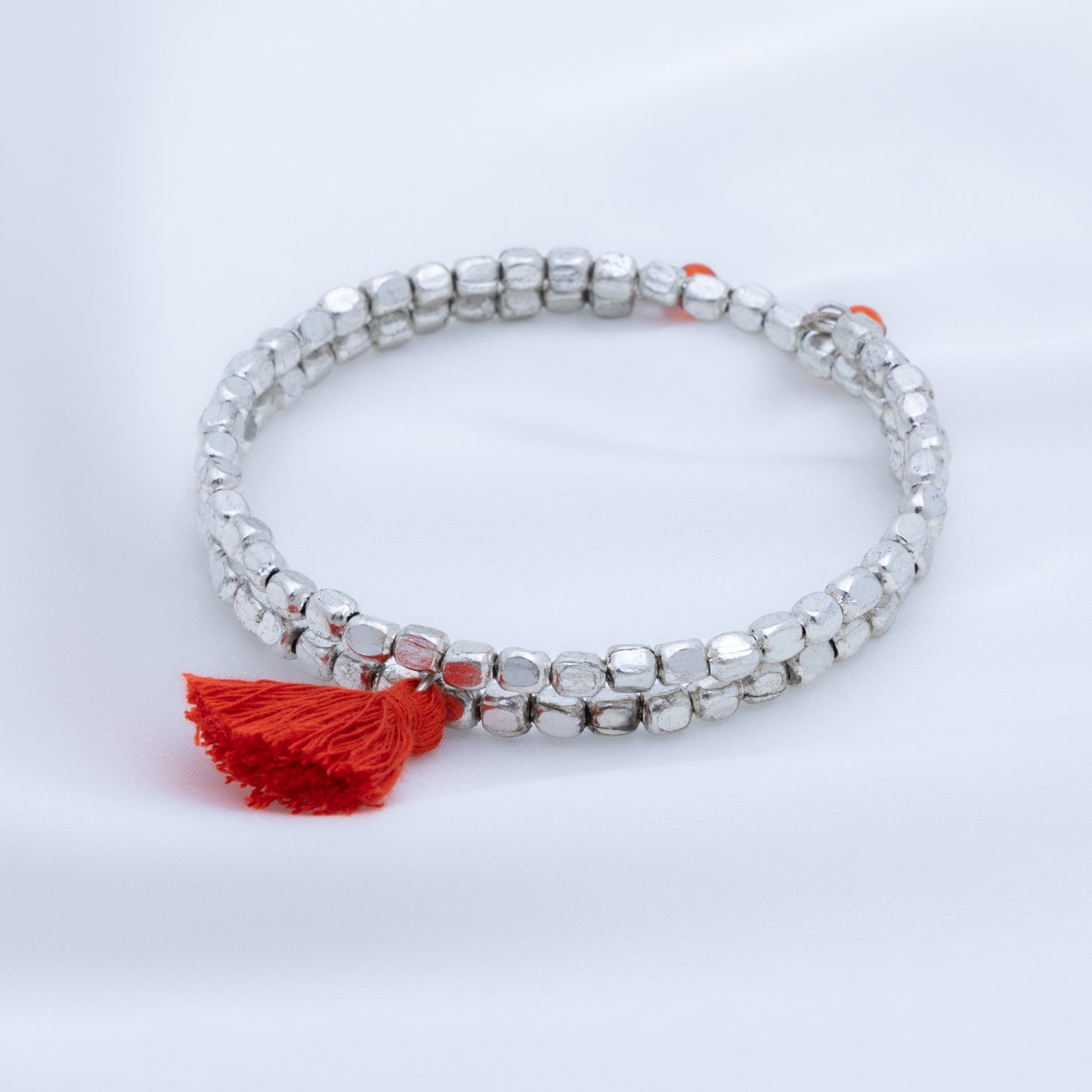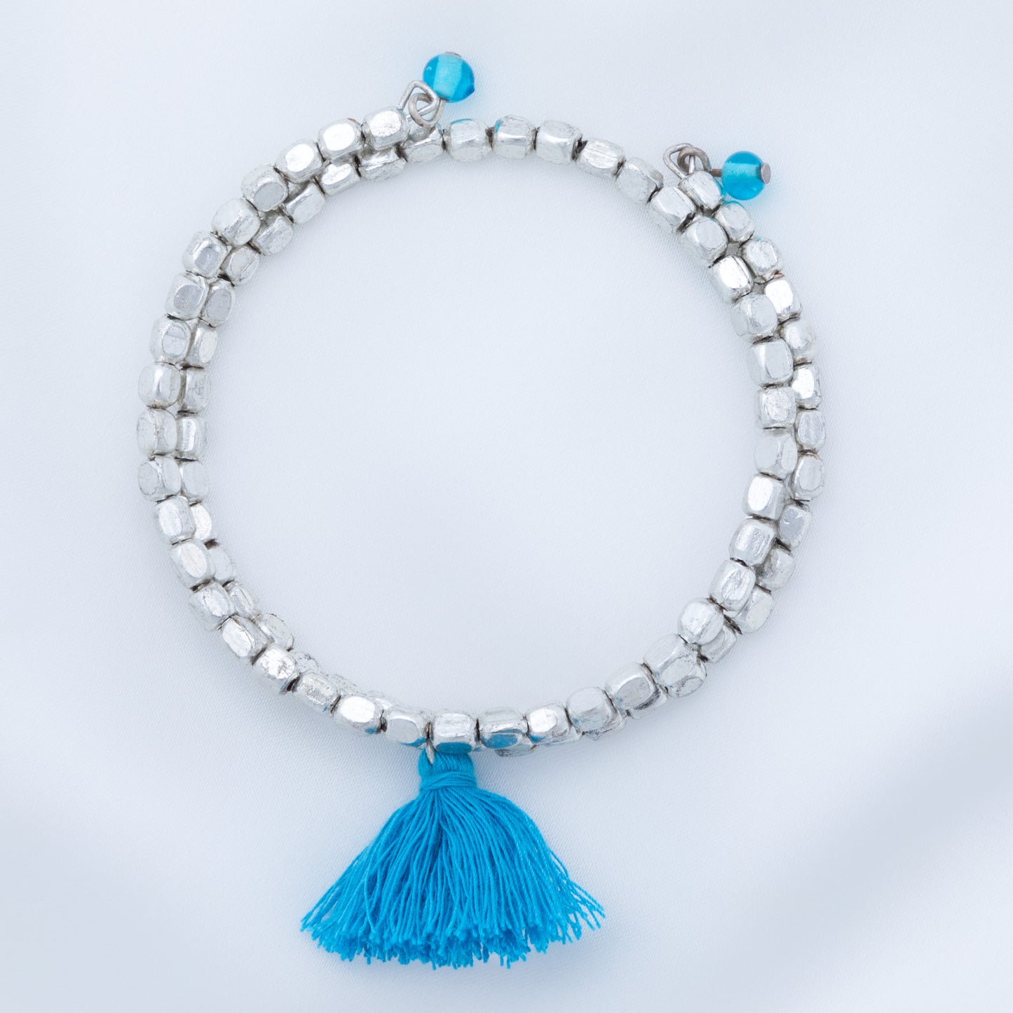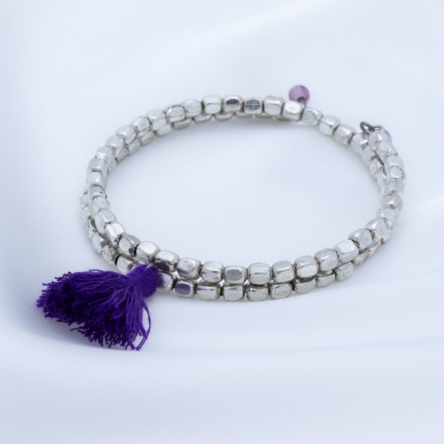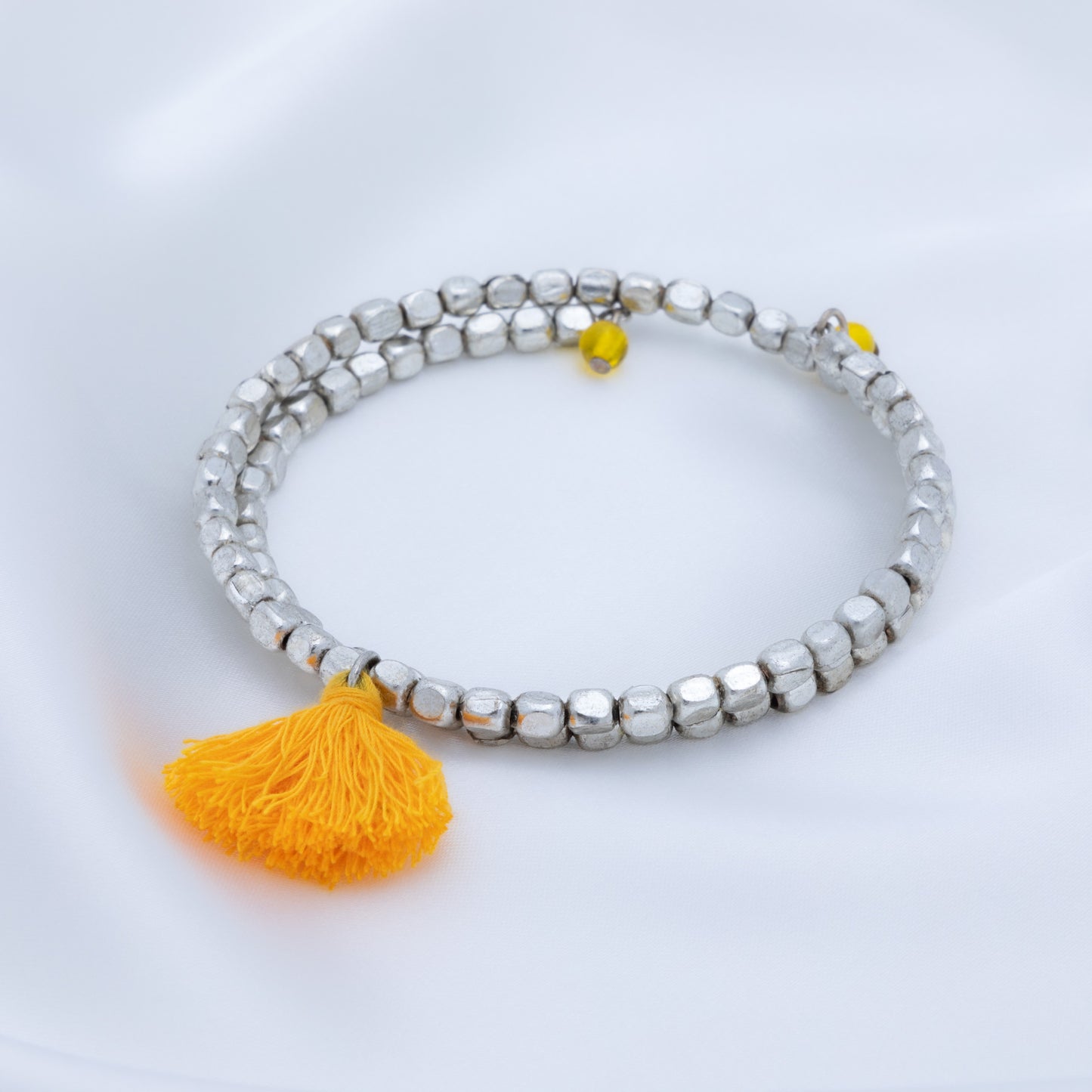A fun bohemian style with stunning silver-plated beads and brightly colored tassel accent, these once-around wrap bracelets are perfect for stacking. Each bracelet is handcrafted by skilled women jewelry artisans at Community Friendly Movement in a village just outside of Delhi, India.