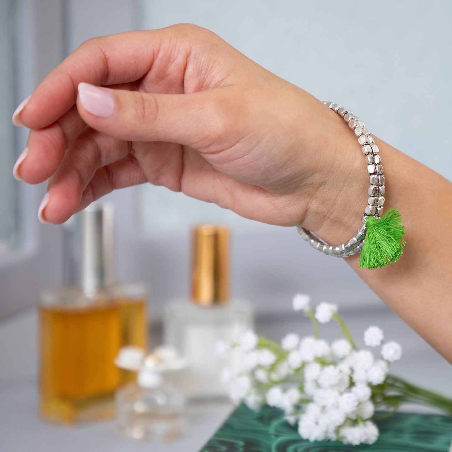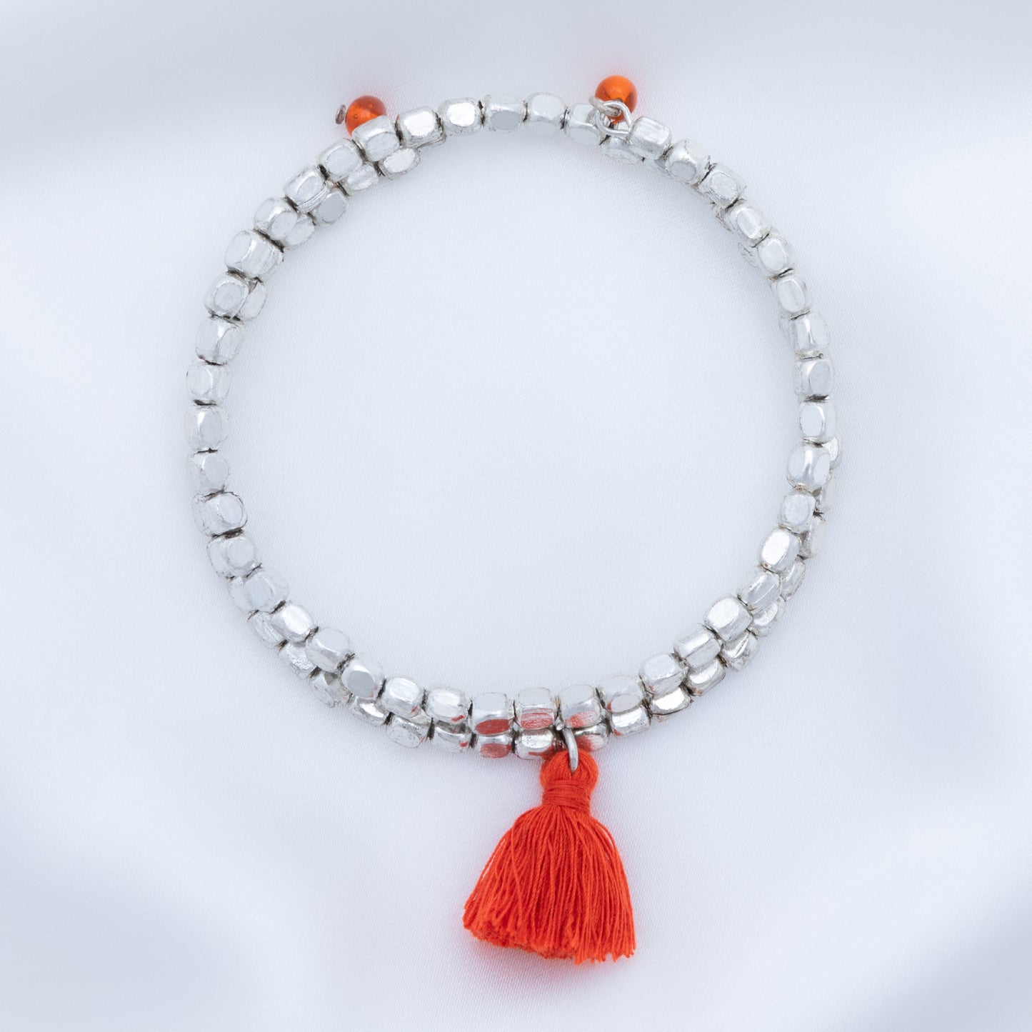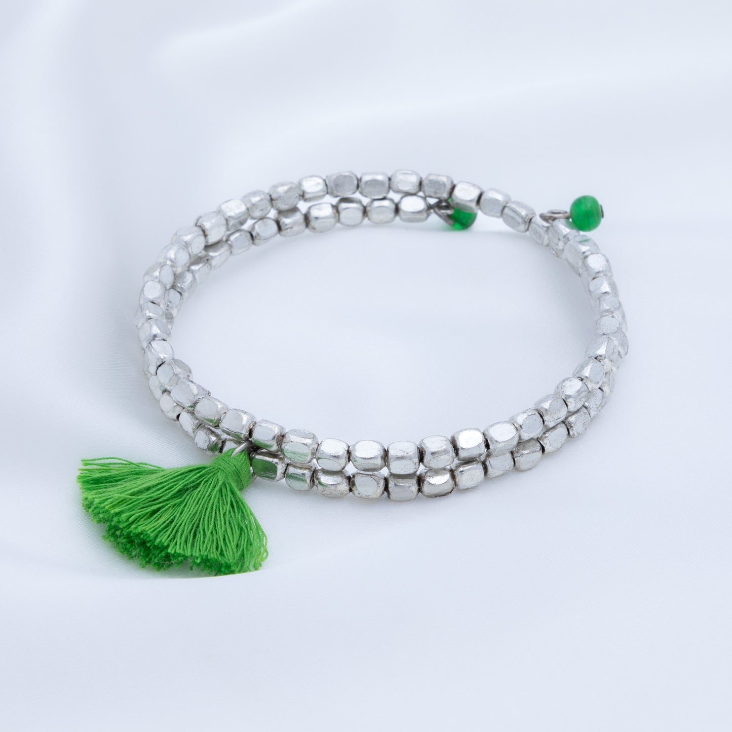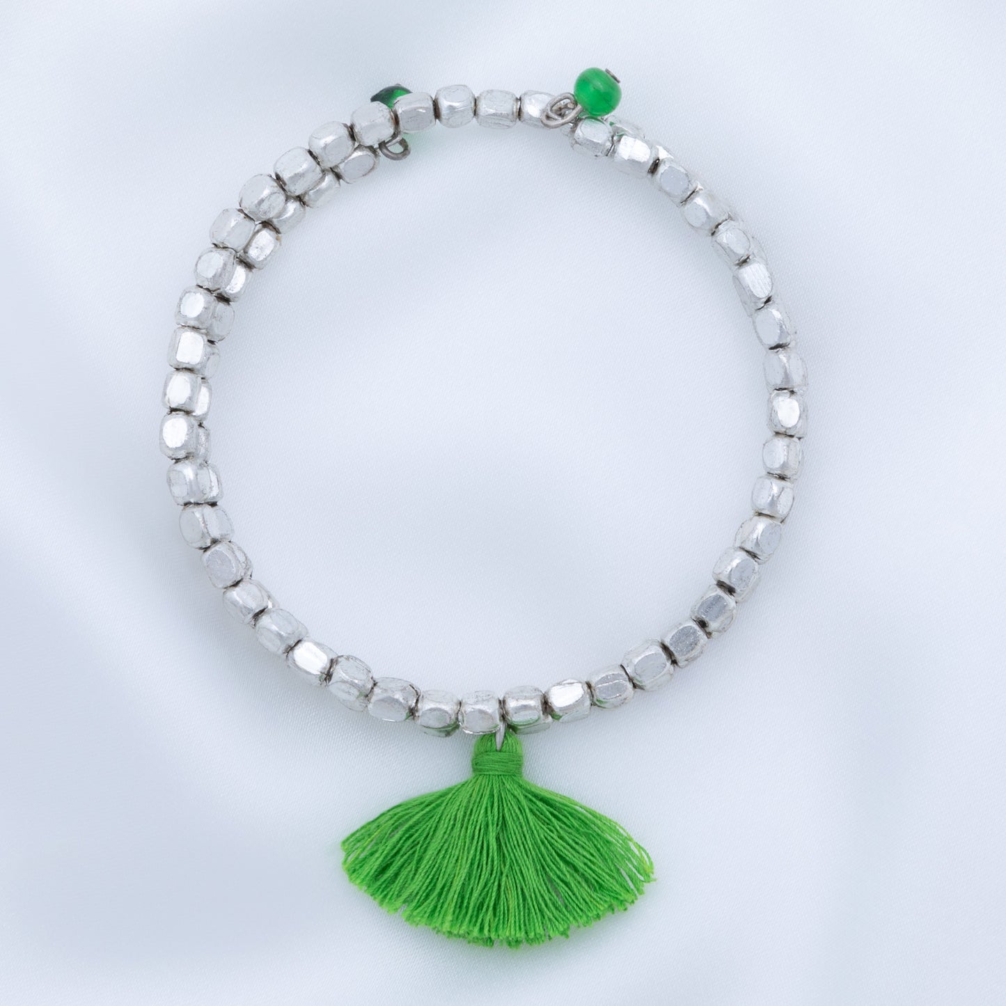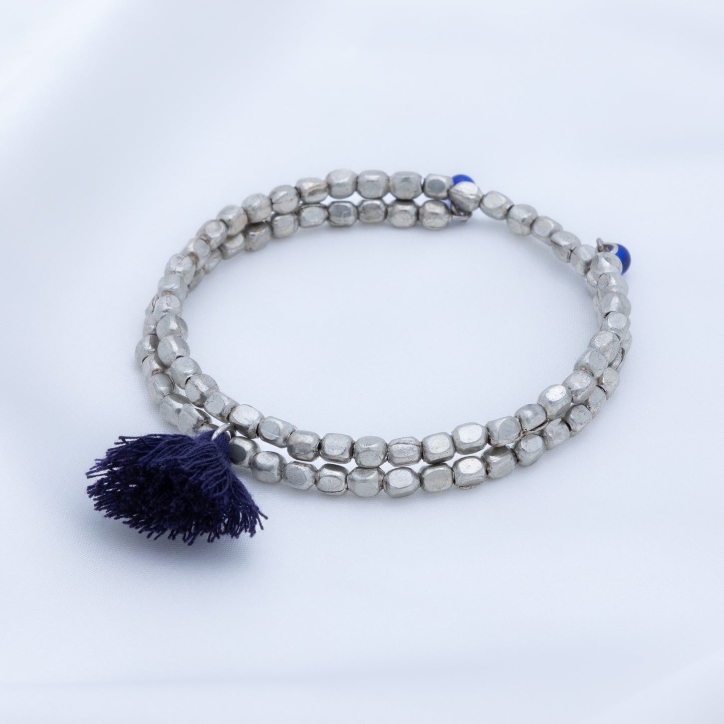 A fun bohemian style with stunning silver-plated beads and brightly colored tassel accent, these once-around wrap bracelets are perfect for stacking. Each bracelet is handcrafted by skilled women jewelry artisans at Community Friendly Movement in a village just outside of Delhi, India.