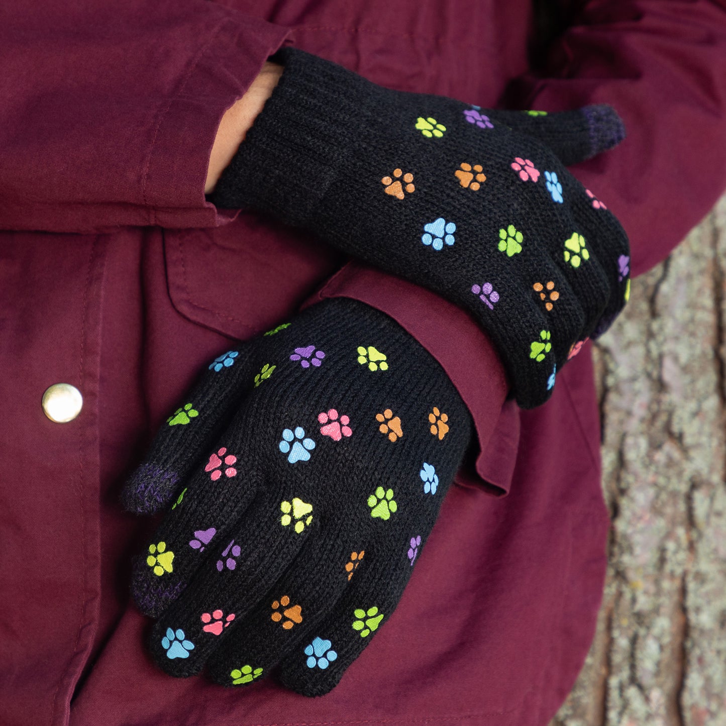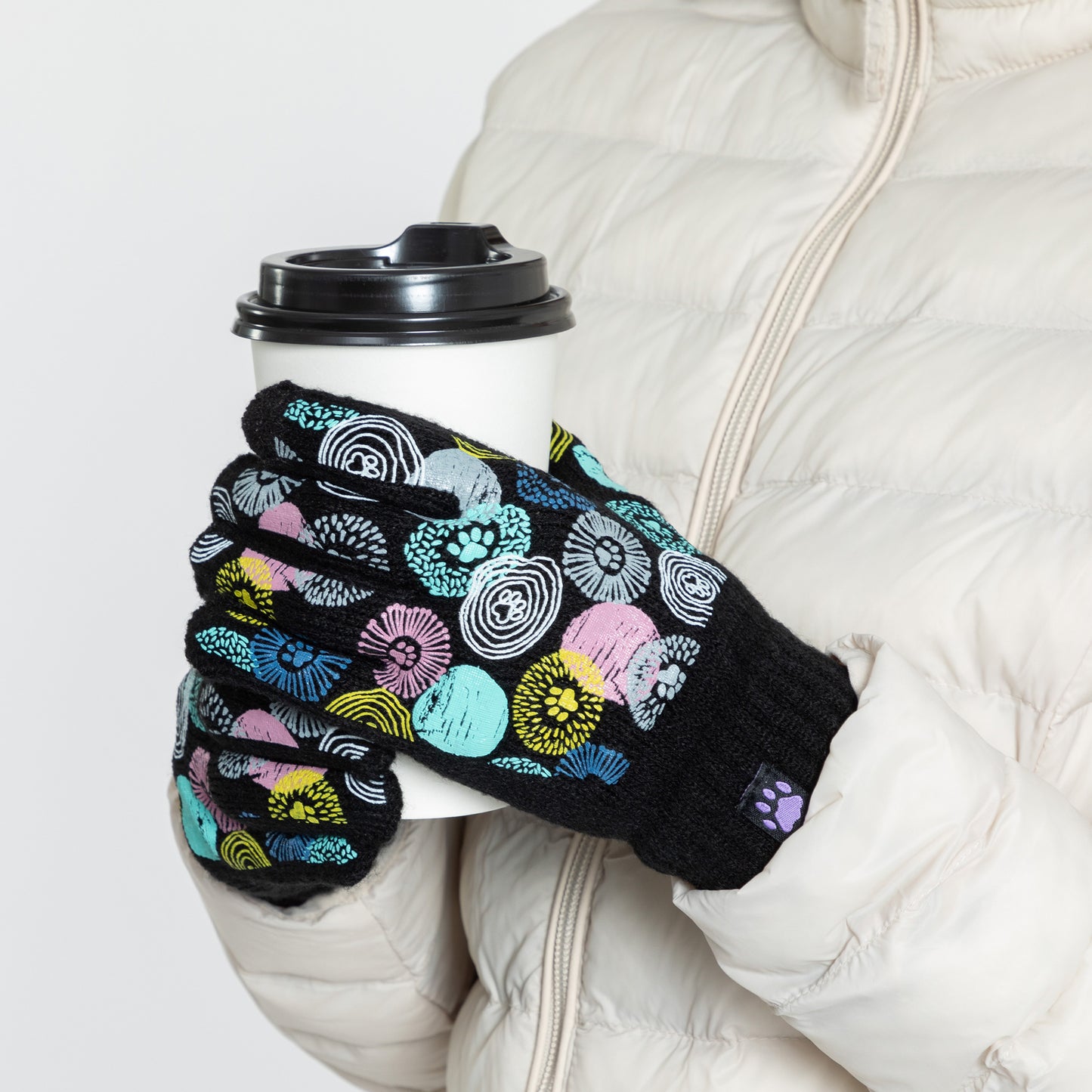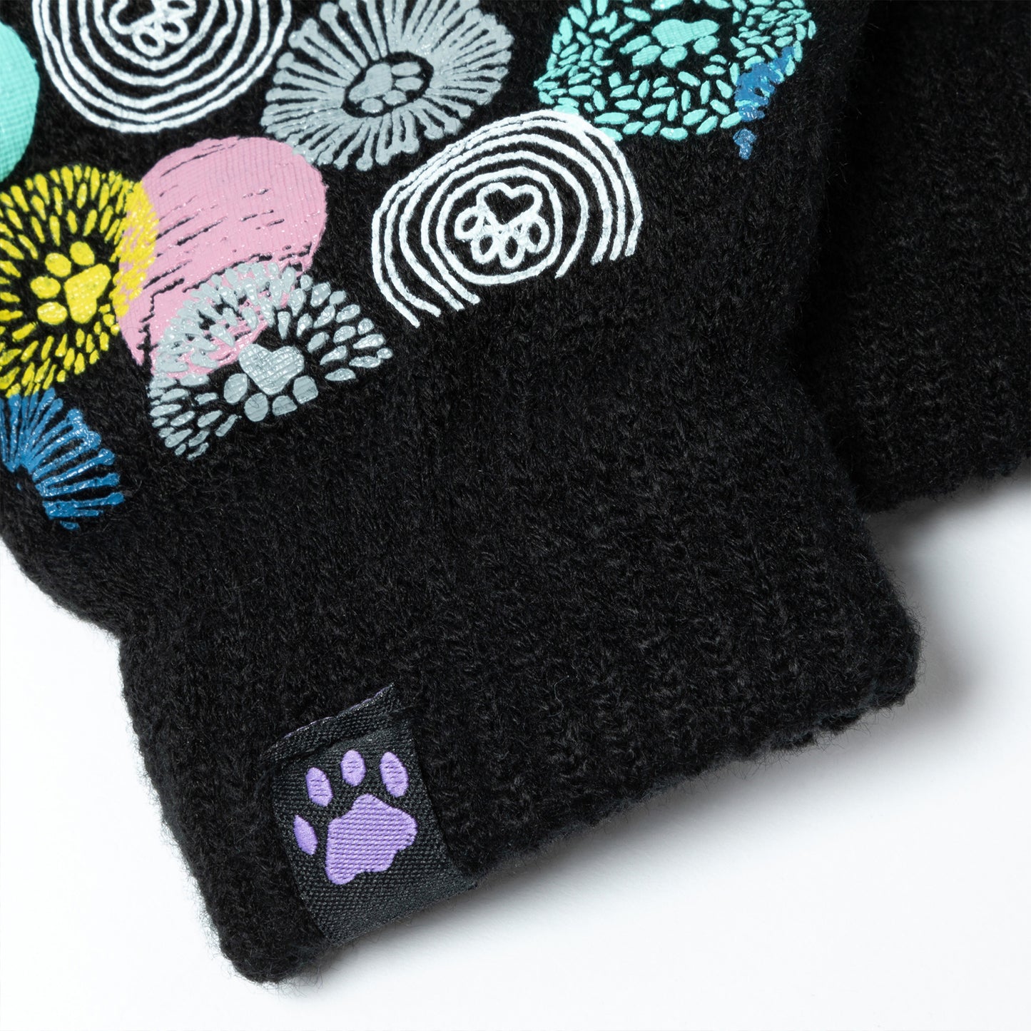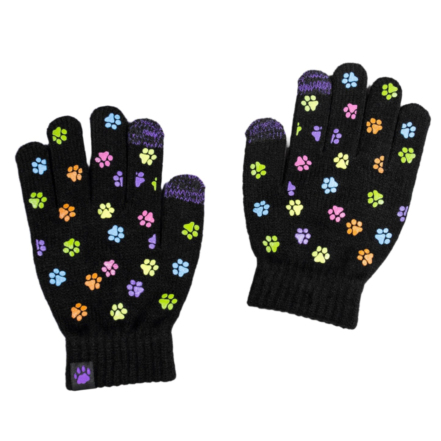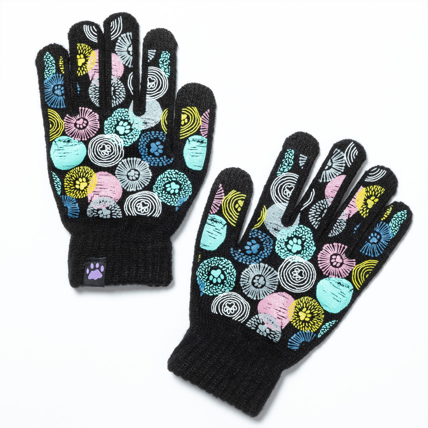 A sea of tiny colorful paw prints patterns the back of each glove, while the soft, stretchy fabric keeps the chill out in this adorably versatile pair. Featuring conductive fiber woven into the thumb and index fingertips to work with all your touchscreen gadgets, this paw printed pair boasts your support of animal causes!