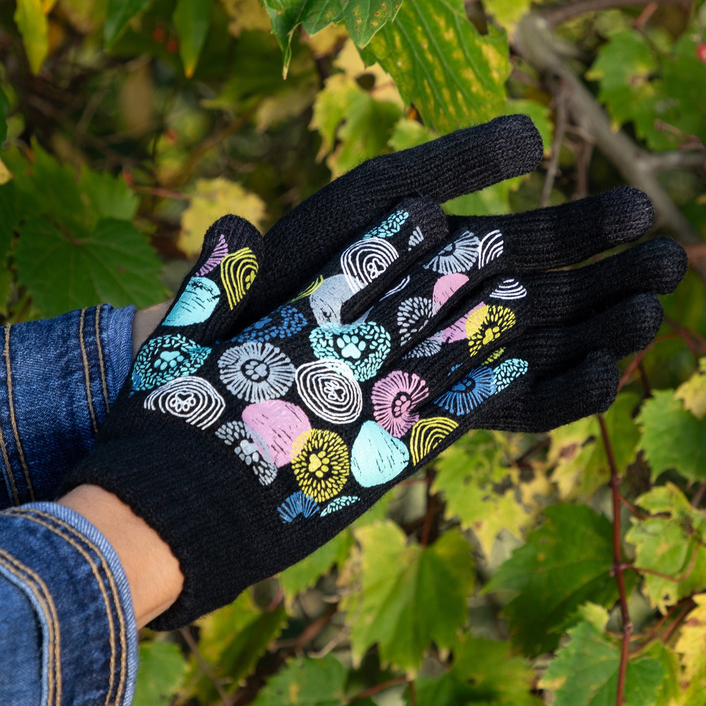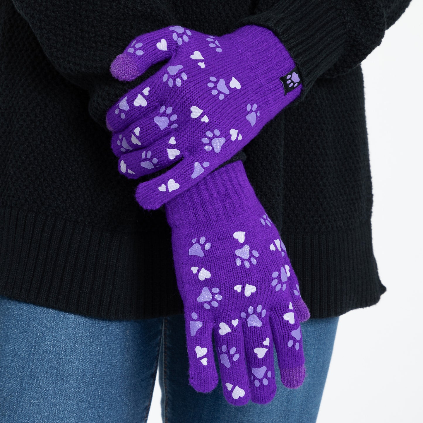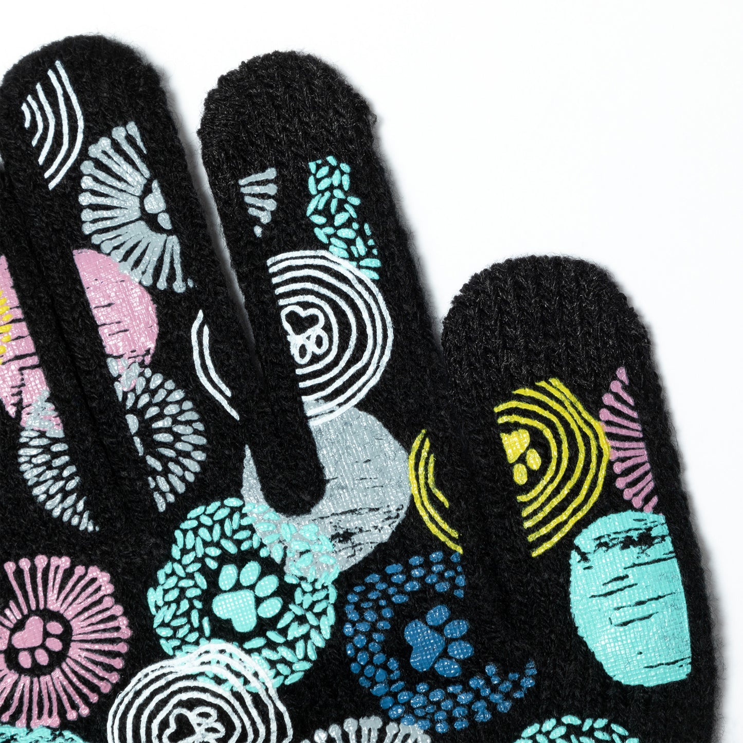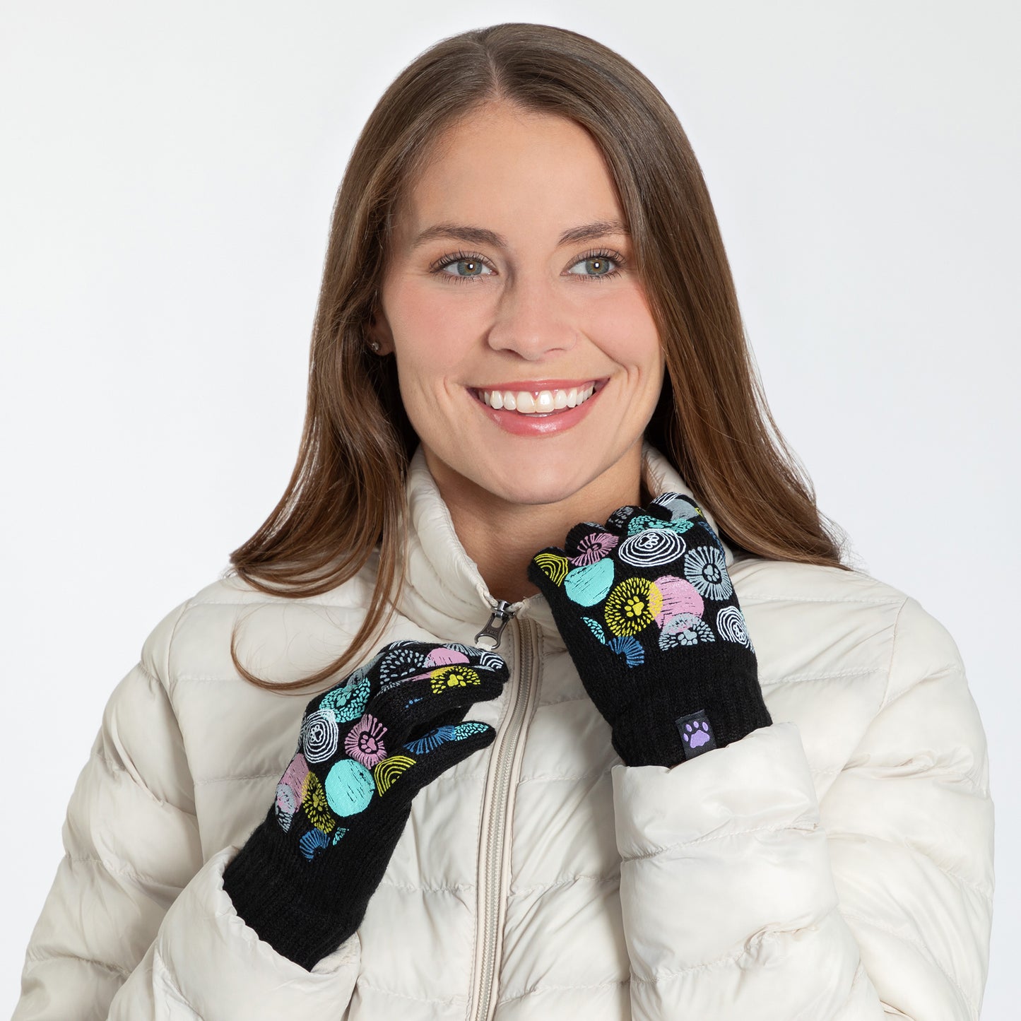 A sea of tiny colorful paw prints patterns the back of each glove, while the soft, stretchy fabric keeps the chill out in this adorably versatile pair. Featuring conductive fiber woven into the thumb and index fingertips to work with all your touchscreen gadgets, this paw printed pair boasts your support of animal causes!