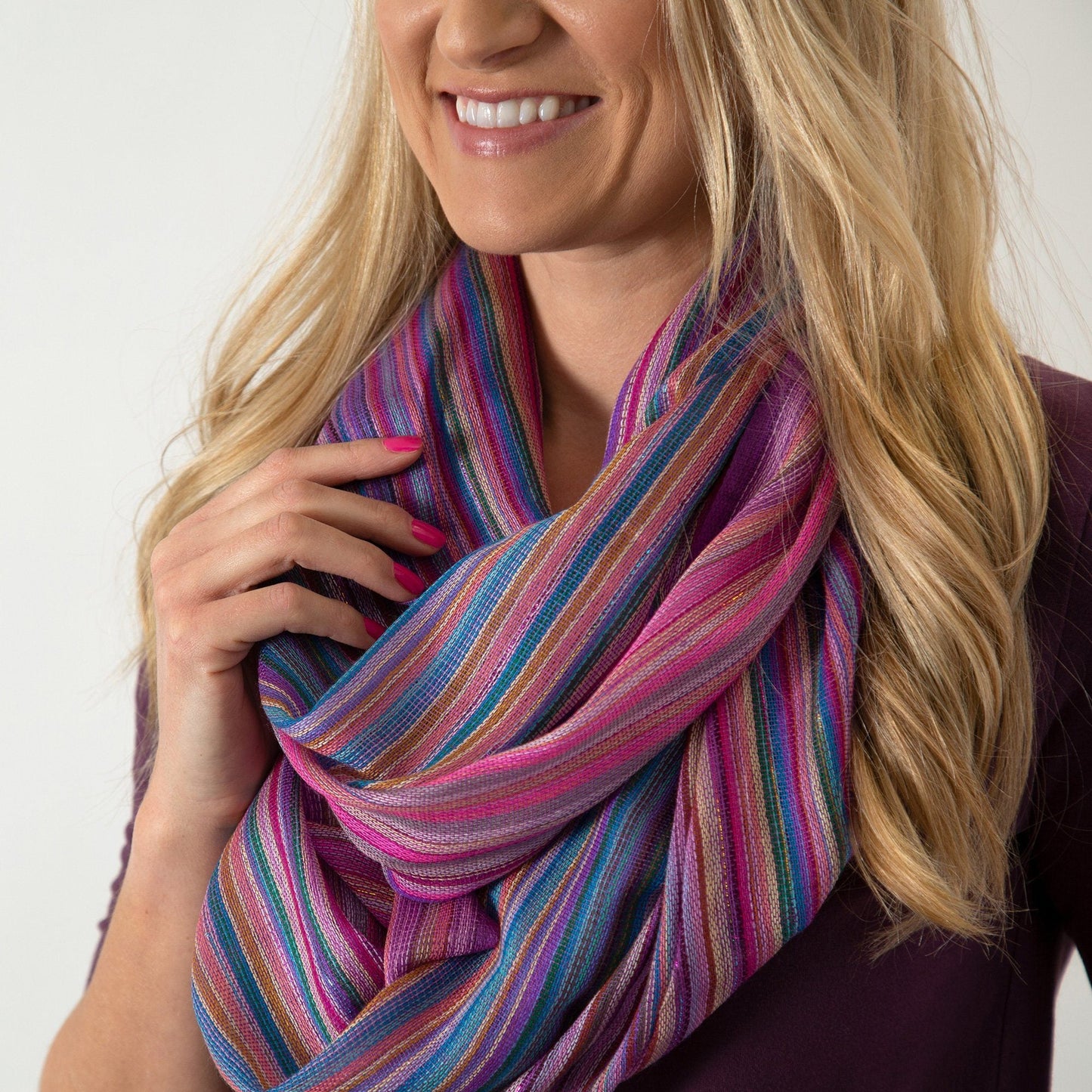 Why settle for subtle when you can accessorize and keep warm with the brilliant color of a hand-loomed scarf from Ecuador? Individually handmade by a women's cooperative and graced with eye-catching metallic thread accents, this scarf is a great way to improve the lives of artisan weavers and look fabulous while you do it!