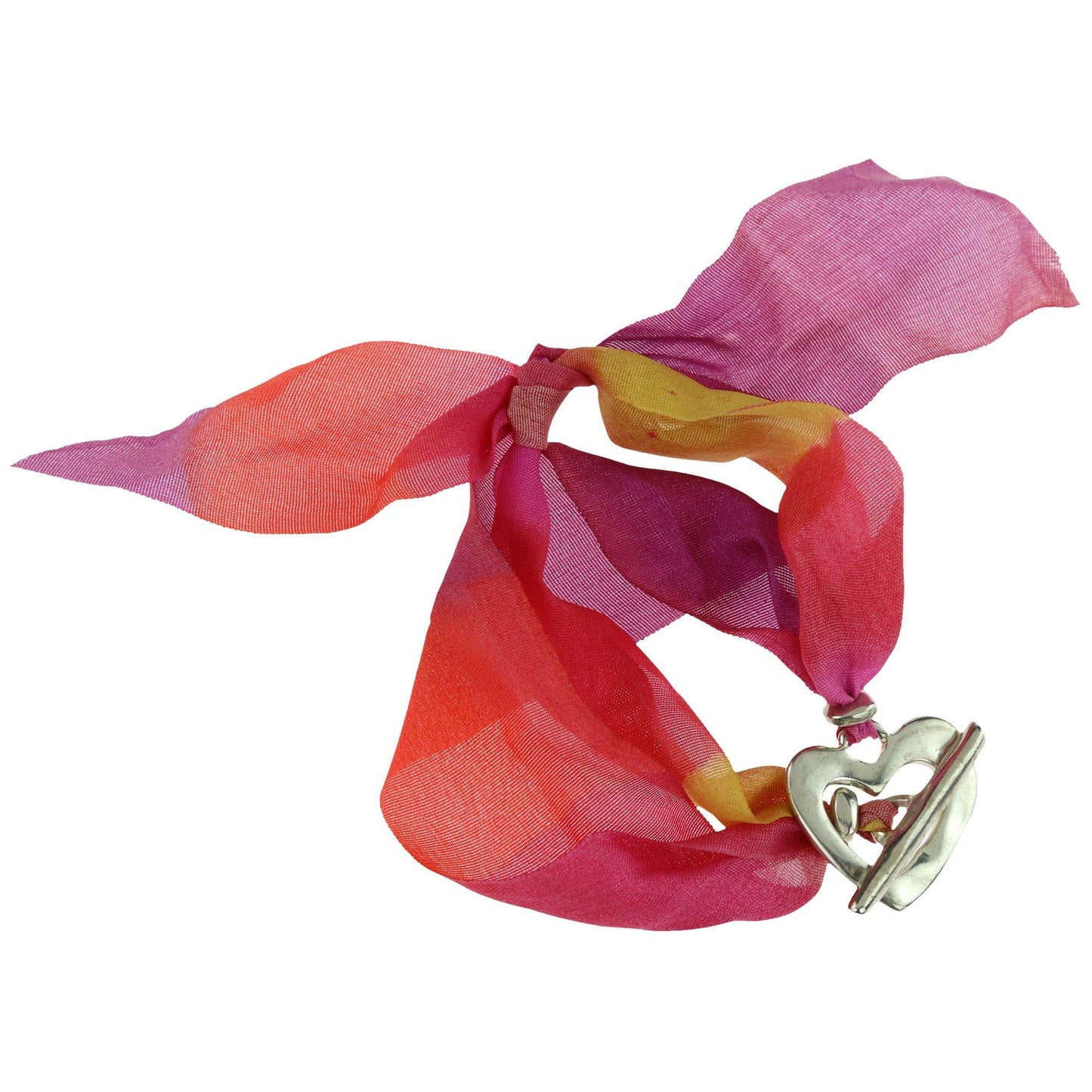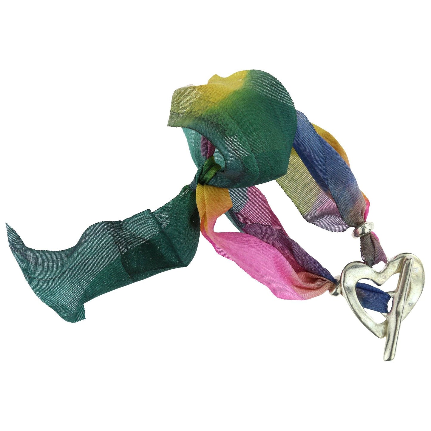 Wear your heart on your sleeve -- or near it -- on this colorful silk ribbon bracelet with a heart charm that serves as a toggle closure. When you do, you'll be making a difference in the life of an underprivileged woman in South Africa. Make a knot once in the large hand-painted silk ribbon to adjust size to your wrist and then open with a toggle and bar.