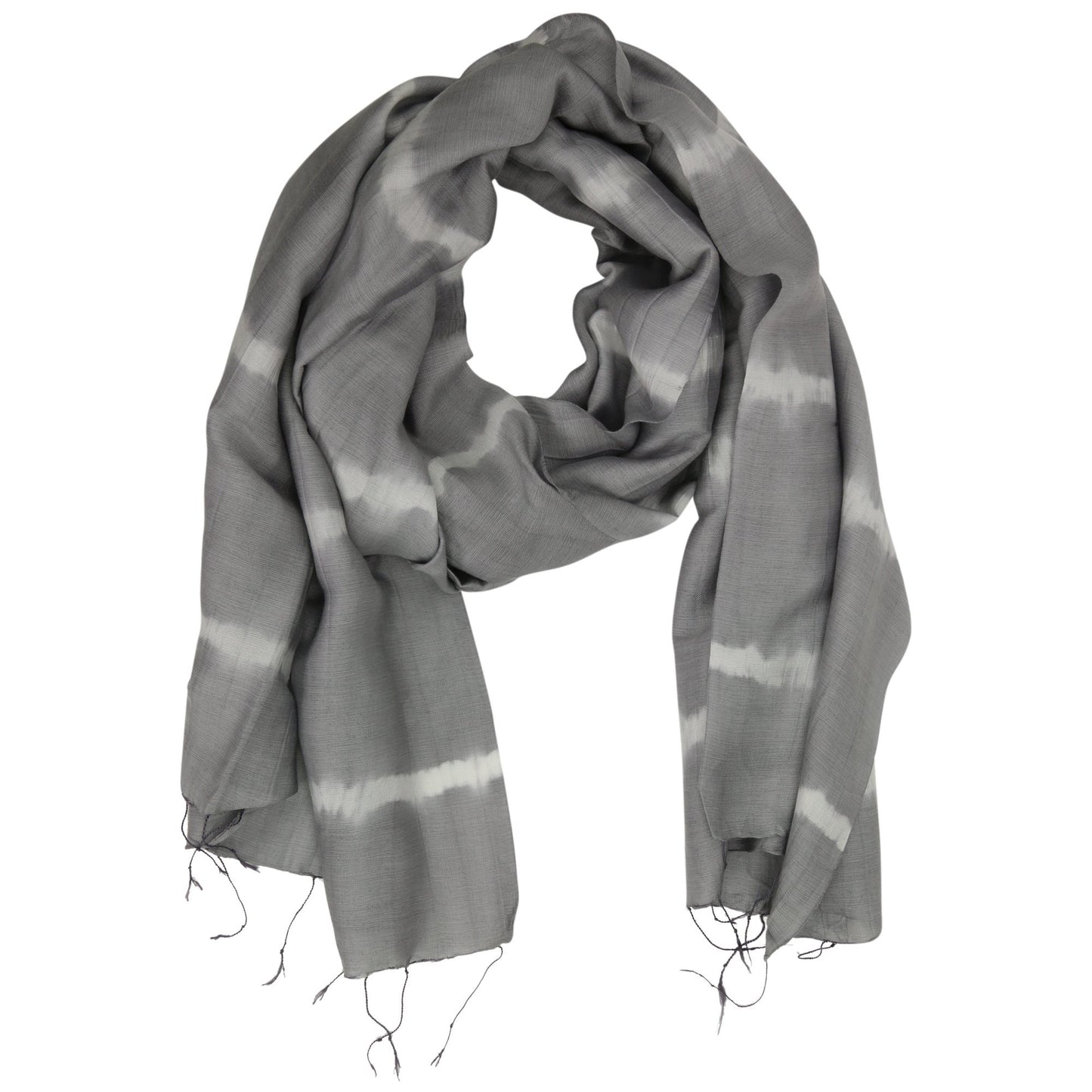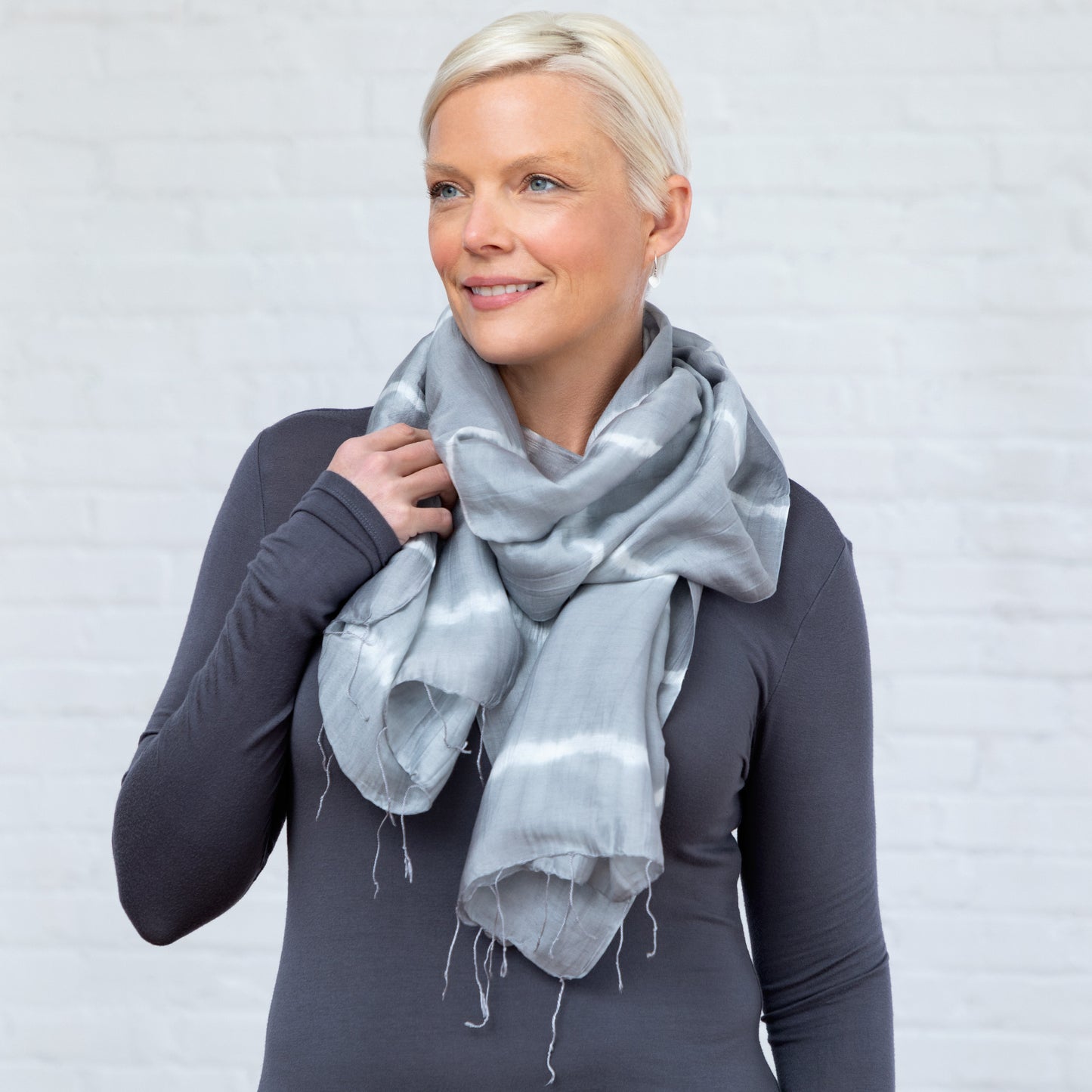 Get on a fair trade wavelength! This beautiful silk and cotton-blend scarf is handwoven and dyed to get a beautiful white wave running through its deep, rich base color.