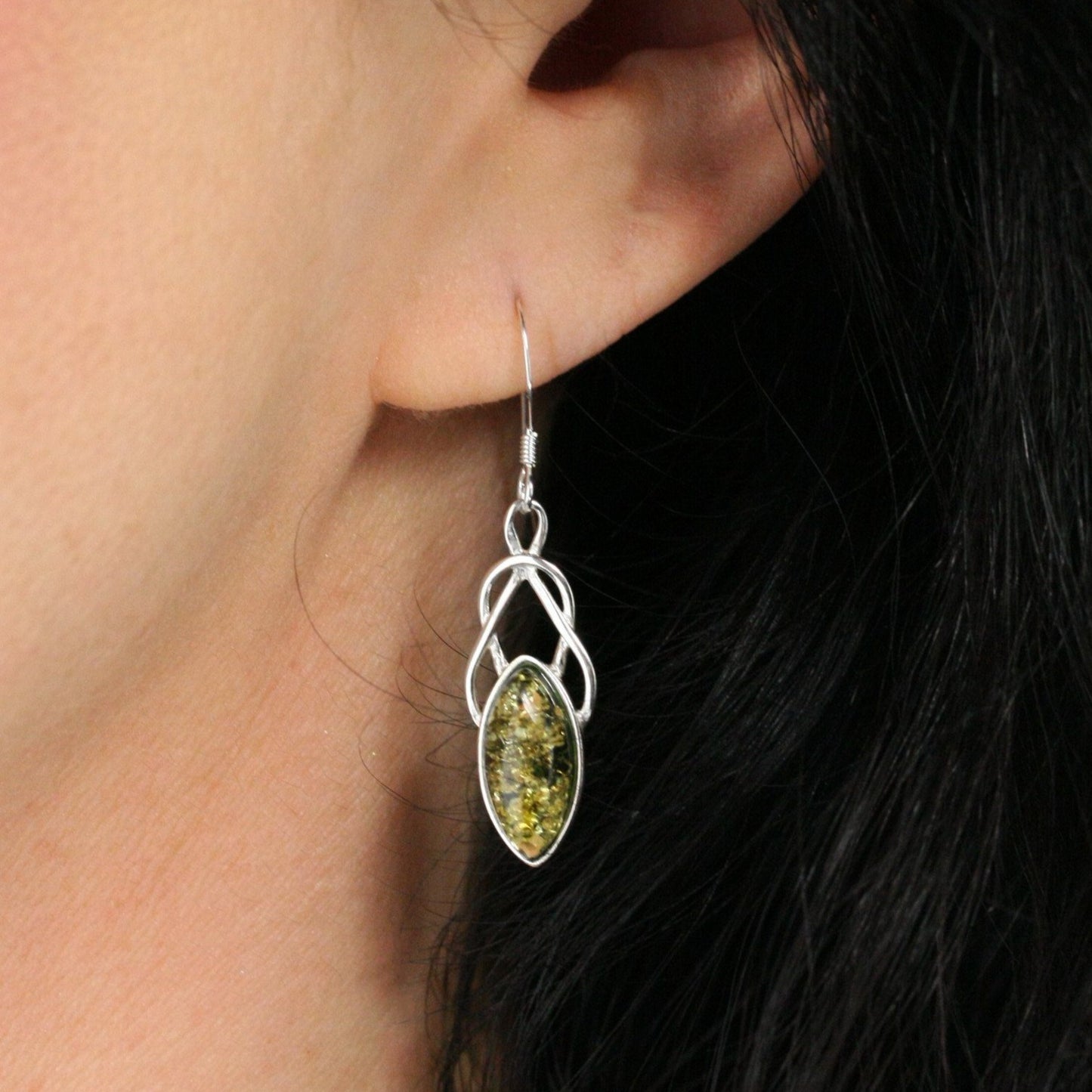 Add the earthly beauty of green amber to your ensemble with a pair of Celtic-inspired earrings straight from the land of Faerie. The natural stone can vary in depth of color like the budding leaves of a tree, from light green with yellow undertones to dark, hunter green.
